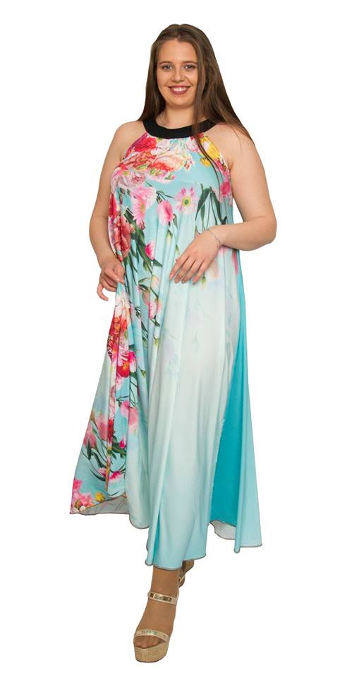 Кройката на този модел лятна рокля е без ръкави и с обло деколте.