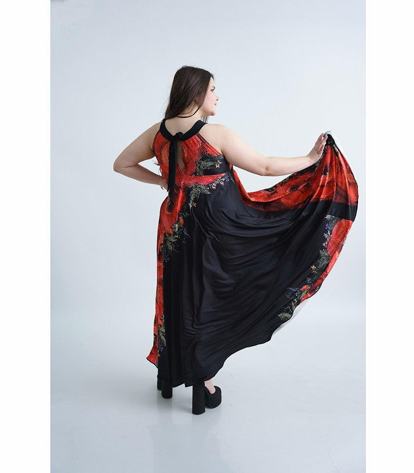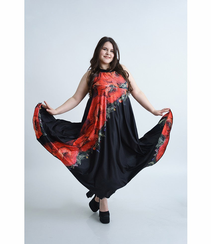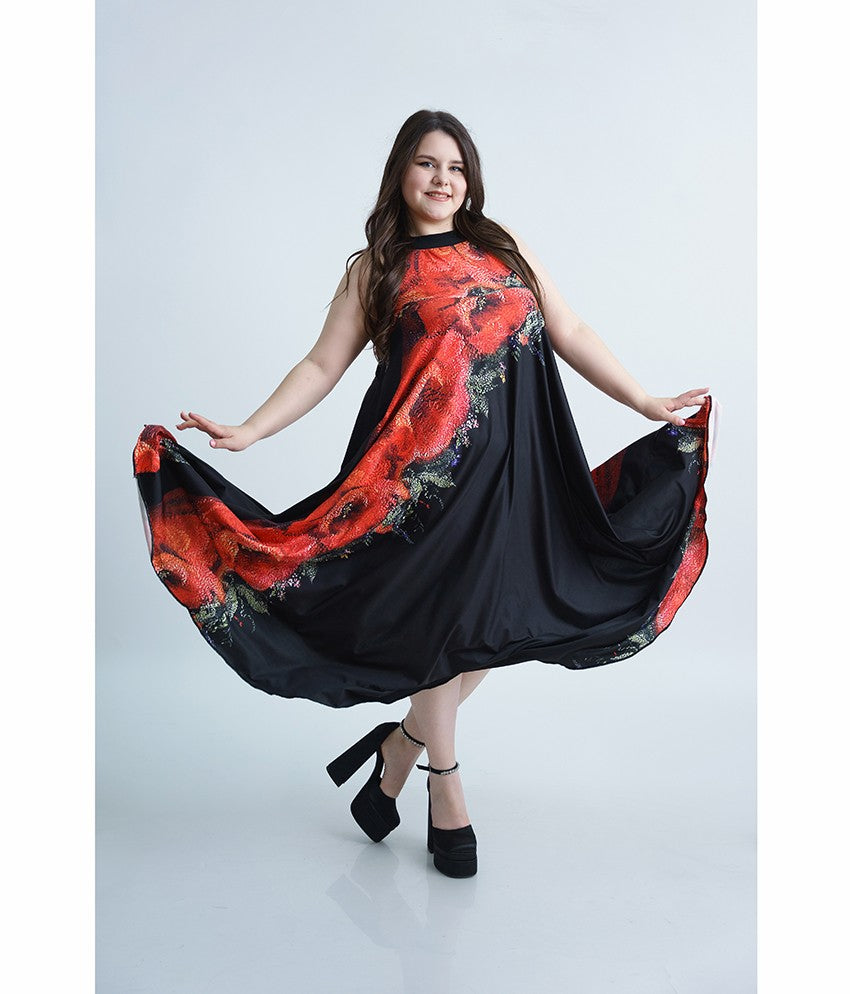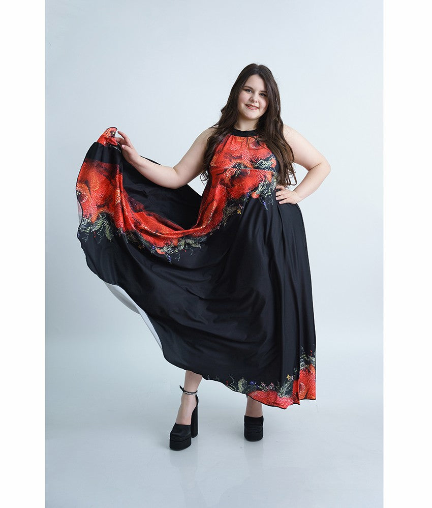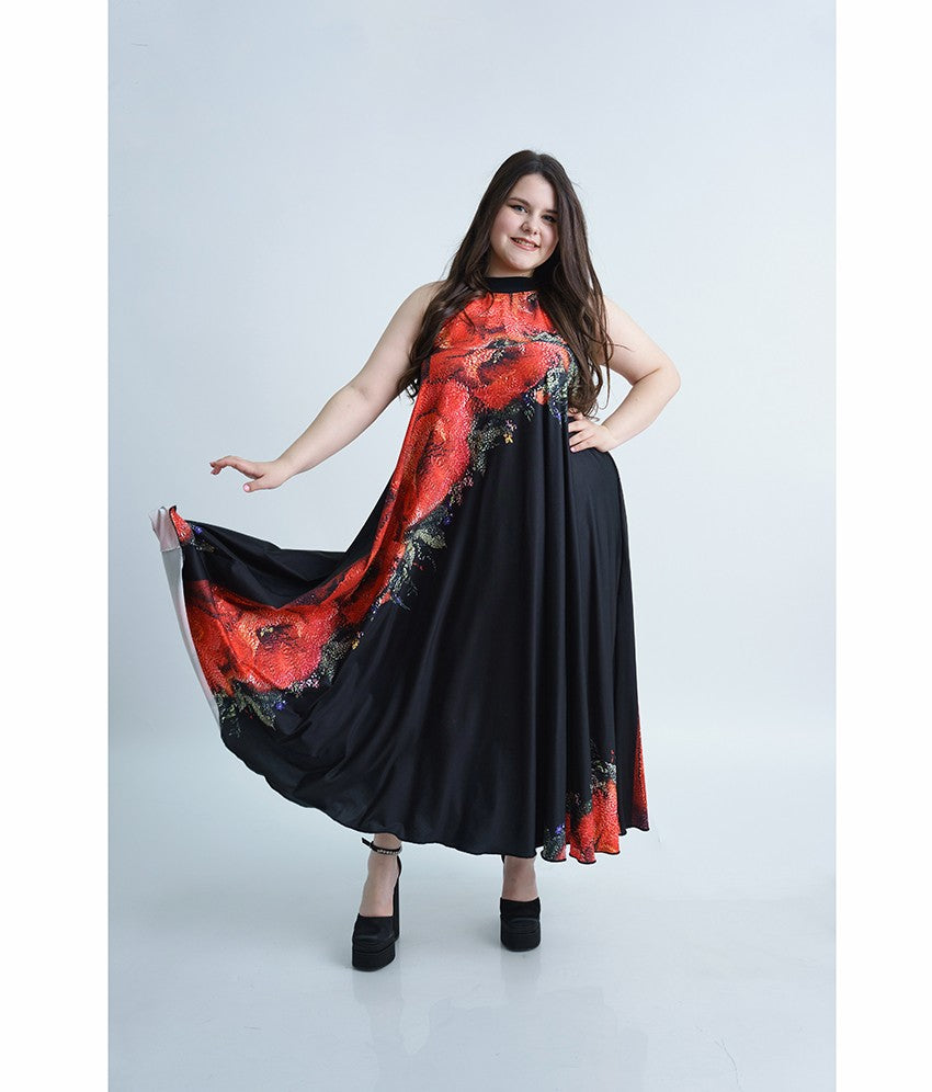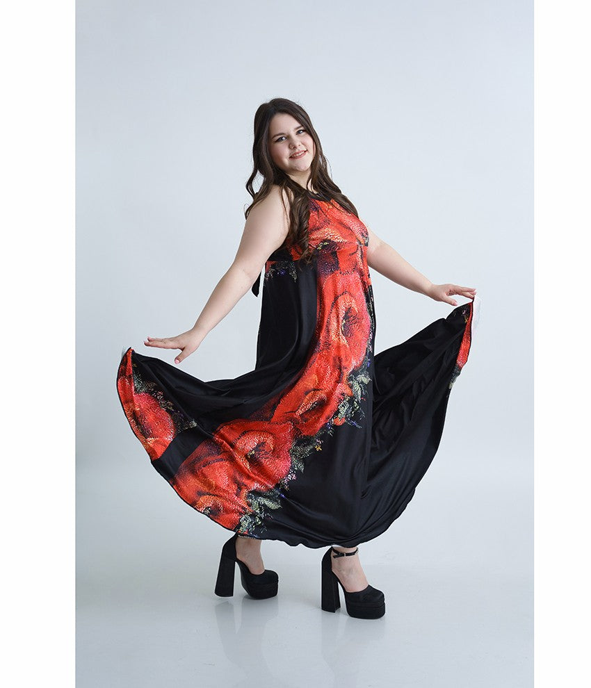 Дълга лятна рокля Евелине. Дълга черна рокля украсена с големи червени цветя. Рокля без ръкави със завързване на врата. Разкроена рокля падаща свободно по тялото. Еластична материя.