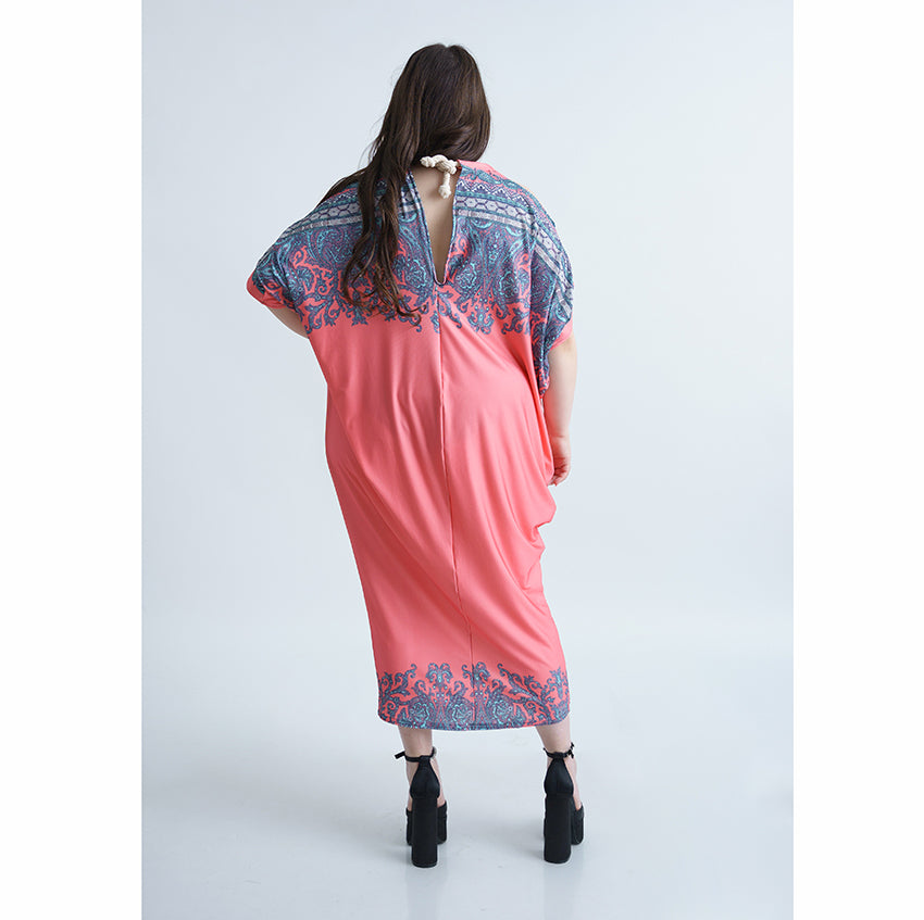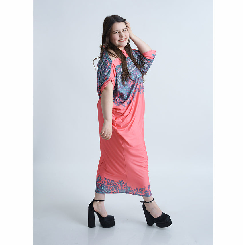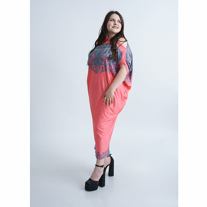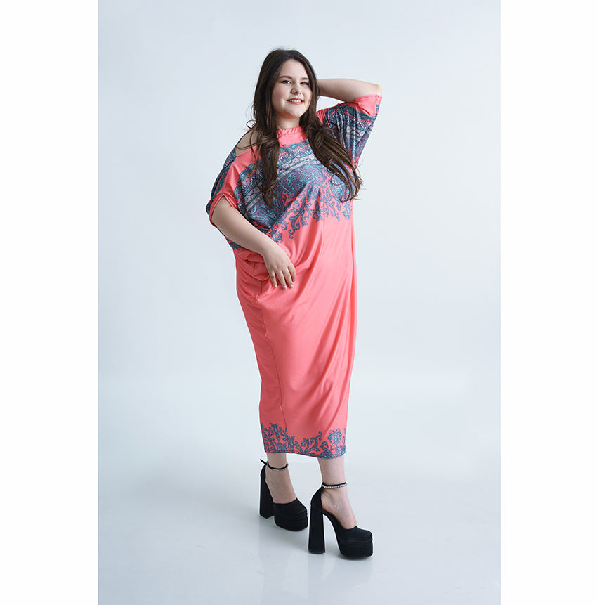 Дълга лятна рокля Креола. Модел с прилеп ръкави. С голи рамене. Десен с орнаменти на бюста и в най-долната част. С връзка на врата.