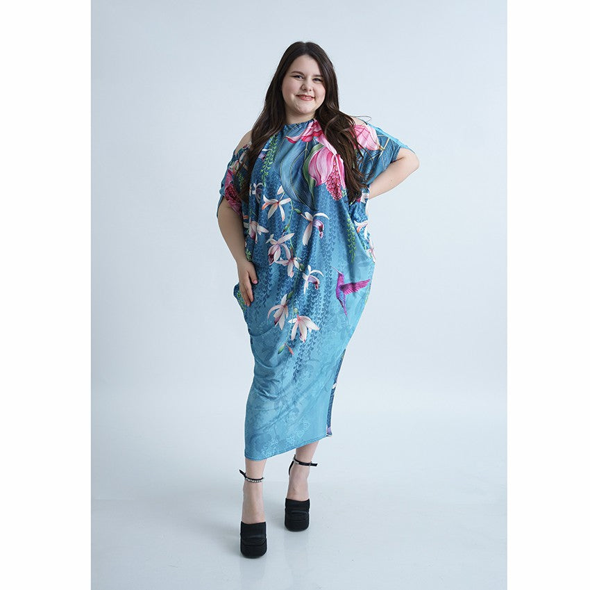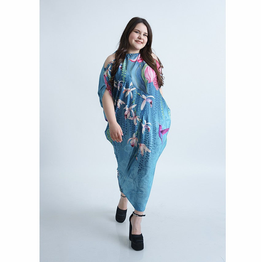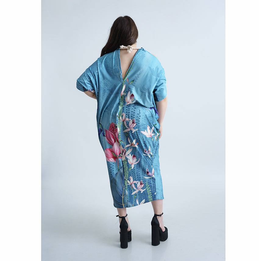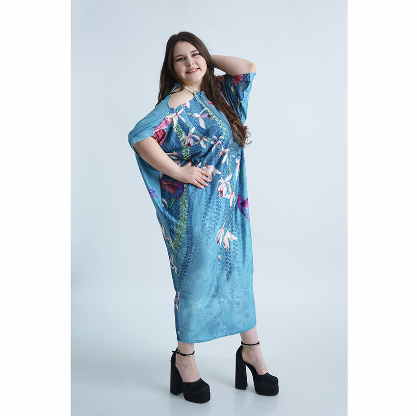 Дълга лятна рокля Магнолия. Кройка с прилеп ръкави с голи рамене. С връзка на врата. Десен в синьо на цветя. Стеснена по дължината.