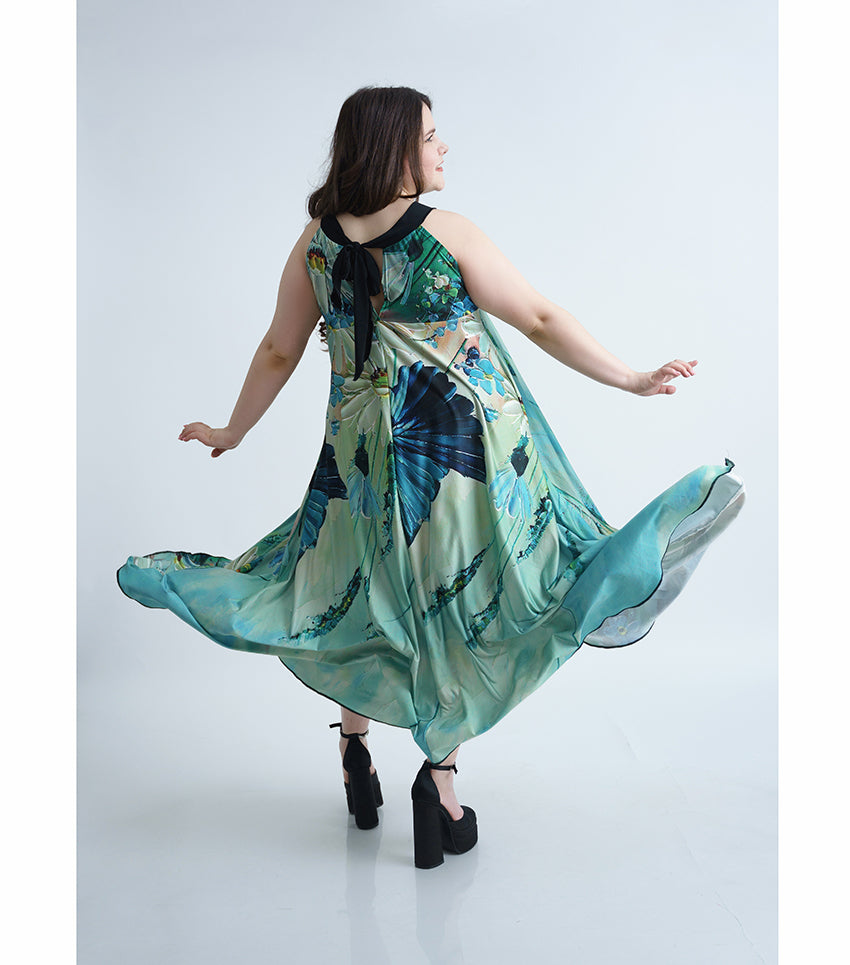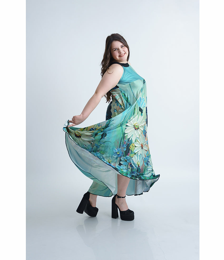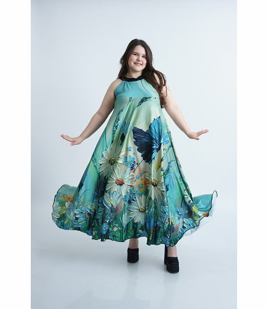 Дълга лятна рокля Марбел. Модел без ръкави. Разкроена по дължината. Десен в нежен ментов цвят, украсен с цветя и пеперуди.
