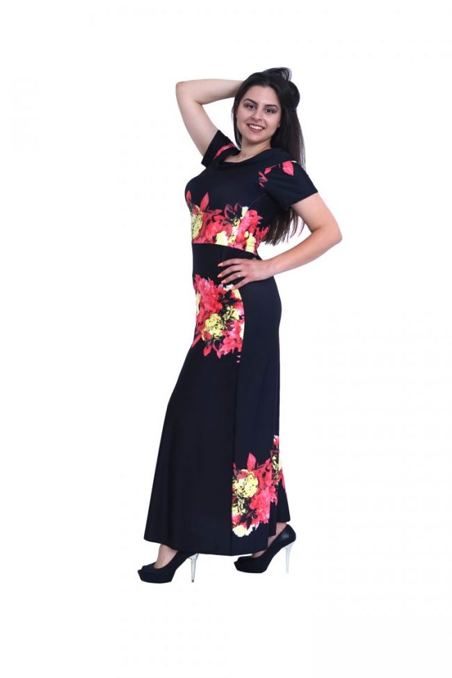 Дълга лятна рокля Теменуга в красив десен в черен цвят, украсен с цветни мотиви.