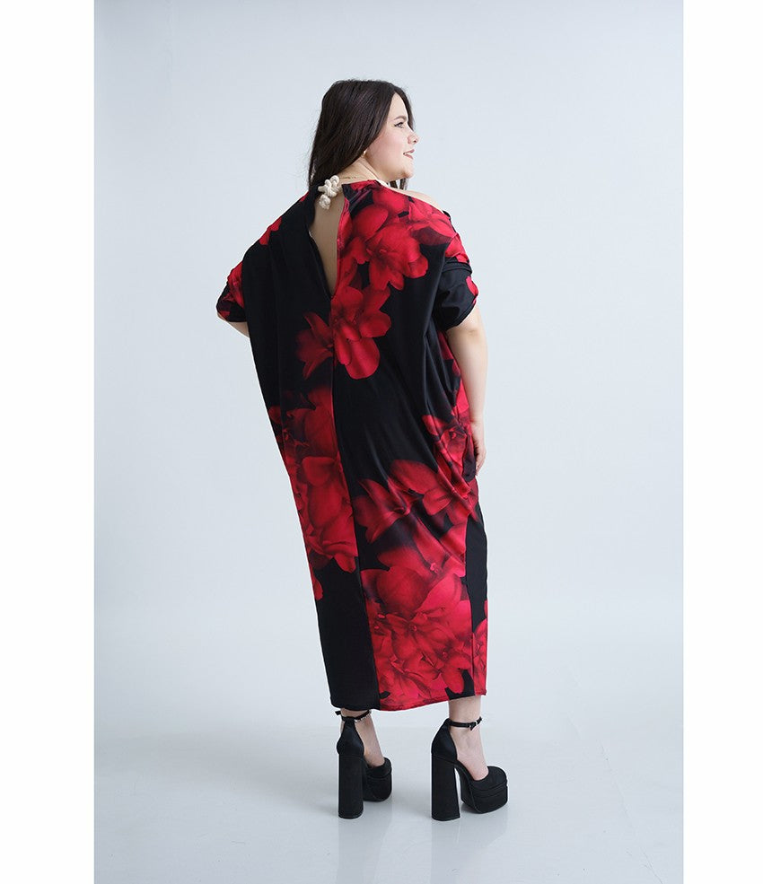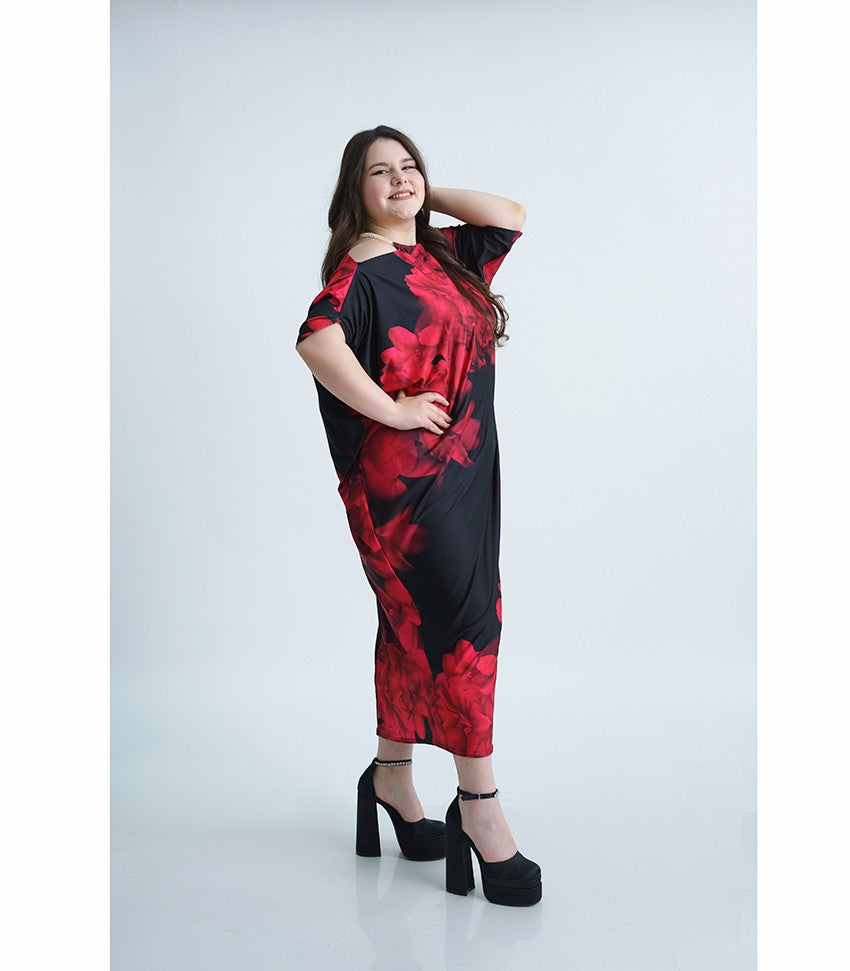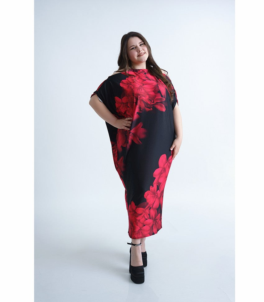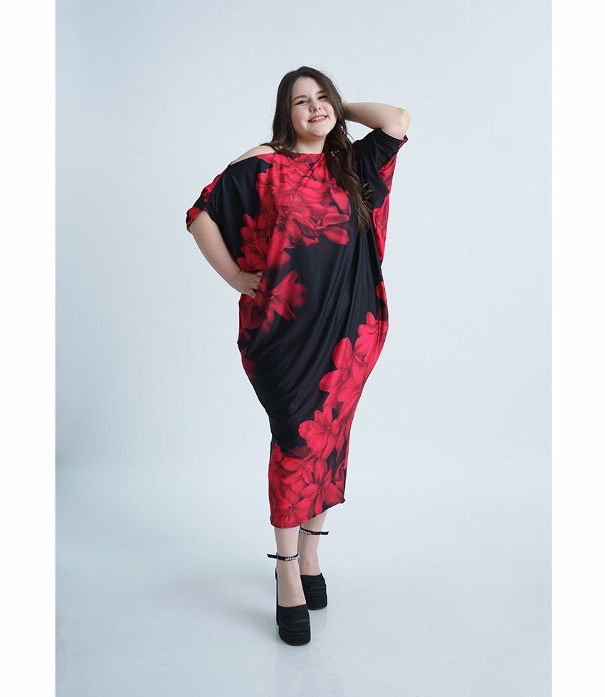 Дълга лятна рокля Шарън. Модел с прилеп ръкави. Стилен десен в черно и малиново на цветя. Кройка с голи рамене.
