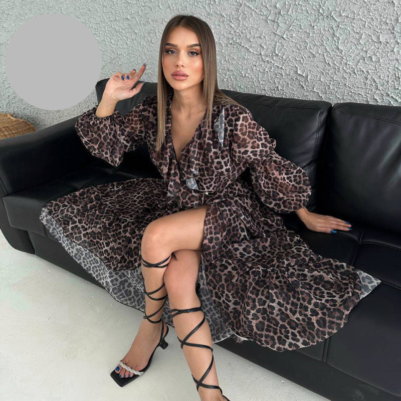 Дълга леопардова рокля от шифон NPA-8057. Деколте “прегърни ме”. Скрит страничен цип. С коланче и ластик на талията. Опакована в луксозна подаръчна кутия.