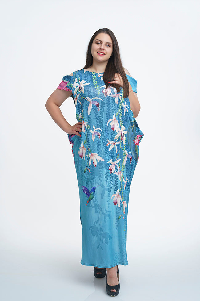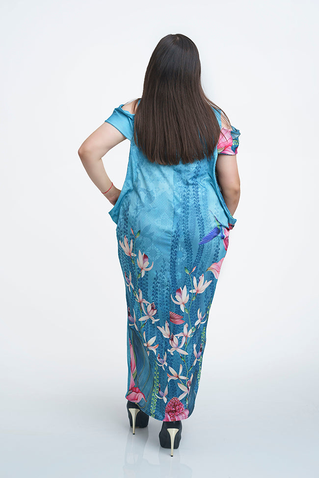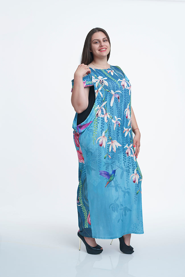 Дълга права синя рокля Клара.Моделът е с права кройка украсен с красив цветен принт.Еластична приятна на допир материя.