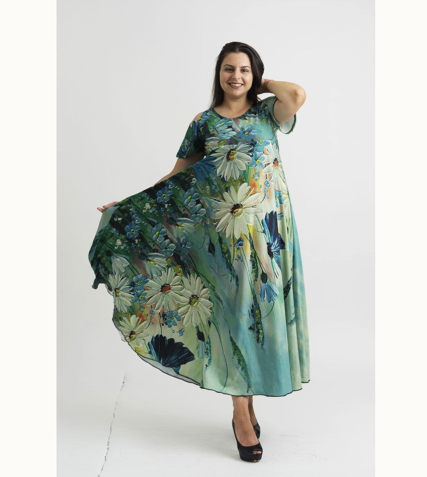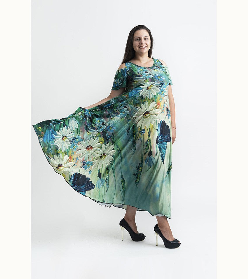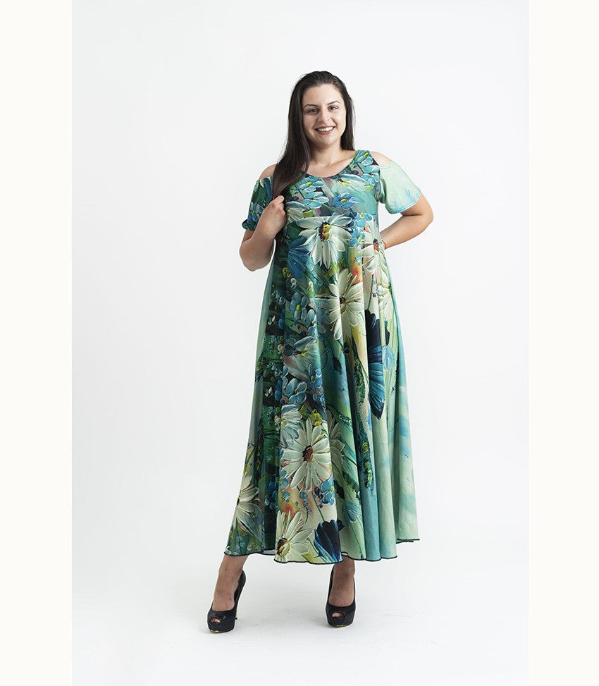 Дълга рокля с къс ръкав Елиф. Зелена рокля с къс ръкав разкроена по дължината. Еластична материя.
