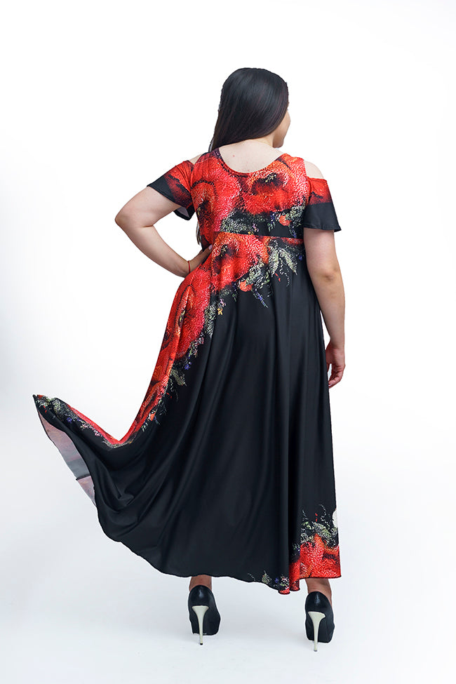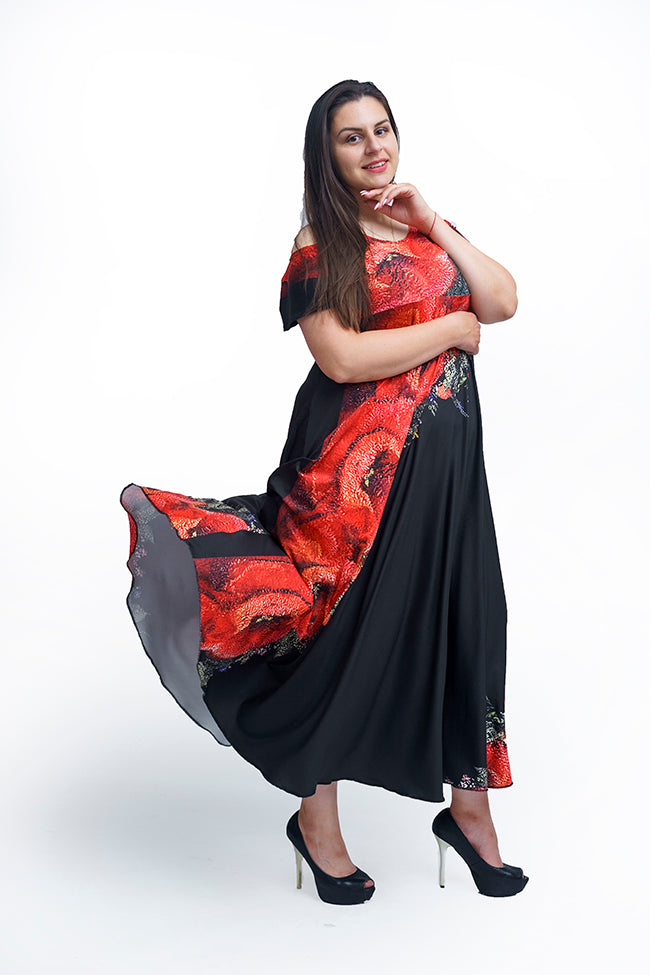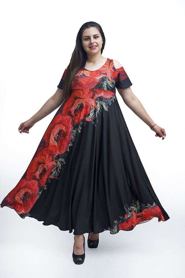 Дълга рокля с къс ръкав Моника.Разкроена черна рокля с къс ръкав и обло деколте.Украсена с принт от големи червени макове.