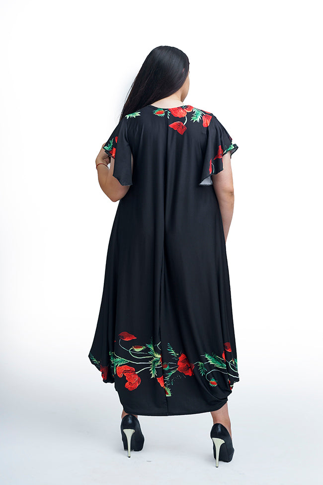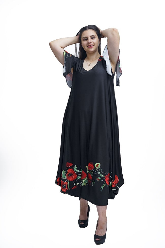 Дълга рокля с къс ръкав Поля.Красива черна рокля с къс ръкав и обло деколте.Свободна разкроена рокля от трико.