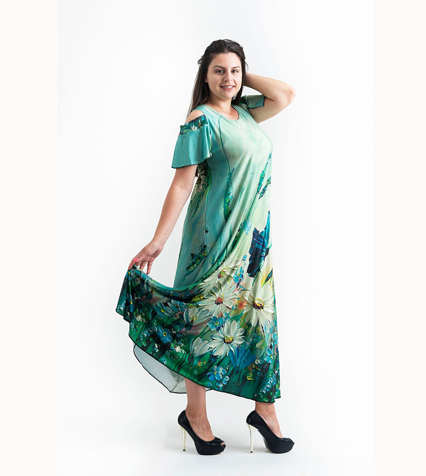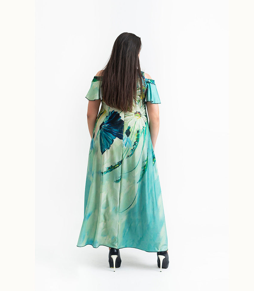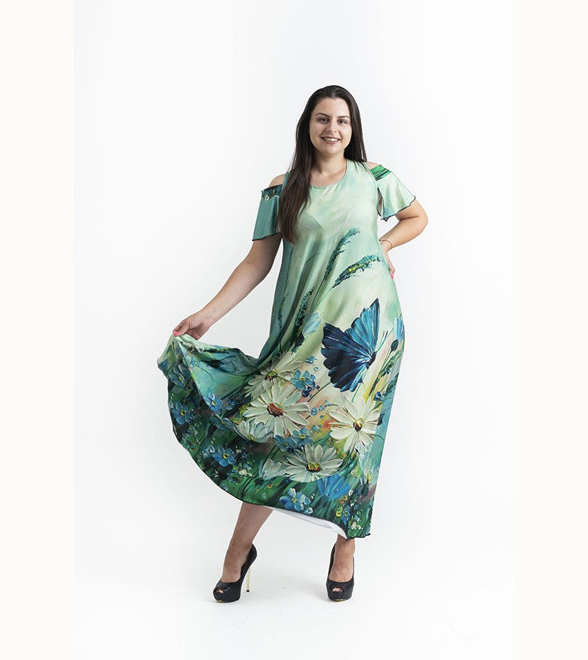 Дълга рокля с къси ръкави Соня. Красива зелена рокля от еластична материя украсена с цветя и пеперуди.