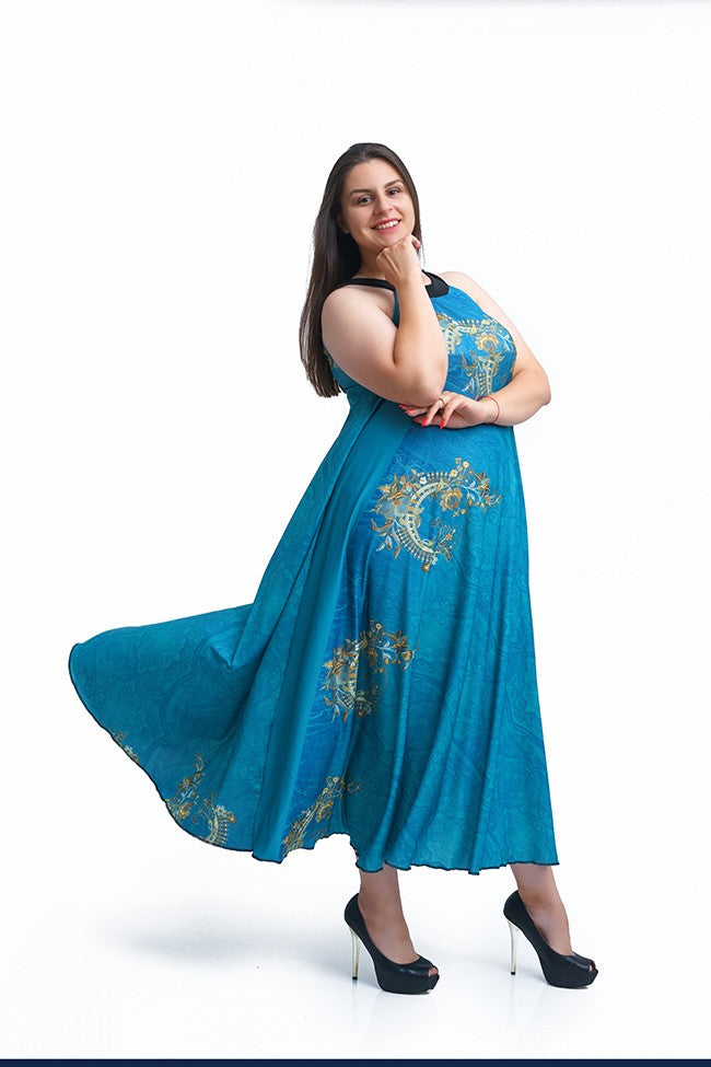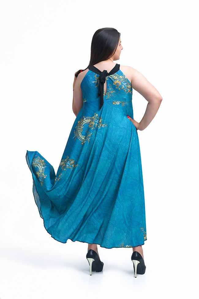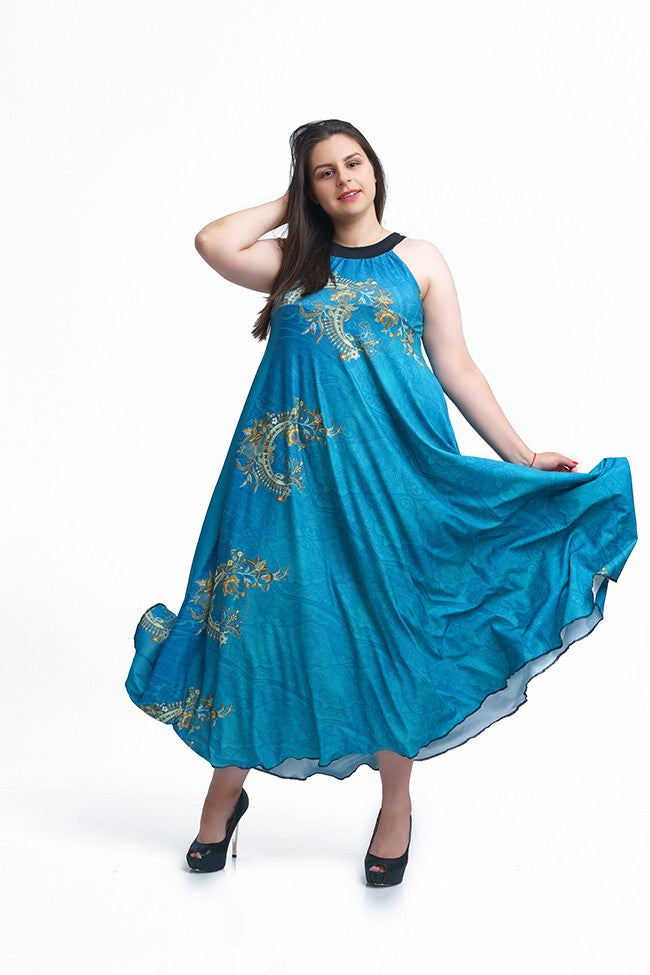 Дълга рокля в петролен цвят Ралица. Много ефектна и оригинална разкроена рокля в петролен цвят.С красиви кръгли орнаменти отстрани.