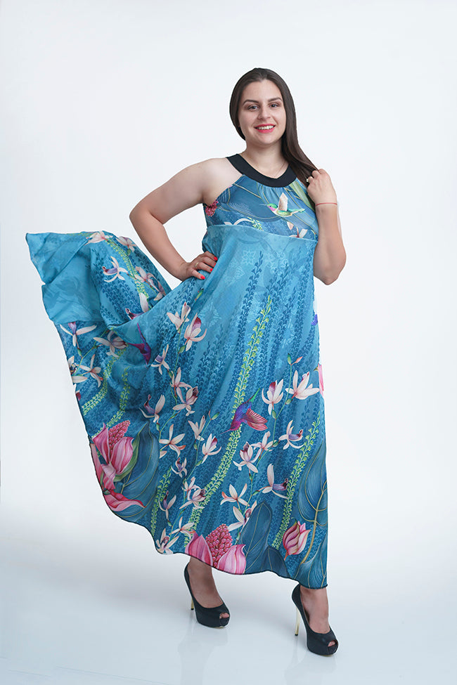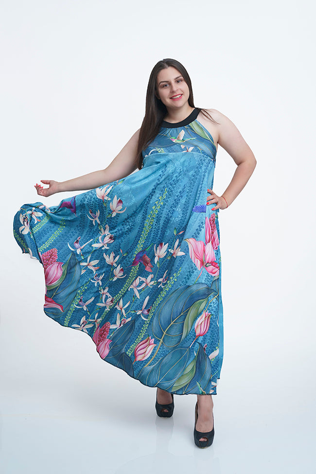 Дълга синя разкроена рокля Шаная.Красив модел украсен с цветен принт.Синя рокля падаща свободно по тялото.