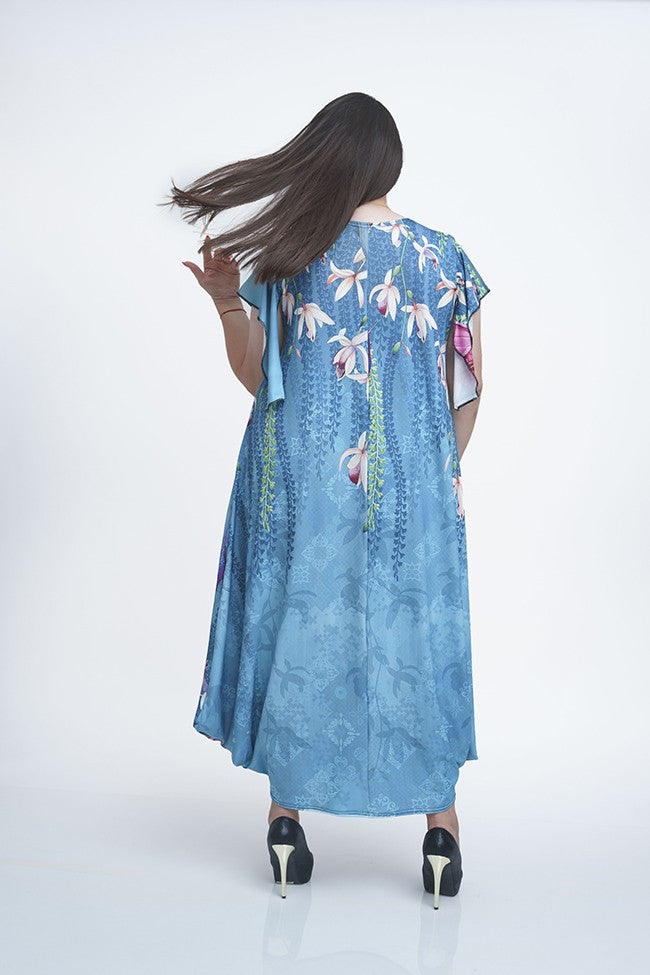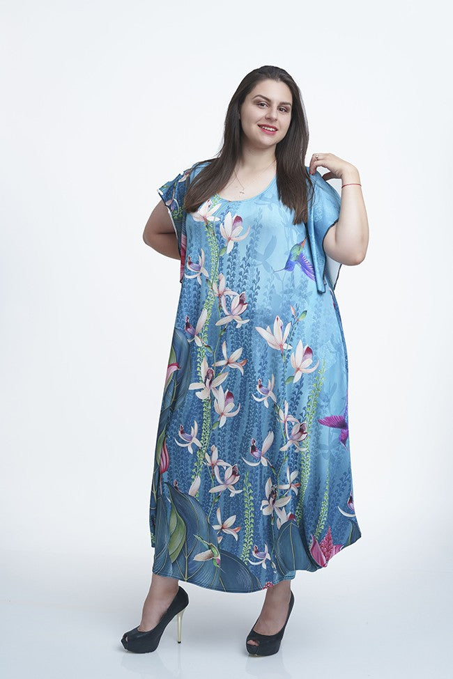 Дълга синя рокля с къс ръкав Фиона.Елегантна дълга синя рокля с къс ръкав.Пада свободно по дължината. Украсена е с красиви цветя.Има обло деколте и е дълга до глезена.