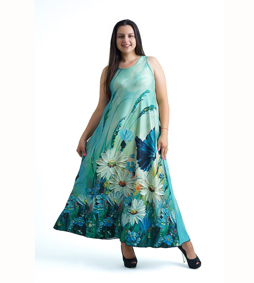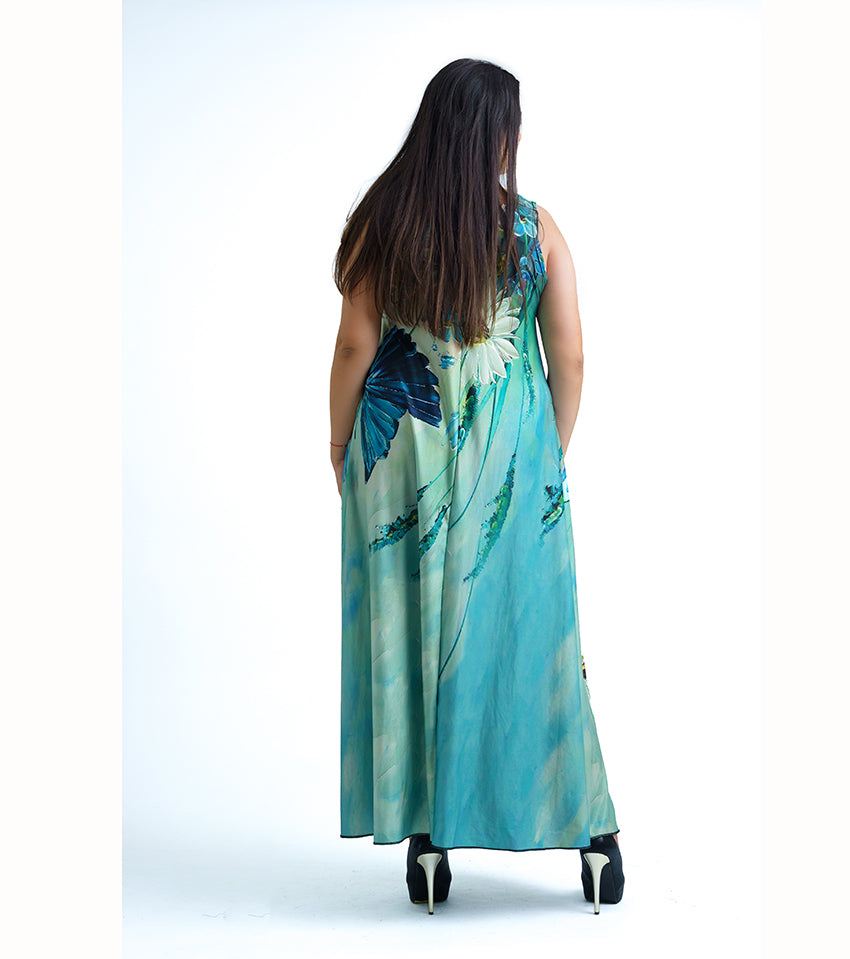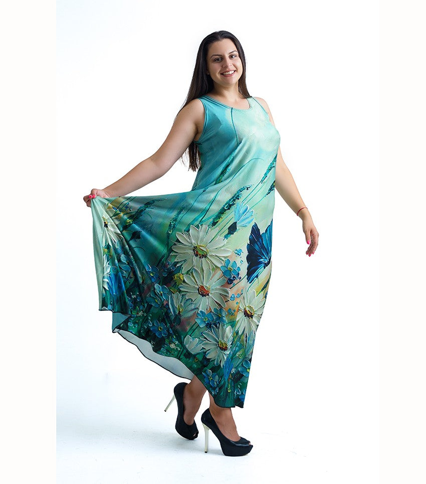 Дълга зелена рокля без ръкави Иванина. Красива рокля с флорален принт от еластична материя.