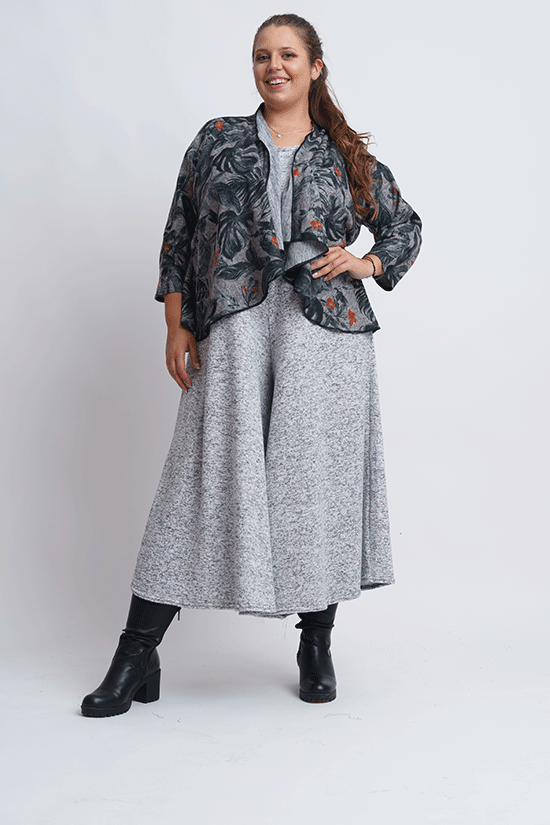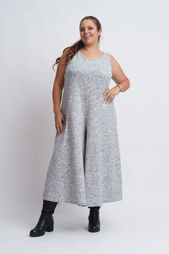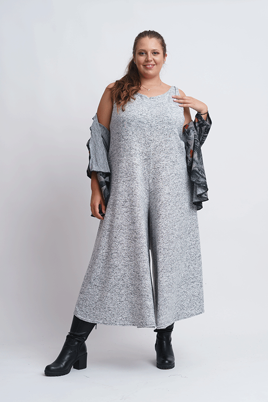 Комплект гащеризон с жилетка Искра.Сив гащеризон със свободна кройка без ръкави.Жилетката е разкроена,осигуряваща комфорт в ежедневието.Гащеризона може да се носи с блуза.Комплекта е подходящ и за голяма номерация.Изработени са от меко памучно плетиво.