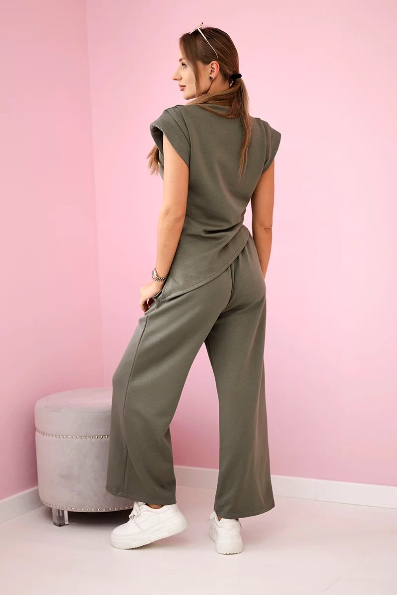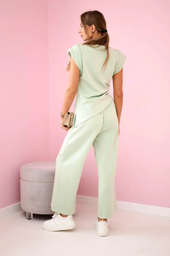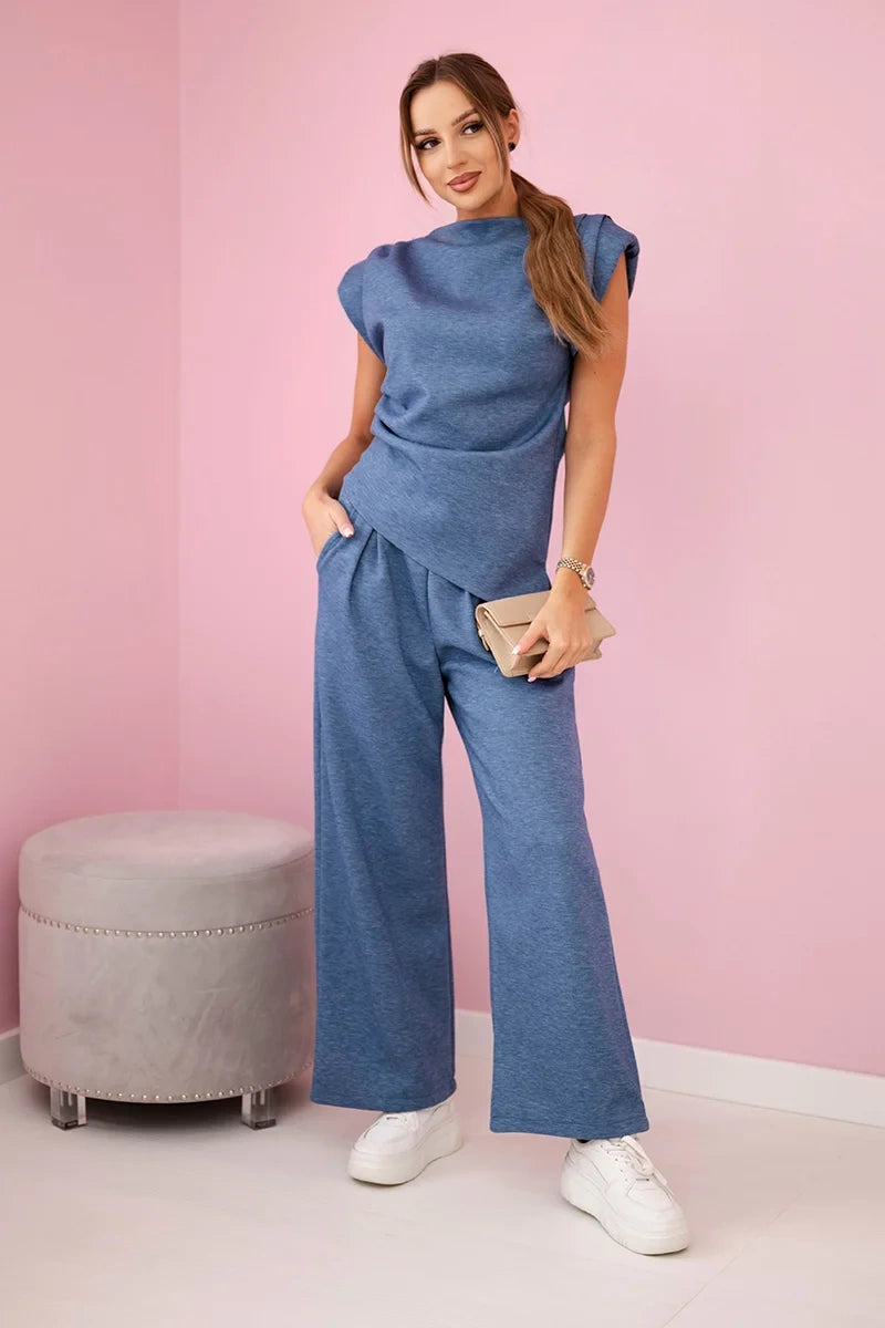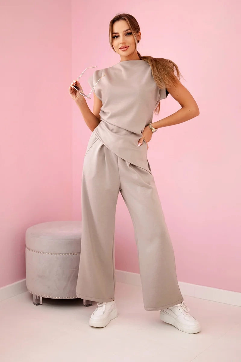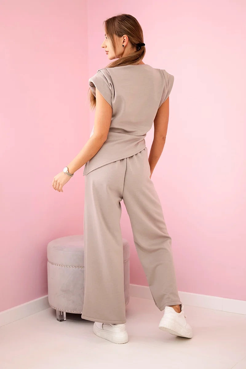 Този уникален комплект е перфектната комбинация от елегантност и комфорт, подчертаваща вашия индивидуален стил. Асиметричната блуза се откроява с оригиналната си кройка, придавайки на тоалета модерна нотка. Неговата свободна кройка се простира красиво върху силуета, маскирайки малки несъвършенства и осигурявайки свобода на движение. Панталонът, перфектно съчетан с блуза, е с удобна кройка, която гарантира целодневно носене. Изработени от висококачествени материали, те прилепват добре по тялото и стават както за ежедневни, така и за по-елегантни тоалети. Асиметричният комплект блуза + панталон е отличен избор за жени, които ценят уникалния дизайн и искат да изглеждат стилни във всяка ситуация. Идеален за работа, срещи или специални поводи – създайте отличителен външен вид, който ви кара да се откроявате от тълпата. Размерът е универсален и става за жени, носещи S, M или L.