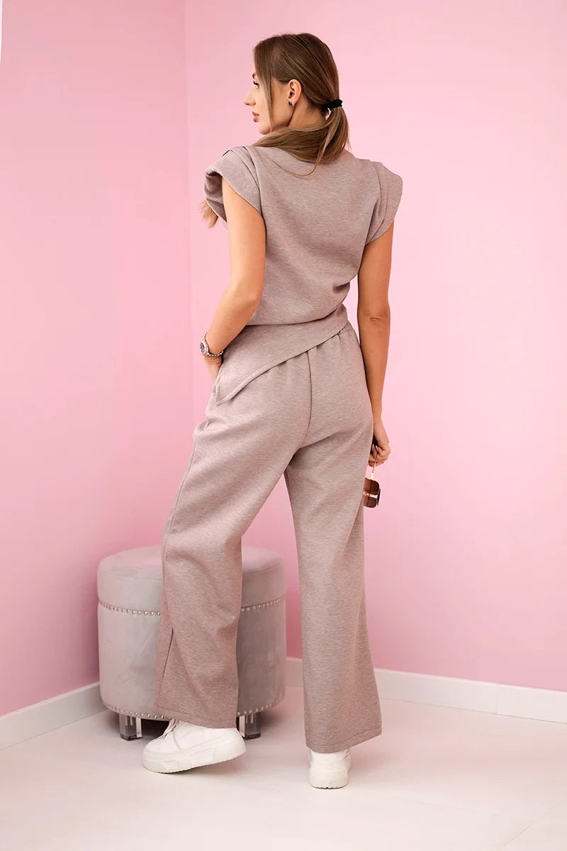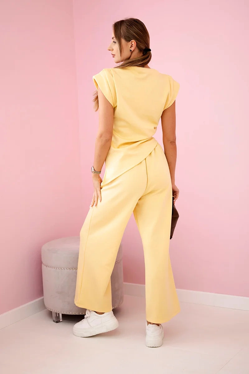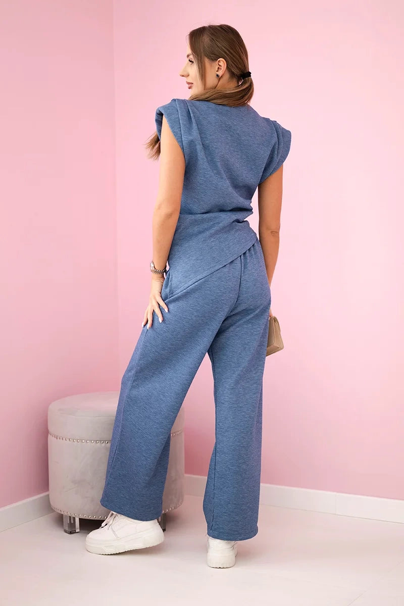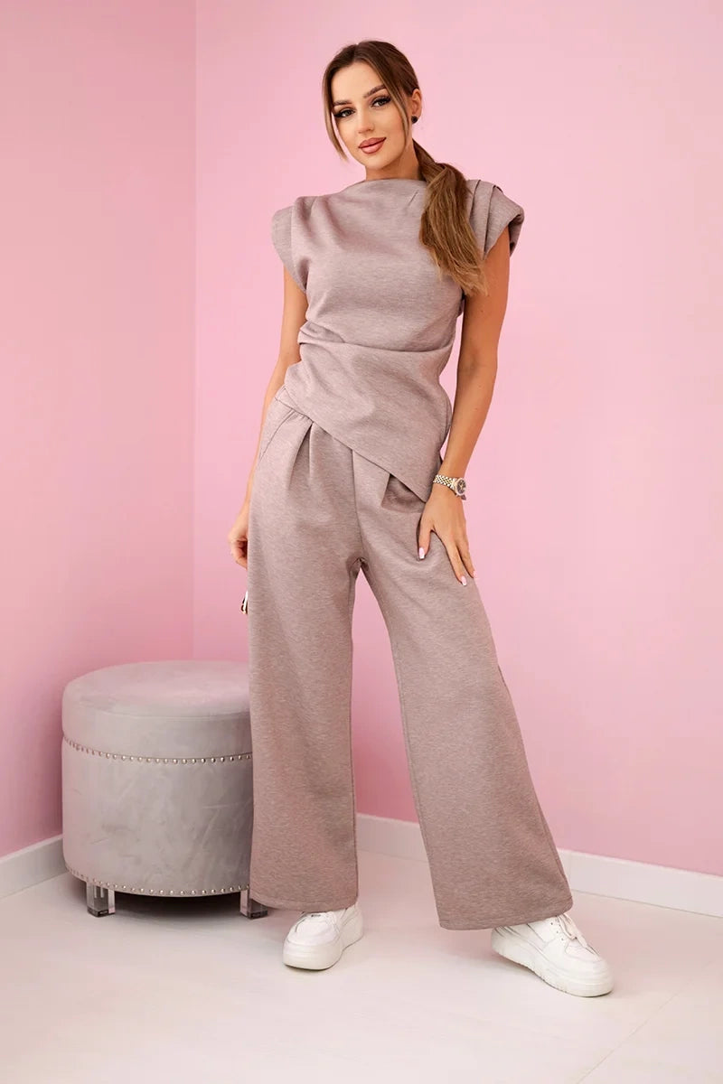 Този уникален комплект е перфектната комбинация от елегантност и комфорт, подчертаваща вашия индивидуален стил. Асиметричната блуза се откроява с оригиналната си кройка, придавайки на тоалета модерна нотка. Неговата свободна кройка се простира красиво върху силуета, маскирайки малки несъвършенства и осигурявайки свобода на движение. Панталонът, перфектно съчетан с блуза, е с удобна кройка, която гарантира целодневно носене. Изработени от висококачествени материали, те прилепват добре по тялото и стават както за ежедневни, така и за по-елегантни тоалети. Асиметричният комплект блуза + панталон е отличен избор за жени, които ценят уникалния дизайн и искат да изглеждат стилни във всяка ситуация. Идеален за работа, срещи или специални поводи – създайте отличителен външен вид, който ви кара да се откроявате от тълпата. Размерът е универсален и става за жени, носещи S, M или L.