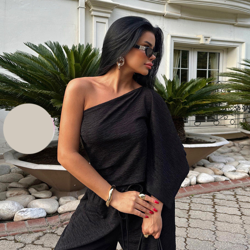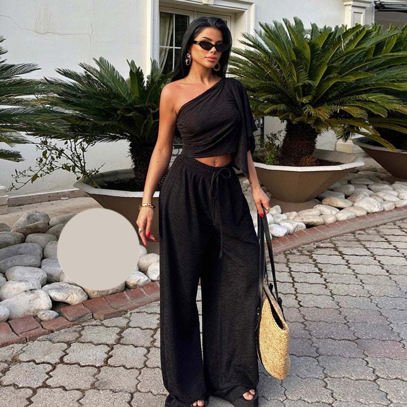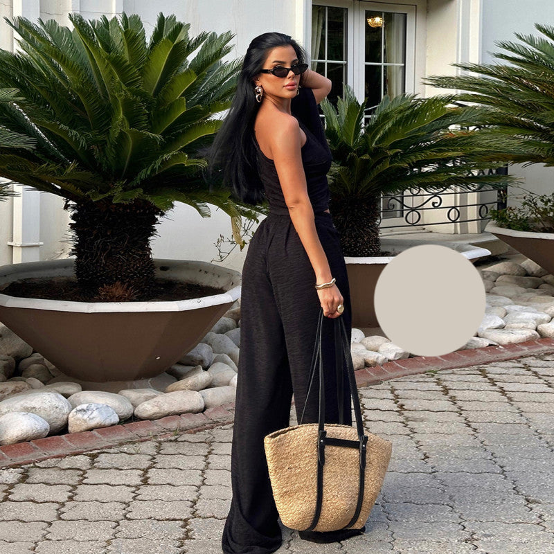 Комплект от бюстие и панталон EO-1133. Представяме ви стилния летен овърсайз комплект с бюстие и широк панталон – идеалното решение за всеки.