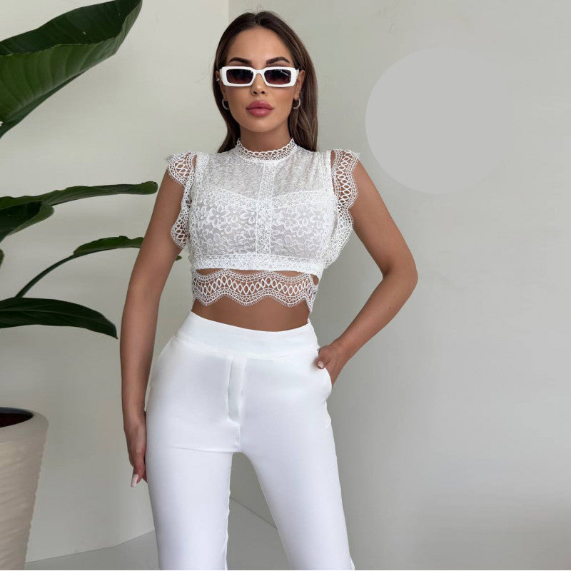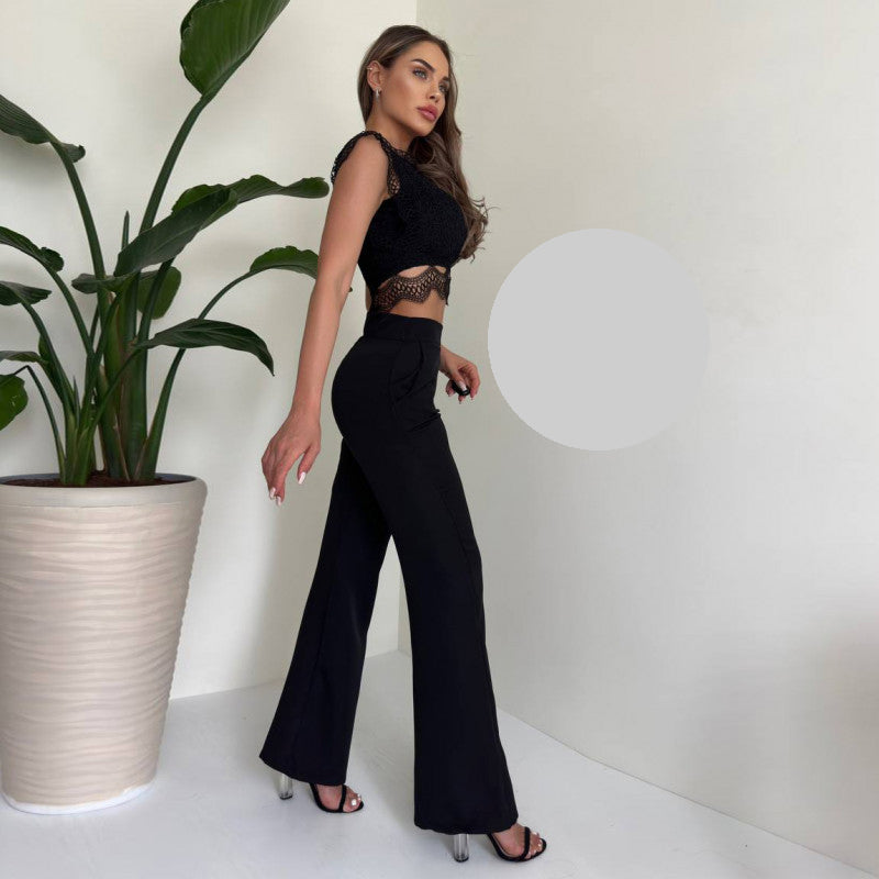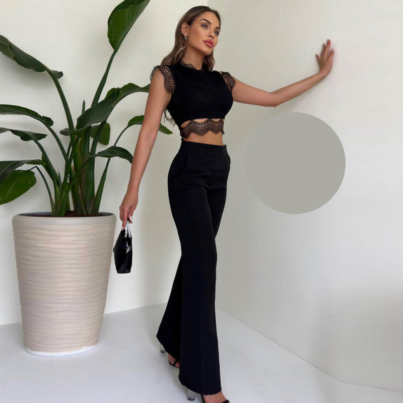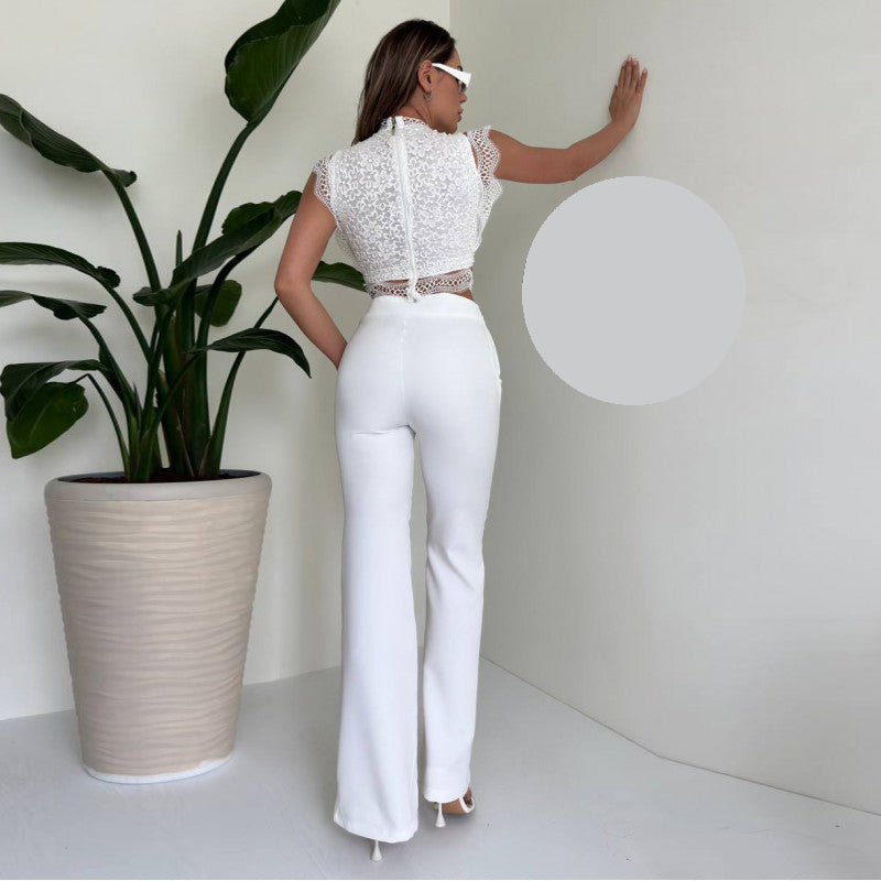Комплект от бюстие и панталон NPA-8038. Късо дантелено бюстие с цип в задната част. Панталон с висока талия и страничен цип, с джобове.