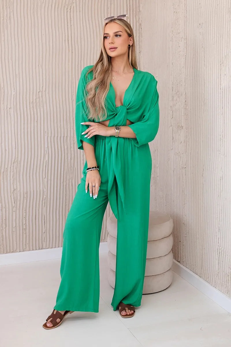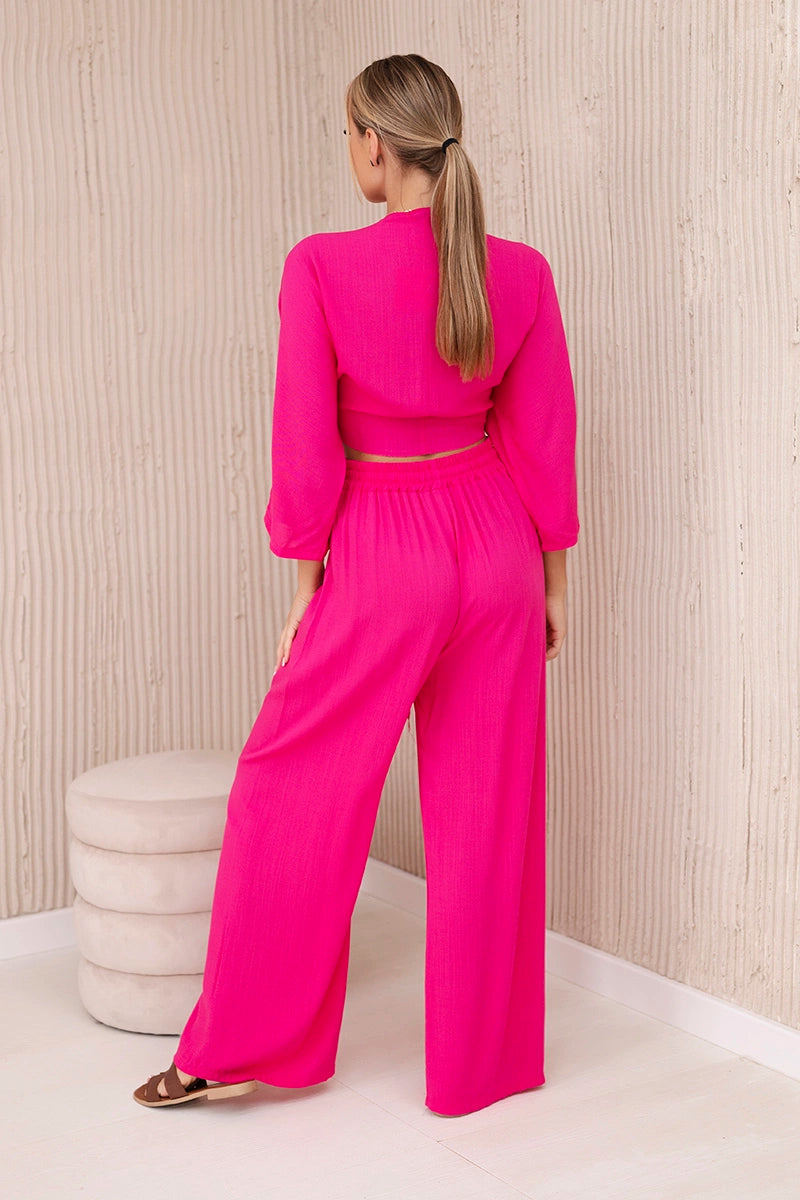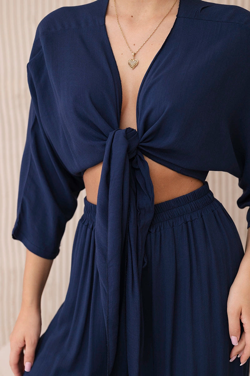 Комплект от вискоза, състоящ се от блуза, вързана отдолу и панталон е идеален вариант за тези, които търсят комфорт и стил в един комплект. Блуза, вързана в долната част, придава чар и лекота на целия стайлинг, като ви позволява да регулирате дължината й в зависимост от вашите предпочитания. Вискозният материал осигурява приятно усещане при носене и отлична дишаемост, което прави комплекта идеален за летните дни. Панталоните от вискоза ще бъдат не само удобни, но и леки и нежни към кожата. Имат по-свободна кройка, съчетаваща се с небрежния стил, придавайки на всичко елегантен вид. Такъв комплект е перфектен избор за много и различни поводи, от ежедневни разходки до по-официални събития, в зависимост от стайлинга и аксесоарите, с които се комбинира. Размерът е универсален и ще бъде подходящ за жени с размер S, M или L.