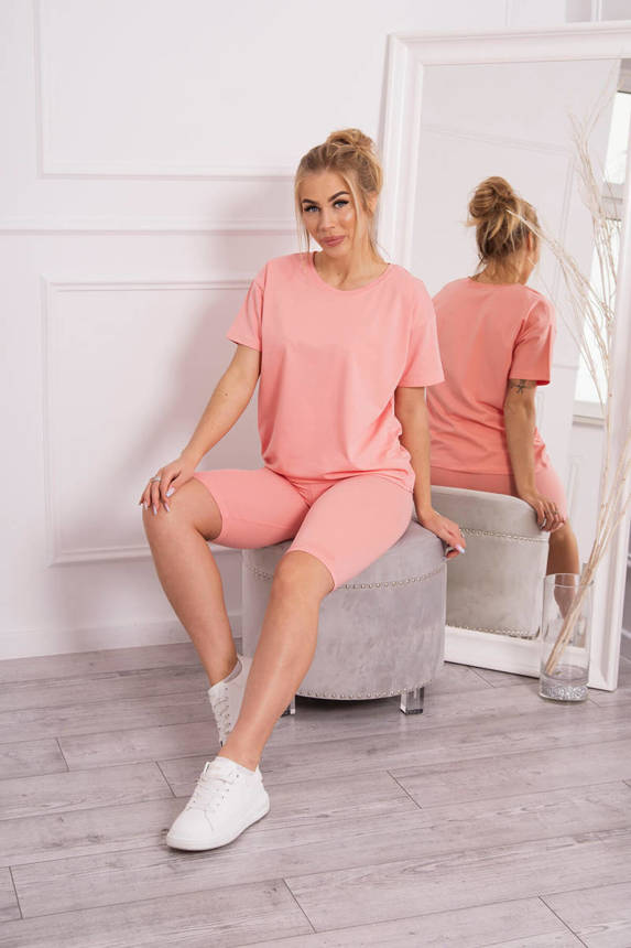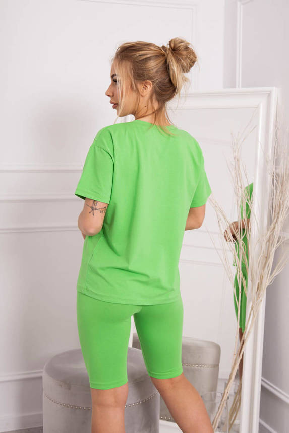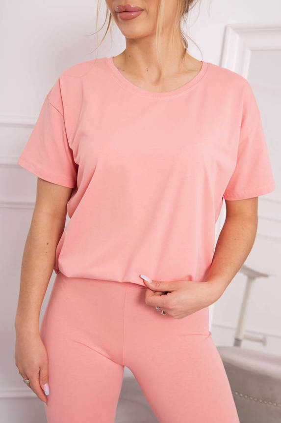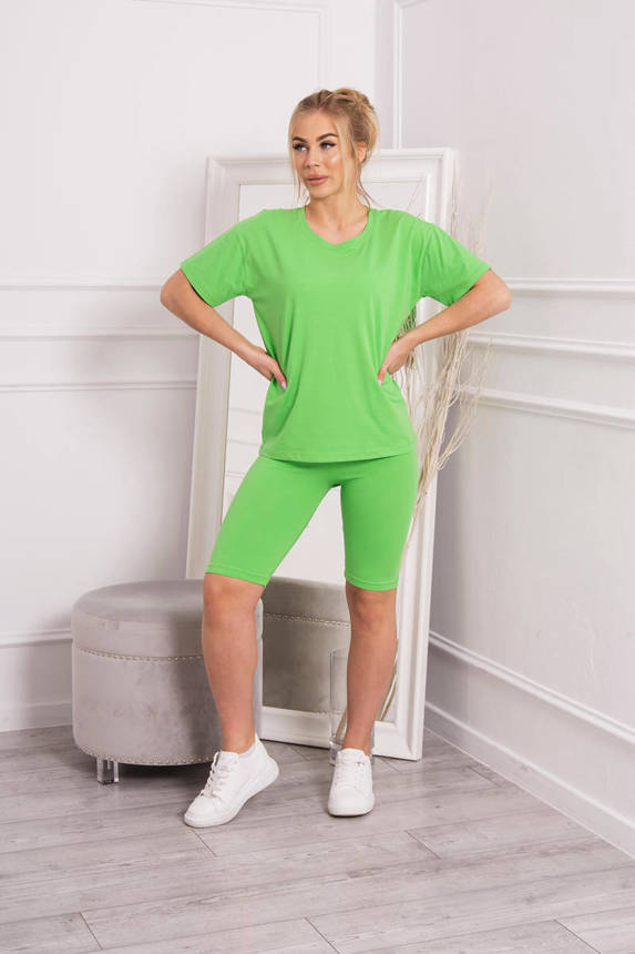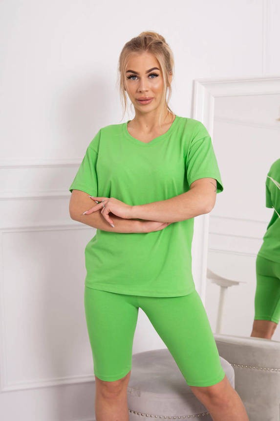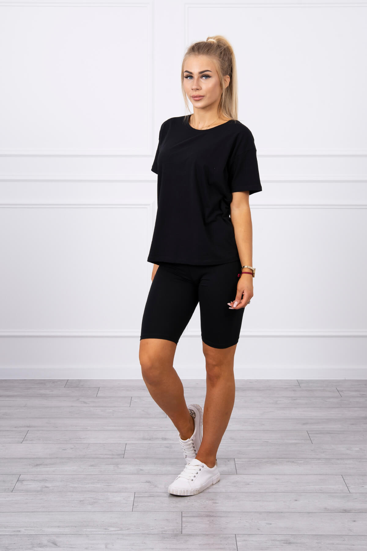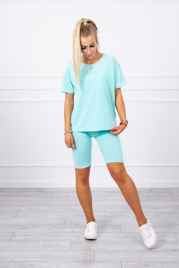 Представяме ви комплект от блуза и панталон. Гладка блуза без щампа клин е с къс крачол. Комплектът е изработен от висококачествен материал. Размерът е универсален и ще бъде подходящ за дами, носещи размери S, M или L.