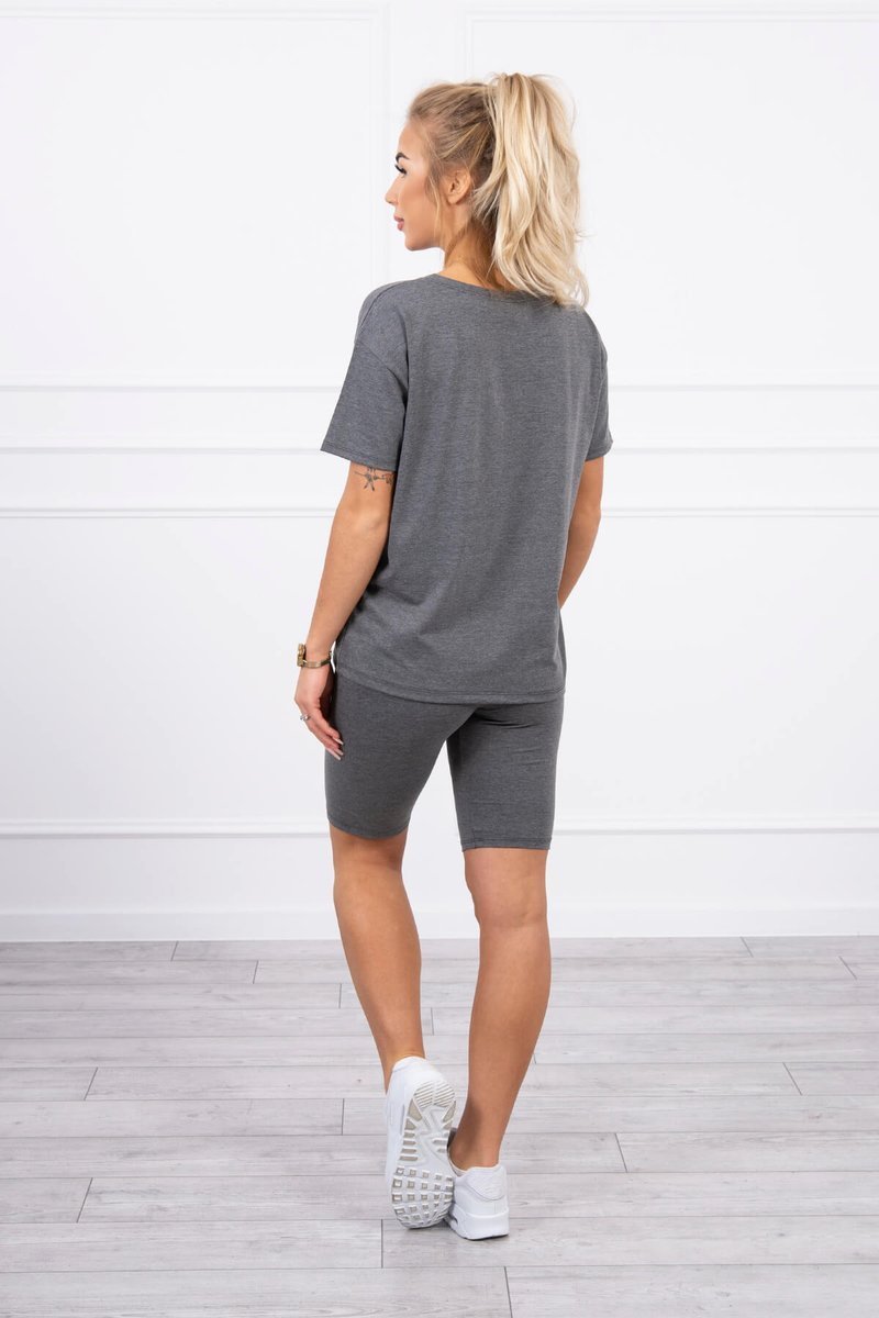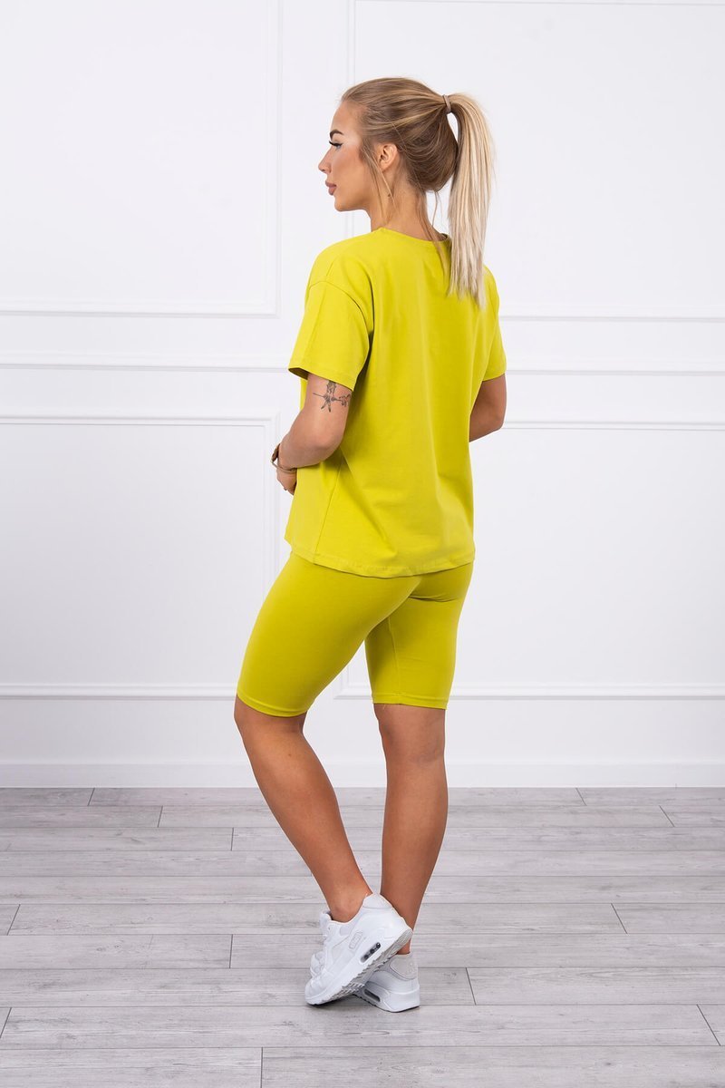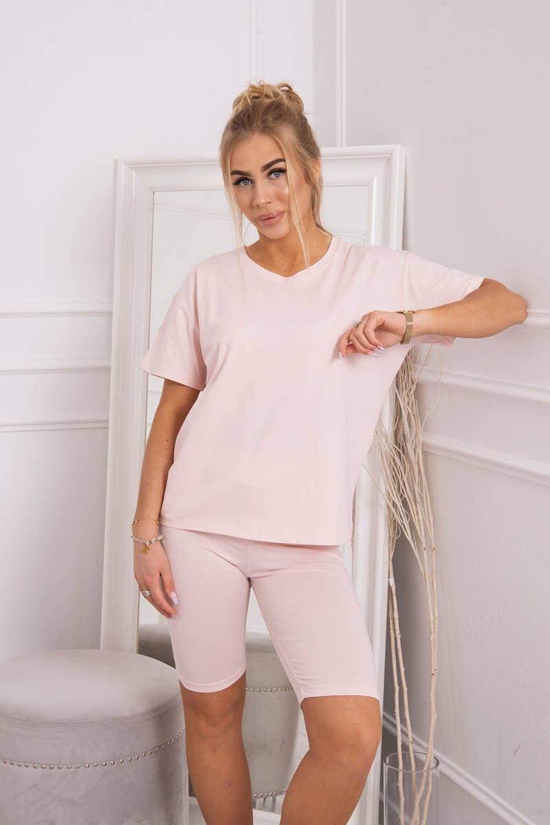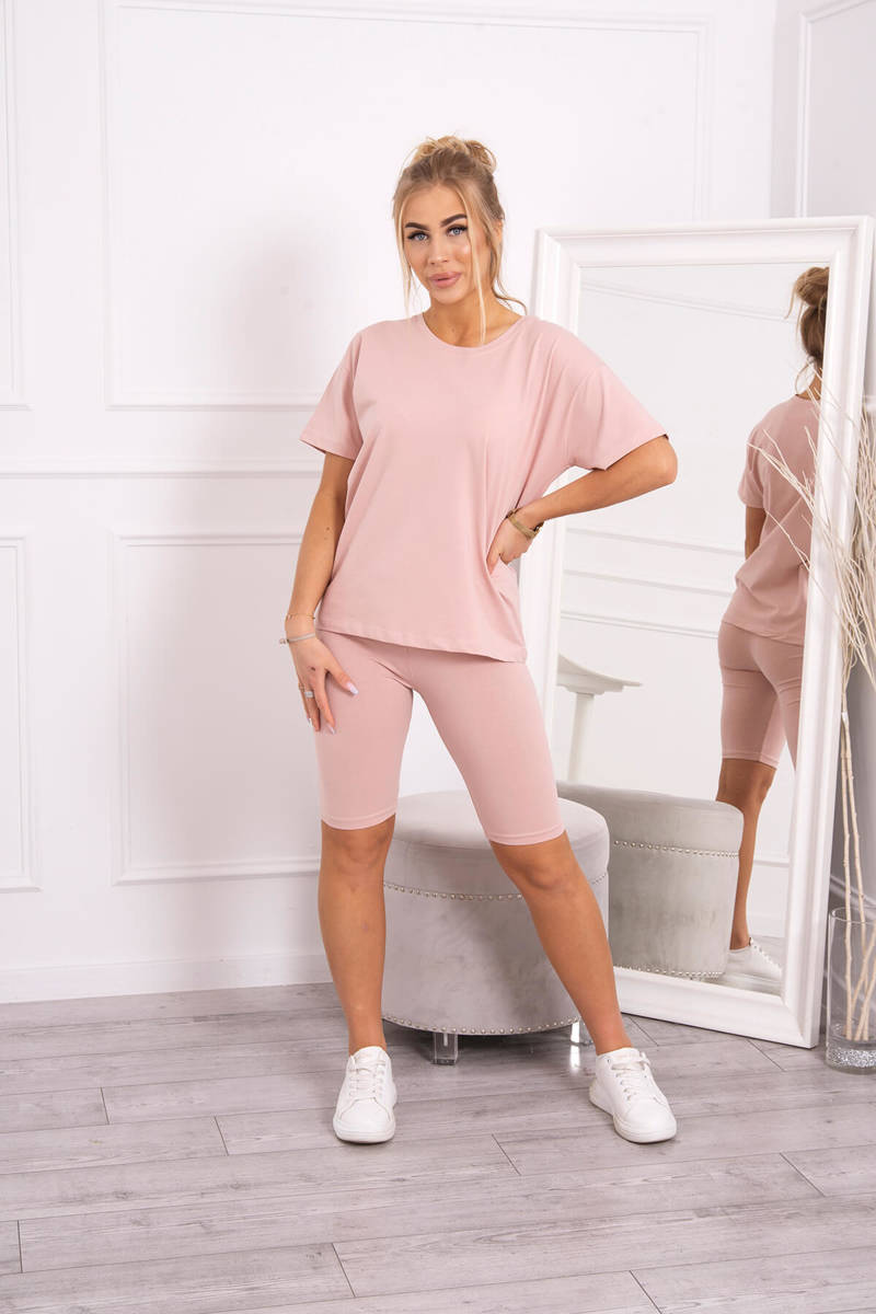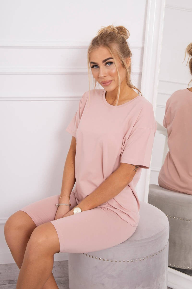 Представяме ви комплект от блуза и панталон. Гладка блуза без щампа клин е с къс крачол. Комплектът е изработен от висококачествен материал. Размерът е универсален и ще бъде подходящ за дами, носещи размери S, M или L.