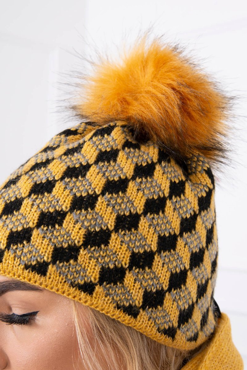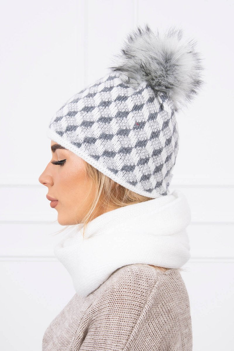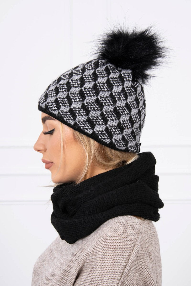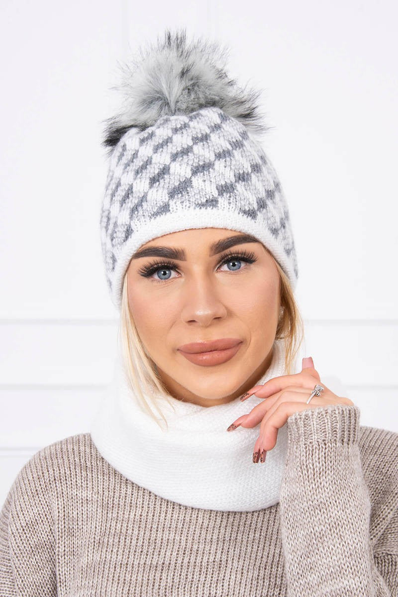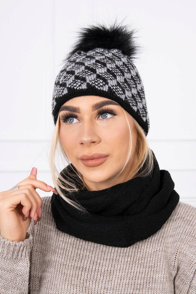 Предлагаме ви топъл комплект, състоящ се от шапка и коминче. Шапката е подплатена с полар и има помпон. Комплектът се отличава с атрактивен външен вид и солидна изработка. Много красив десен ще направи комплекта модерен и практичен аксесоар за много сезони. Цветът на помпоните може да се различава от показаните на снимките. Размерът на шапката и шала е универсален.