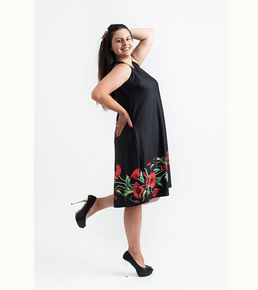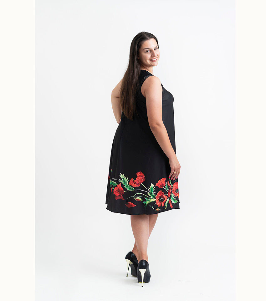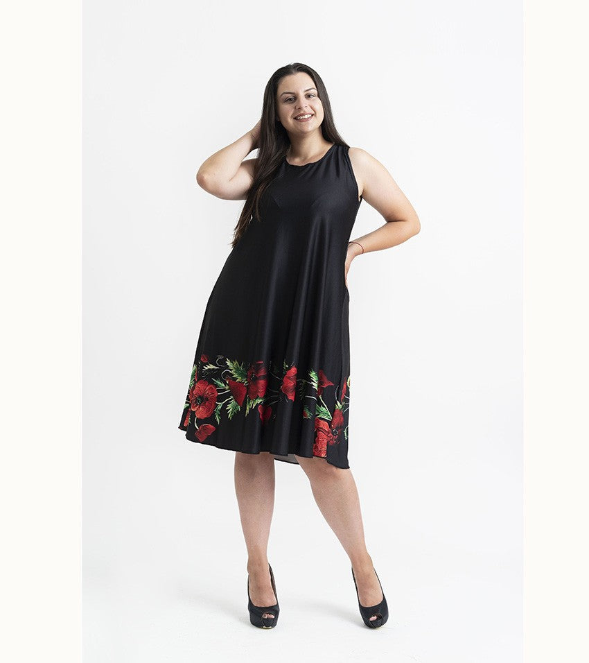Къса черна рокля без ръкави Изабел. Красива черна рокля с бордюр от червени макове в долната част. Еластична материя.