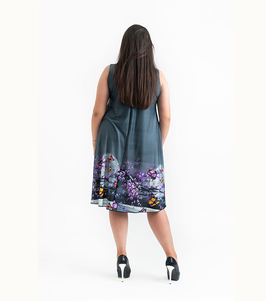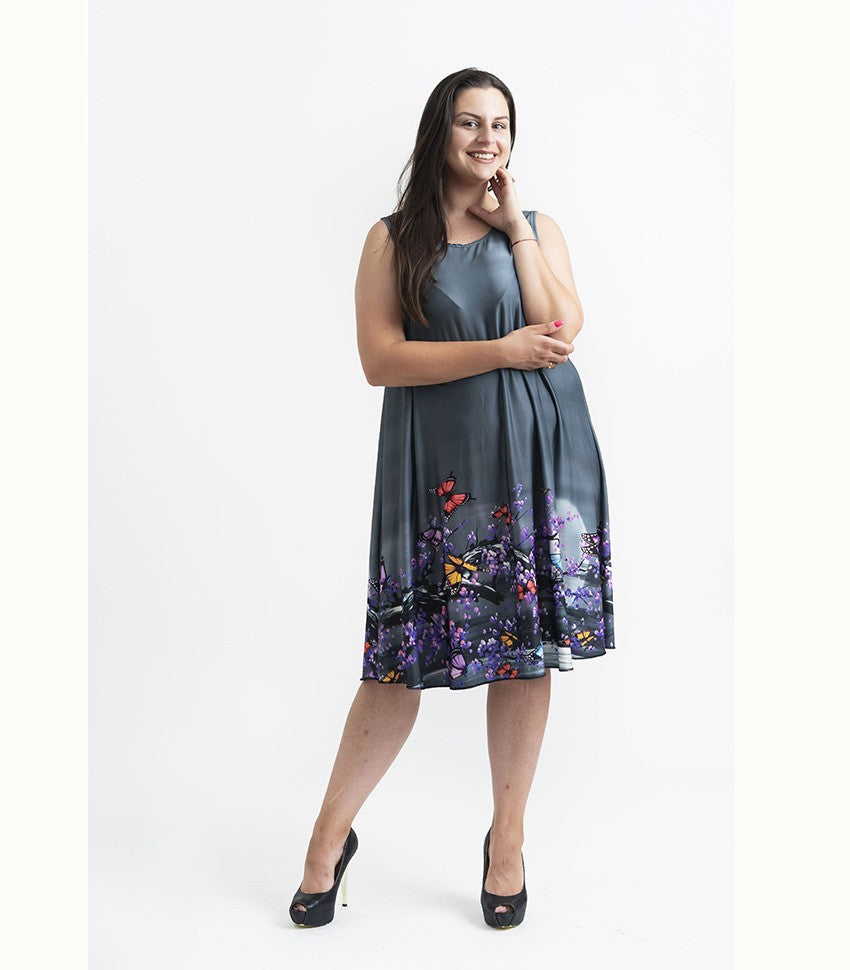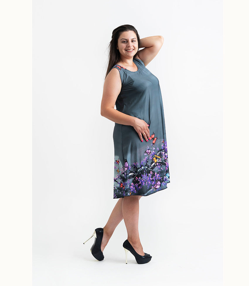 Къса сива рокля без ръкави Инес. Сива рокля без ръкави украсена с красиви цветя и пеперуди. Еластична материя.