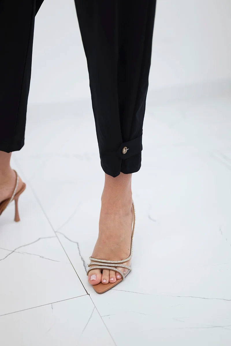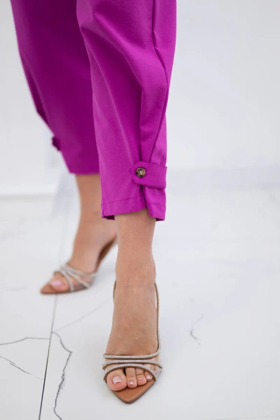 Летните панталони Punto със закопчаване на крачолите са модерно и стилно предложение, което съчетава комфорт с оригинален дизайн. Изработени от висококачествен материал, те осигуряват комфорт, като същевременно подчертават силуета. Характерен елемент на панталона е закопчаването на крачолите, което добавя уникален, модерен акцент към цялото изделие. Класическата им, но изискана кройка ги прави идеален избор както за ежедневието, така и за по-официални поводи. Благодарение на еластичната талия и вталената кройка, тези панталони се съчетават чудесно с различни стилове – от ежедневен до елегантен. Размерът е универсален и ще бъде подходящ за жени, носещи размери S, M или L.