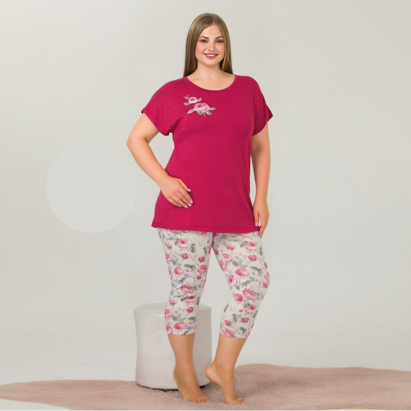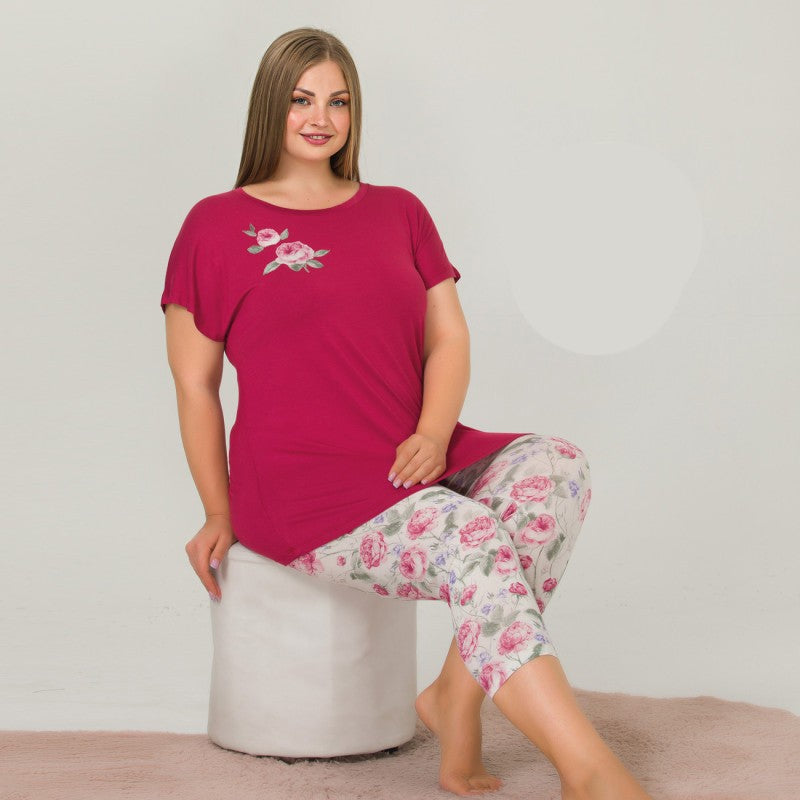 Разкошният дамски комплект от тениска и 7/8 клин е идеалното решение за комфорт и стил у дома. Изработен от еластична материя, той предлага уют и свобода на движението – идеален за спокоен сън или уютни вечери в домашна обстановка.