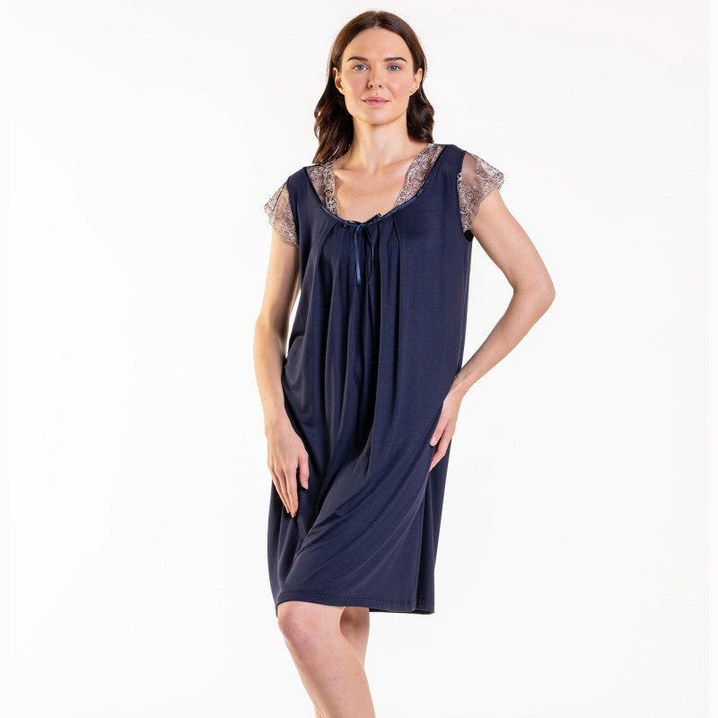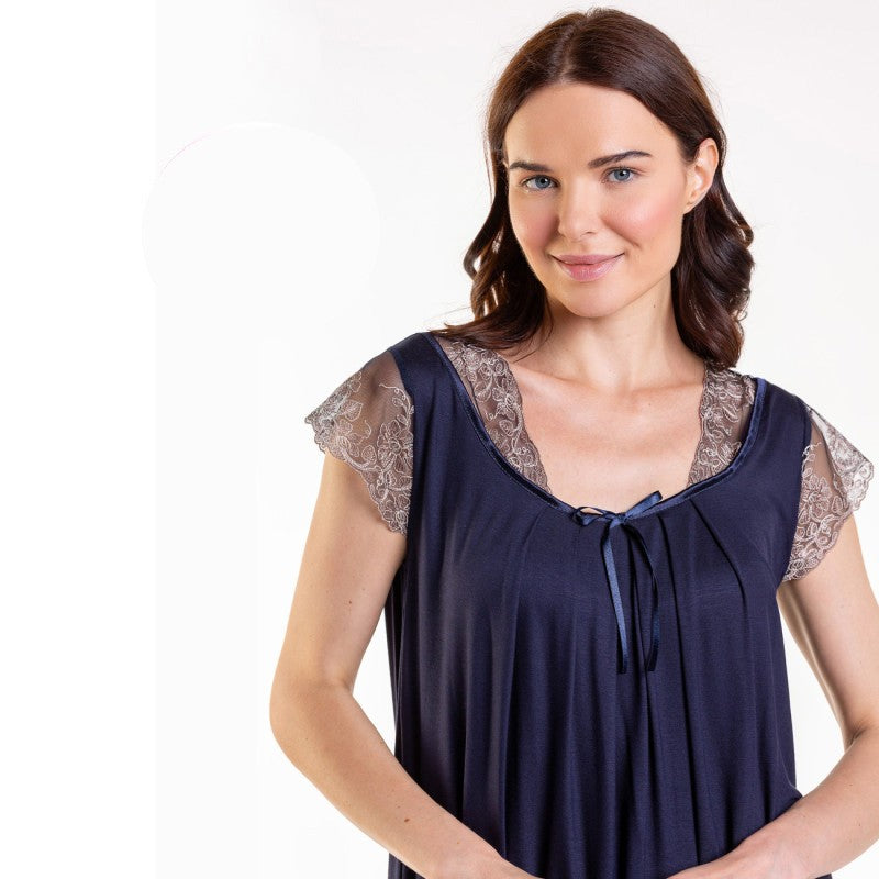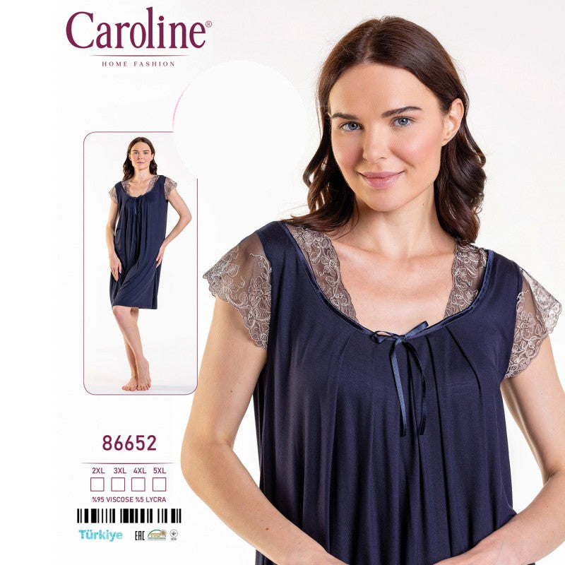Макси нощница с къс ракав и дантела CE-86652. Нощница от вискоза с къс ръкав, свободнопадаща с набор от бюста. Дантелена декорация по деколтето и ръкавите.