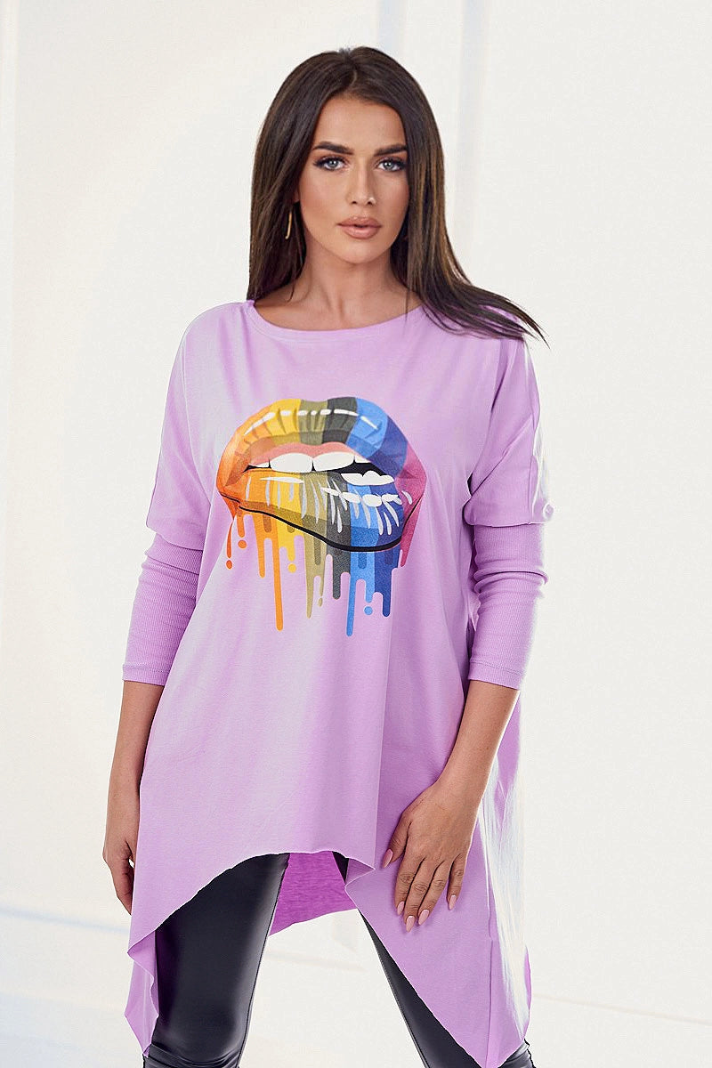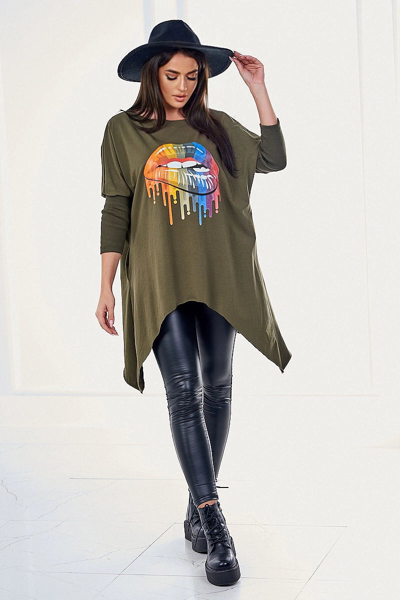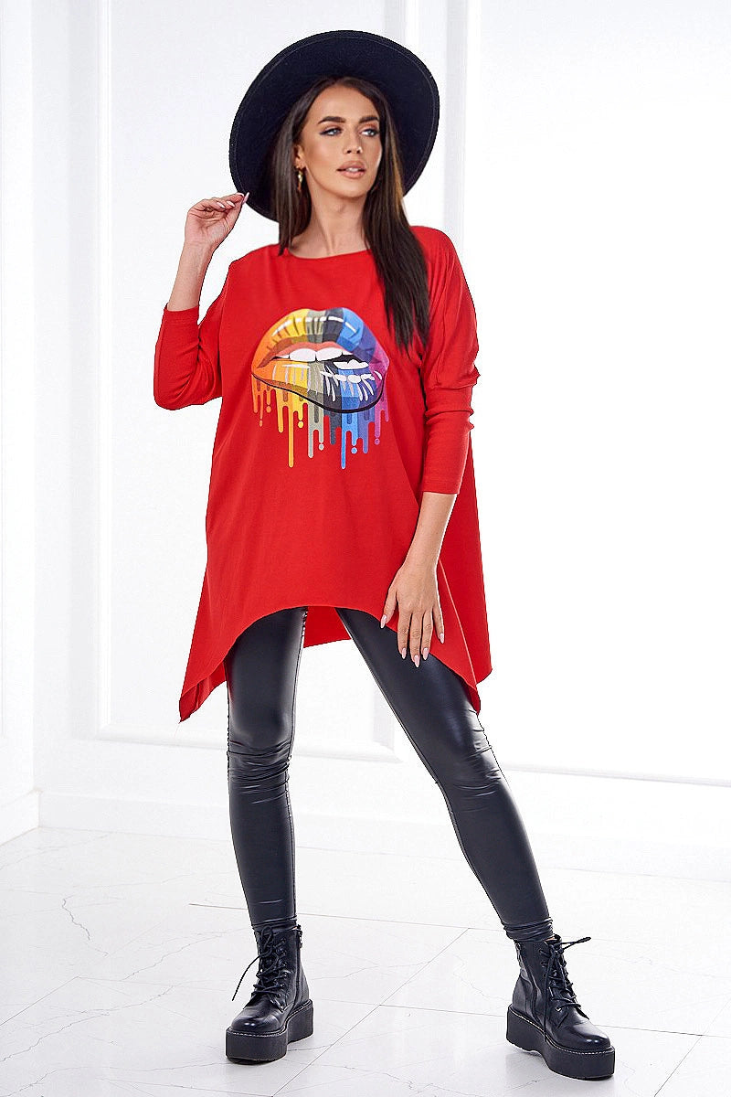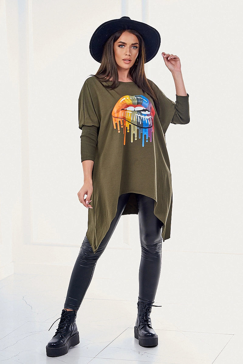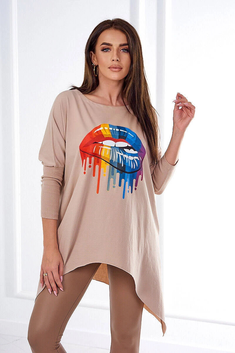 Представяме ви страхотна овърсайз блуза. Блузата има щампа с уста в цвят на дъгата отпред. Блуза с джобове. Тази блуза се характеризира с модерна визия и прецизност на изработка. Със сигурност не може да липсва в гардероба ви. Блузата е изработена от висококачествена материя. Универсалният размер ще бъде подходящ за жени, които носят размери M, L или XL ежедневно