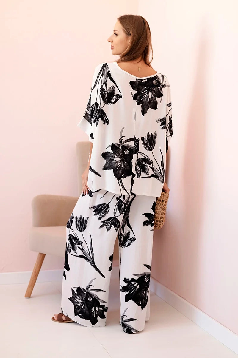 Стилен дамски комплект, изработен от мека, лека материя с високо съдържание на вискоза. Комплектът включва широка блуза с къс ръкав с обло деколте и широк панталон с ластик на талията. Целият тоалет е украсен с елегантен черно-бял флорален десен, който грабва окото и придава неповторим чар. Ефирната кройка и дишащата материя го правят идеален както за ежедневни тоалети, така и за летни разходки.