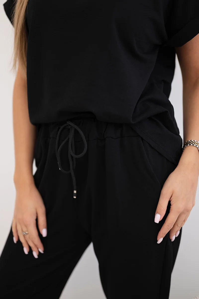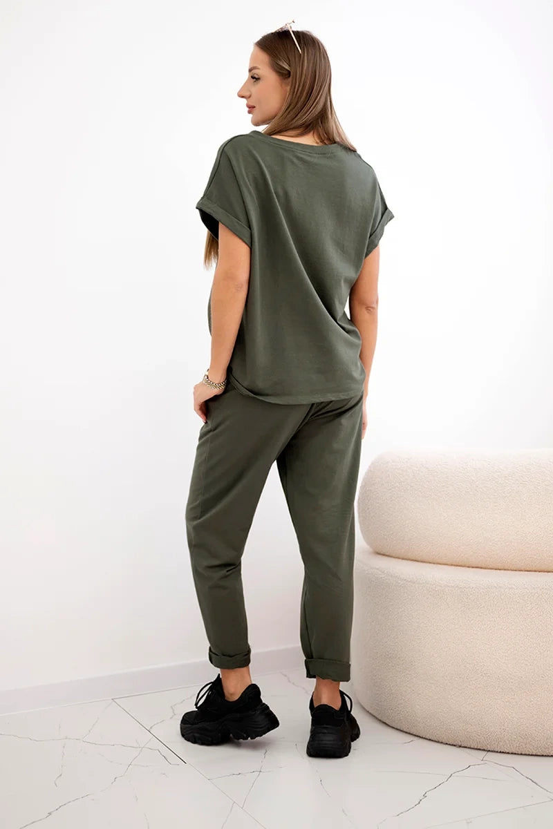 Този памучен комплект е перфектната комбинация от комфорт и модерен дизайн, което го прави подходящ за всеки повод. Изработен от висококачествен, дишащ памук, той осигурява максимален комфорт при носене през целия ден, като същевременно позволява на кожата да диша свободно. Блузата, с класическата си кройка, приляга идеално на силуета, гарантирайки комфорт и свобода на движение. Панталонът с ластик на талията и практични джобове е идеален избор за жени, които ценят функционалността и стила. Спокойната им кройка осигурява комфорт, като същевременно придава лекота и хармония на силуета. Благодарение на гъвкавия си дизайн, комплектът е идеален както за ежедневно носене, така и за по-елегантни тоалети. Може да се комбинира с маратонки за небрежен външен вид или да се допълва с елегантни детайли за шикозен тоалет при специални поводи. Изберете памучния комплект с блуза и панталон и се насладете на комфорт и естествен стил в най-добрия вид. Размерът е универсален и става за жени с размер S, M или L.