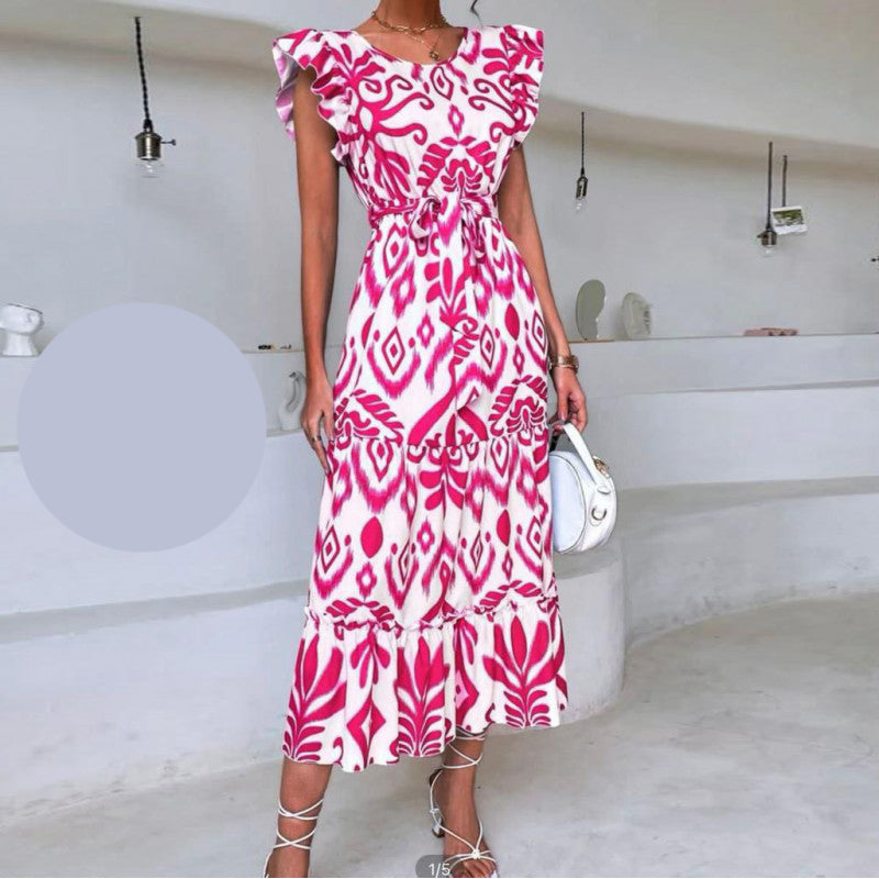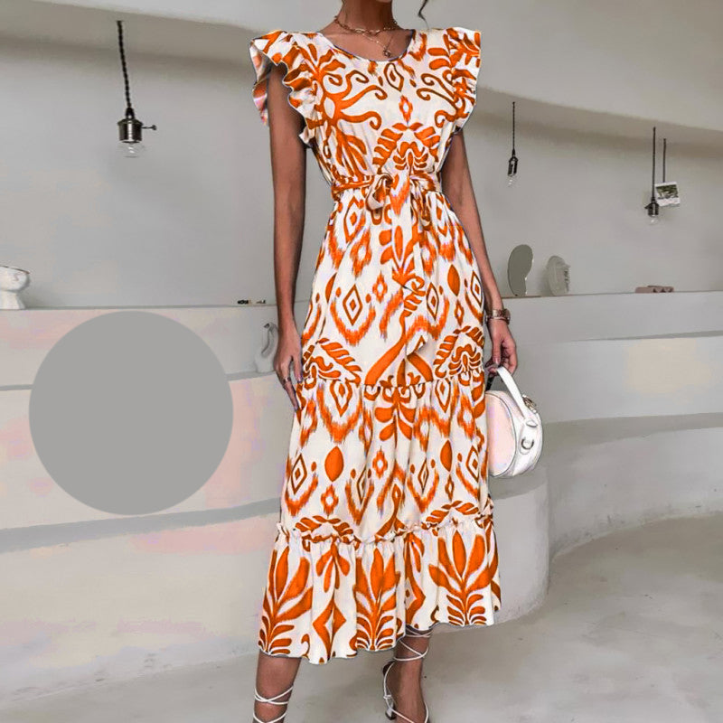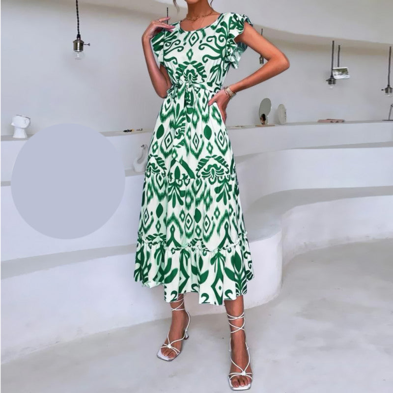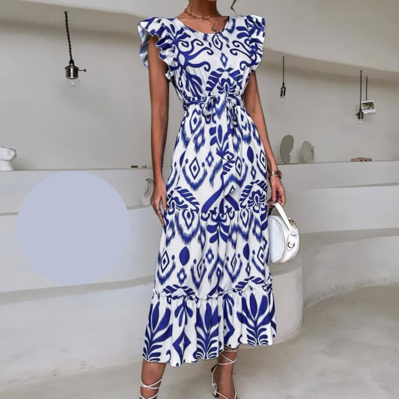 Памучна дълга лятна рокля 12334. Дълга рокля с къдрици по ръкавите и колан.