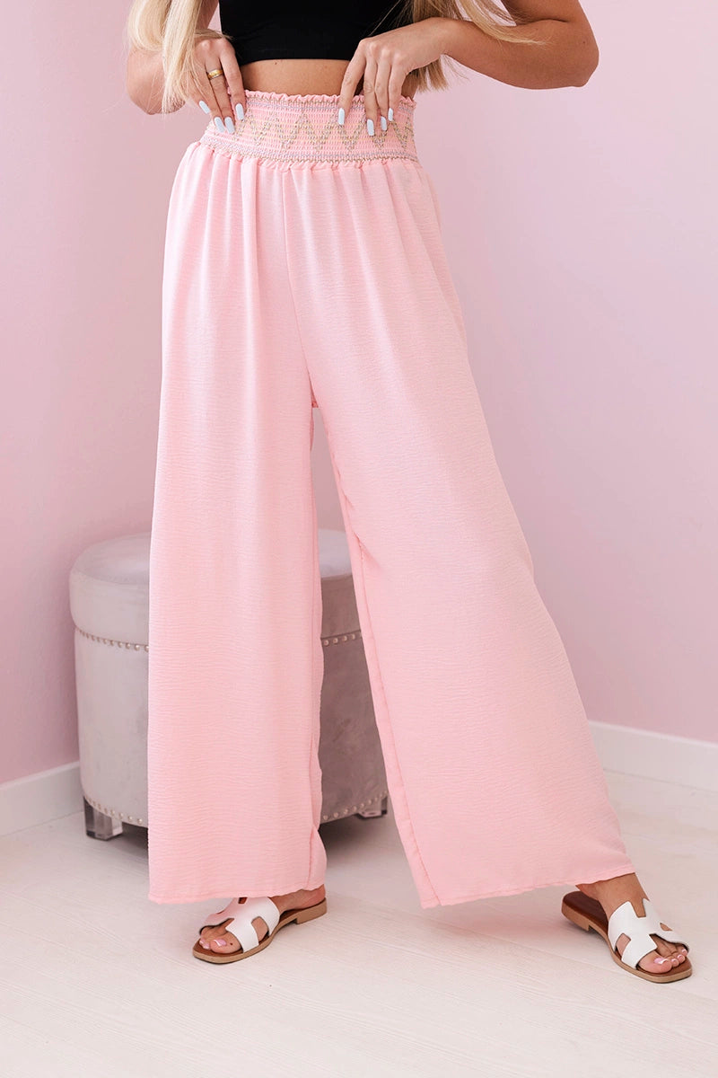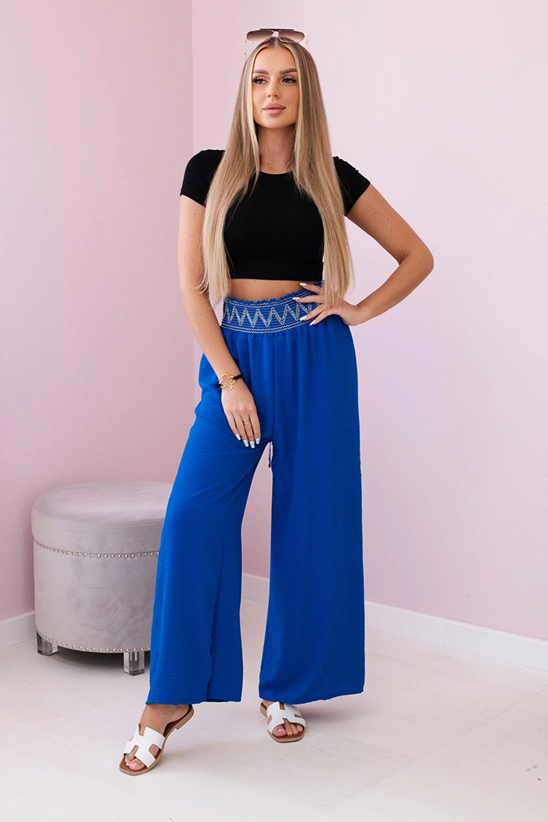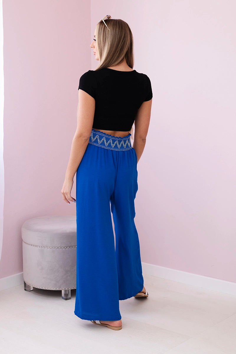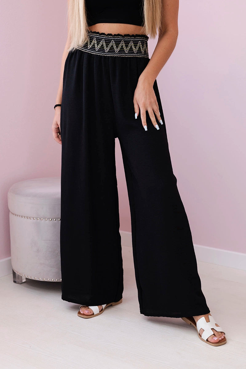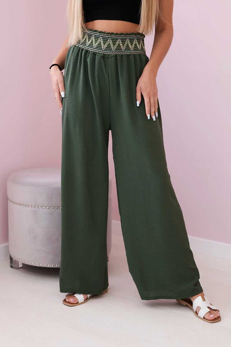 Панталоните с широк ластик на талията са практичен и удобен избор за ежедневието. Благодарение на широкия ластичен колан те осигуряват перфектно прилягане и комфорт при носене. Перфектен за релаксиращи разходки, домакинска работа или случайни срещи с приятели. Те перфектно съчетават удобството с модния стил, а широкият ластик придава оригиналност и лекота. Тези панталони бързо ще се превърнат в любим артикул в гардероба ви, позволявайки ви да се наслаждавате на комфорт през целия ден. Размерът е универсален и ще бъде подходящ за жени, носещи размер S, M или L.