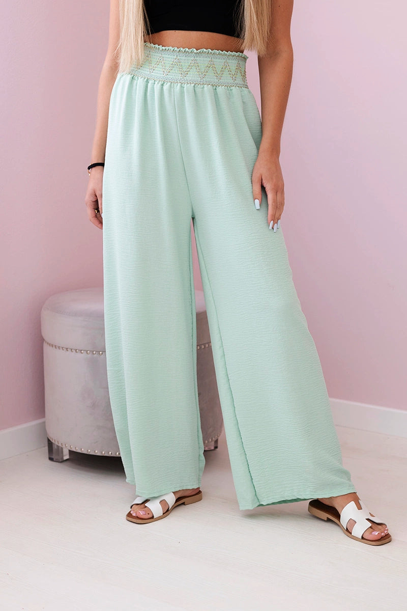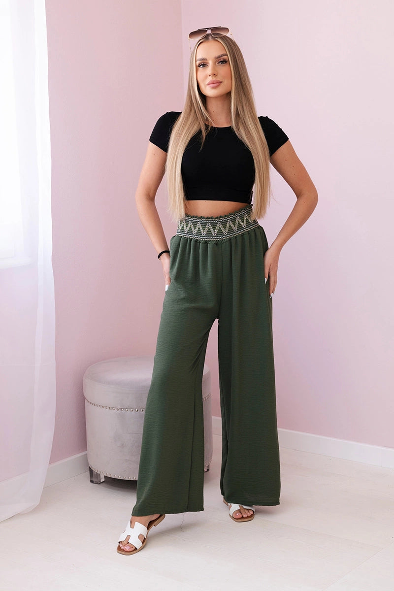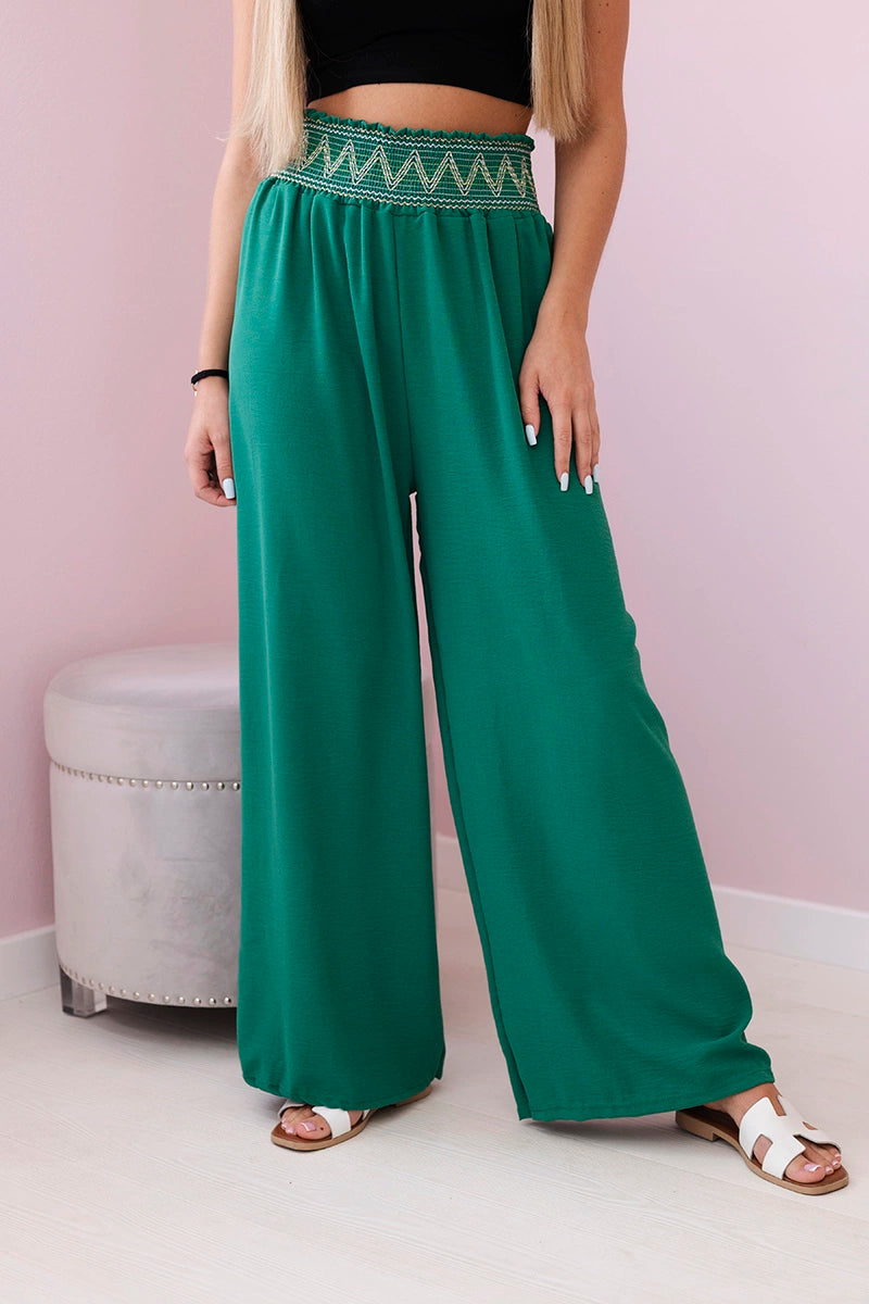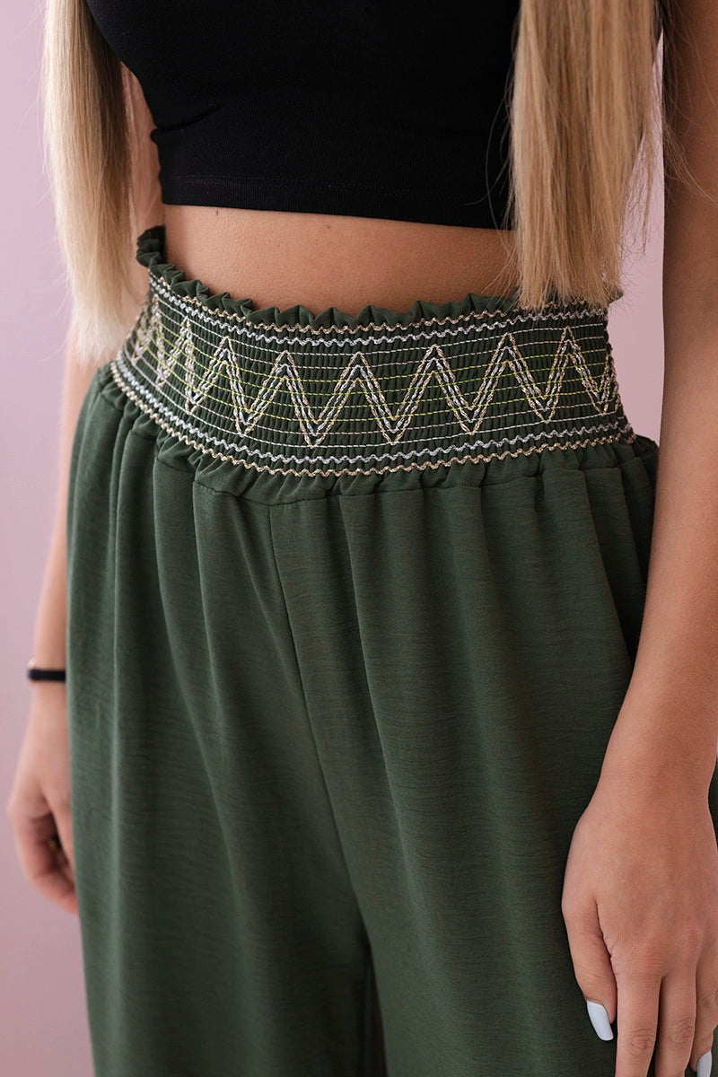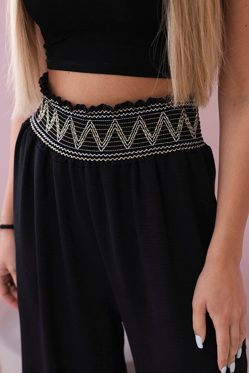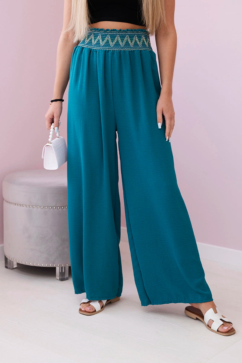 Панталоните с широк ластик на талията са практичен и удобен избор за ежедневието. Благодарение на широкия ластичен колан те осигуряват перфектно прилягане и комфорт при носене. Перфектен за релаксиращи разходки, домакинска работа или случайни срещи с приятели. Те перфектно съчетават удобството с модния стил, а широкият ластик придава оригиналност и лекота. Тези панталони бързо ще се превърнат в любим артикул в гардероба ви, позволявайки ви да се наслаждавате на комфорт през целия ден. Размерът е универсален и ще бъде подходящ за жени, носещи размер S, M или L.
