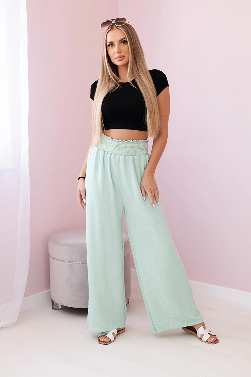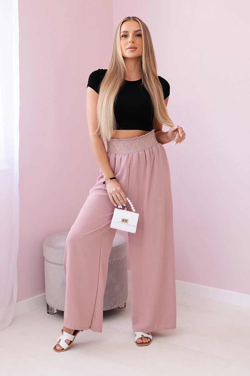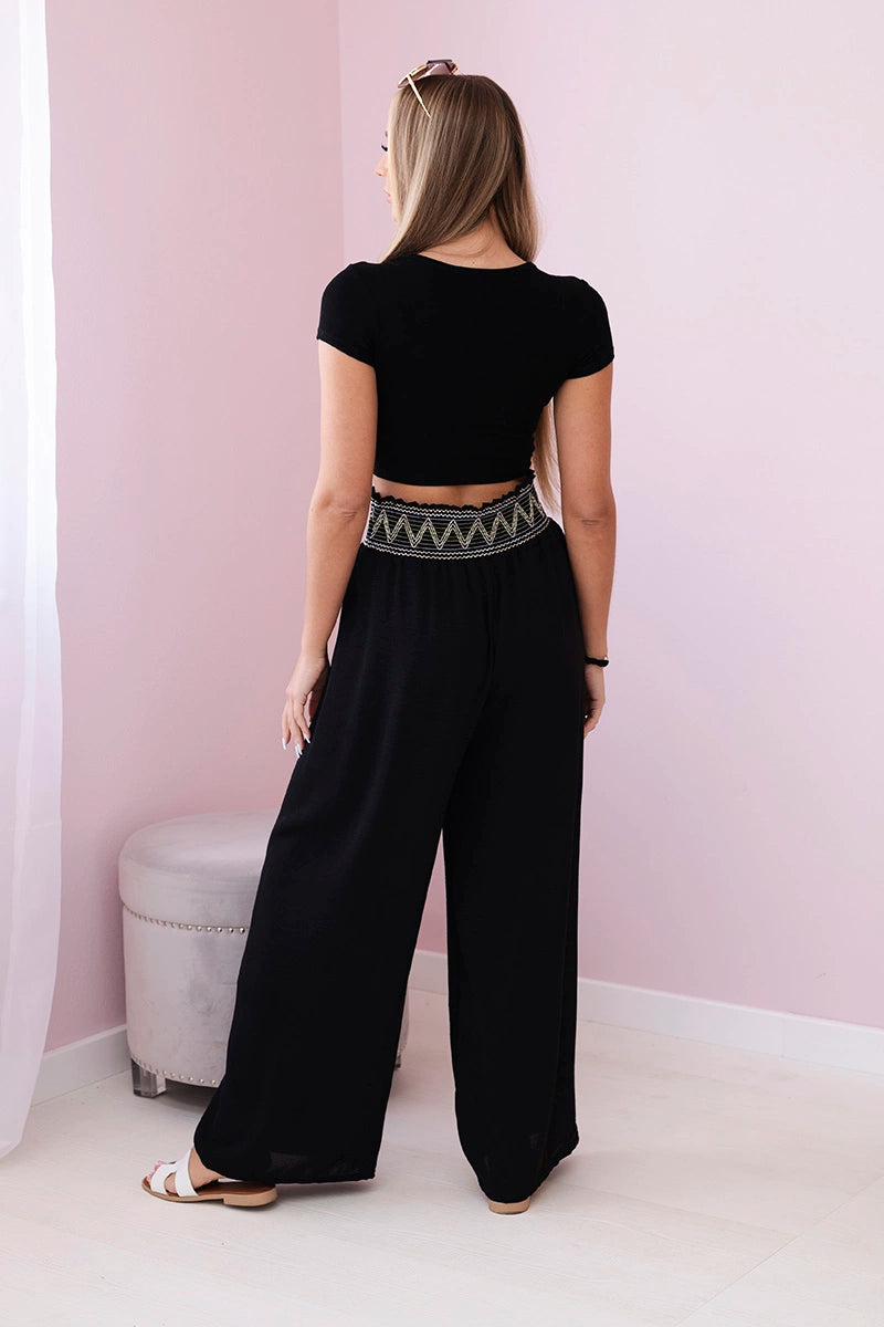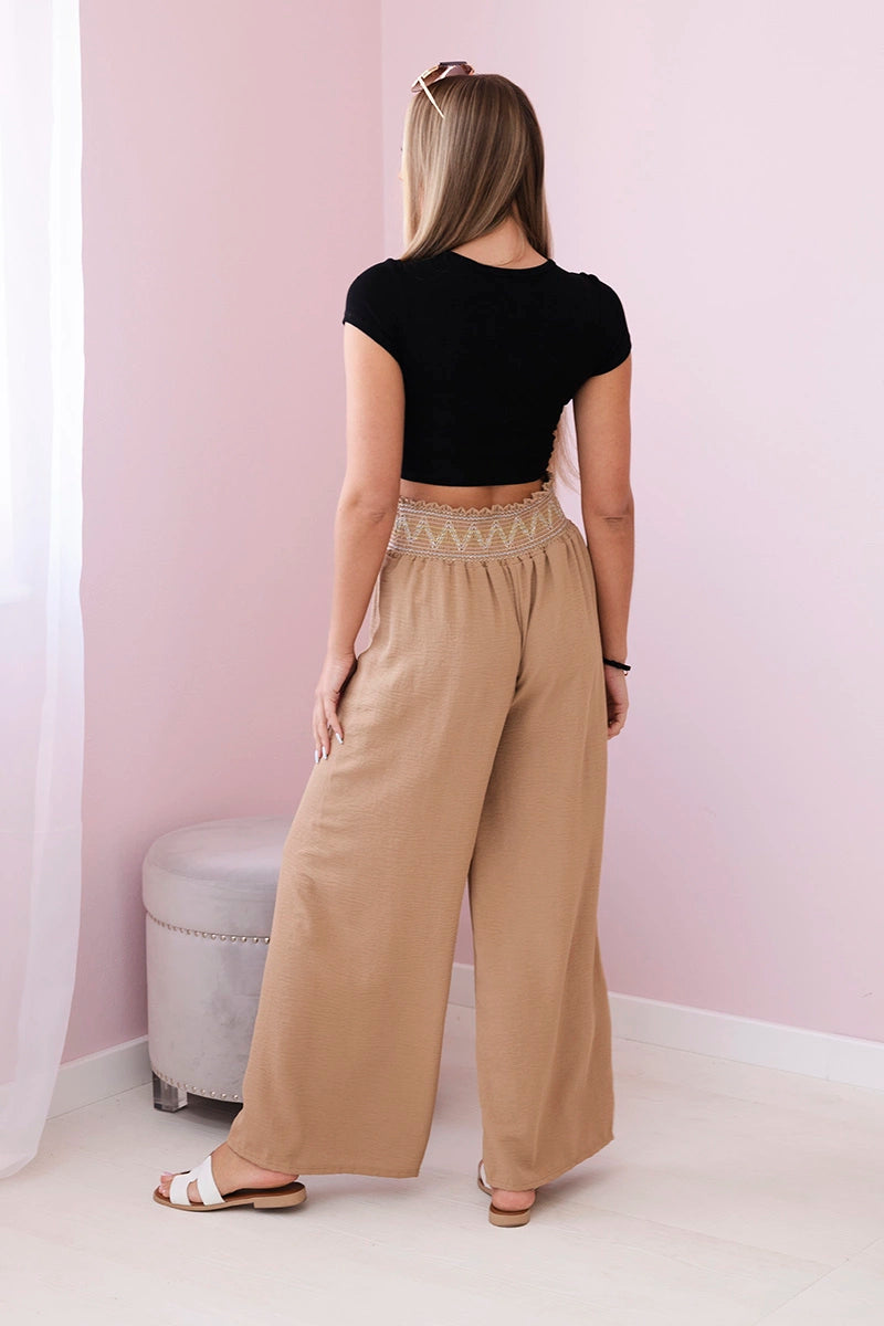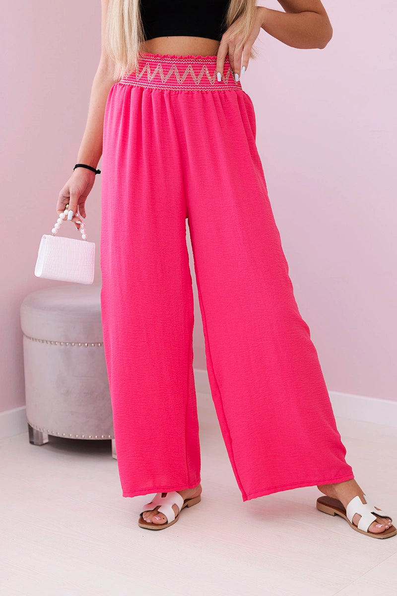 Панталоните с широк ластик на талията са практичен и удобен избор за ежедневието. Благодарение на широкия ластичен колан те осигуряват перфектно прилягане и комфорт при носене. Перфектен за релаксиращи разходки, домакинска работа или случайни срещи с приятели. Те перфектно съчетават удобството с модния стил, а широкият ластик придава оригиналност и лекота. Тези панталони бързо ще се превърнат в любим артикул в гардероба ви, позволявайки ви да се наслаждавате на комфорт през целия ден. Размерът е универсален и ще бъде подходящ за жени, носещи размер S, M или L.