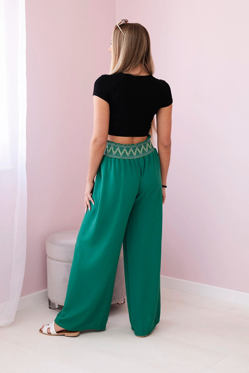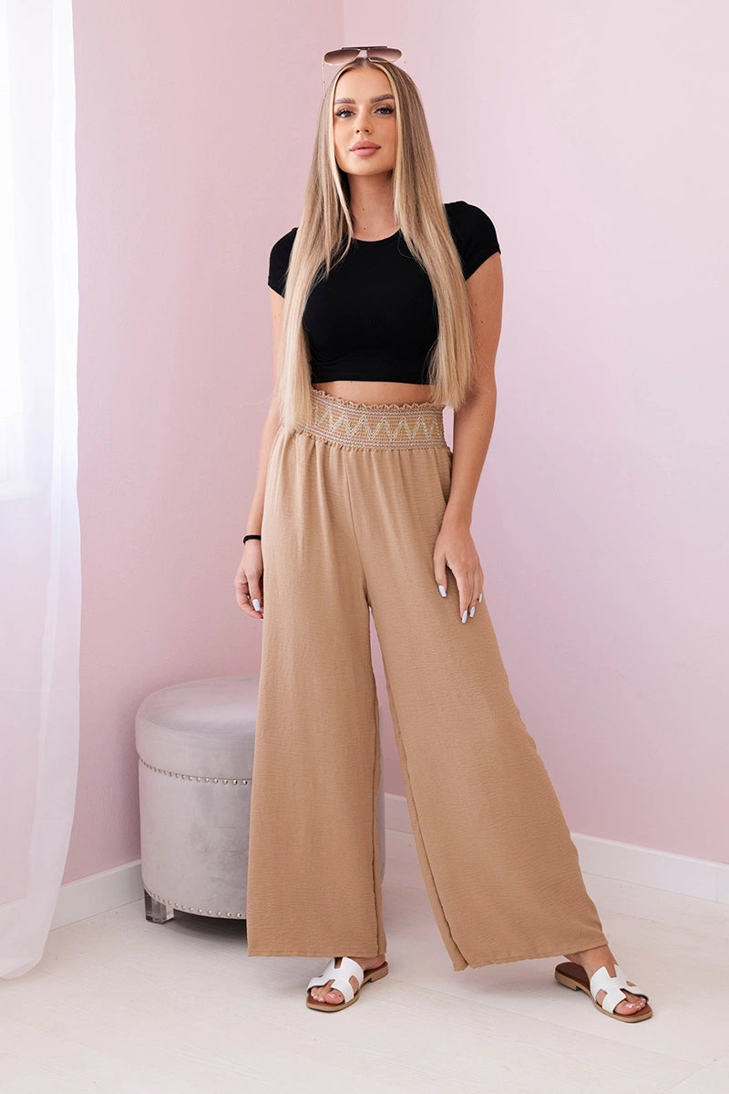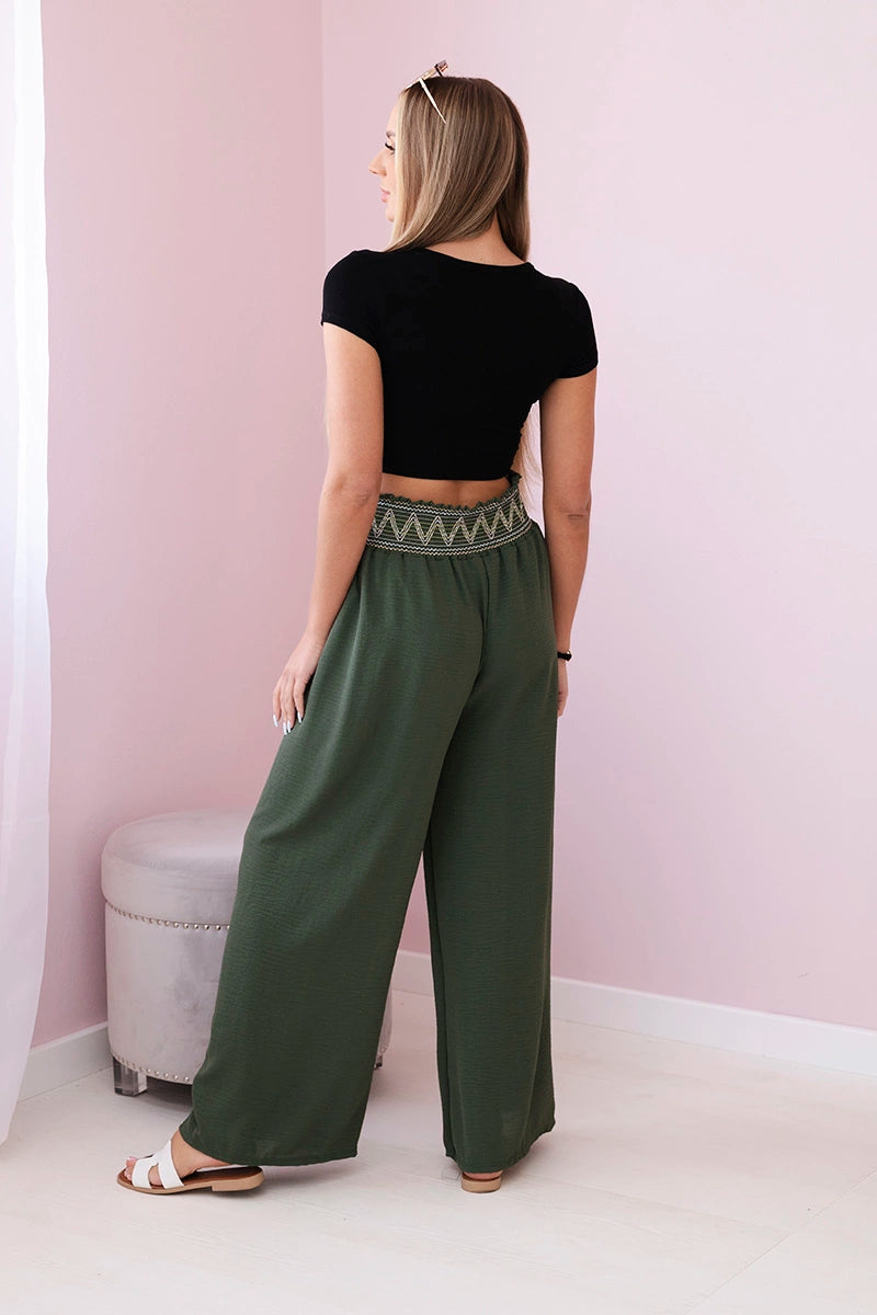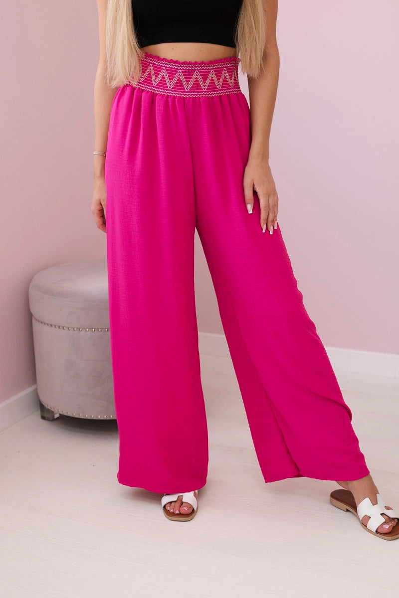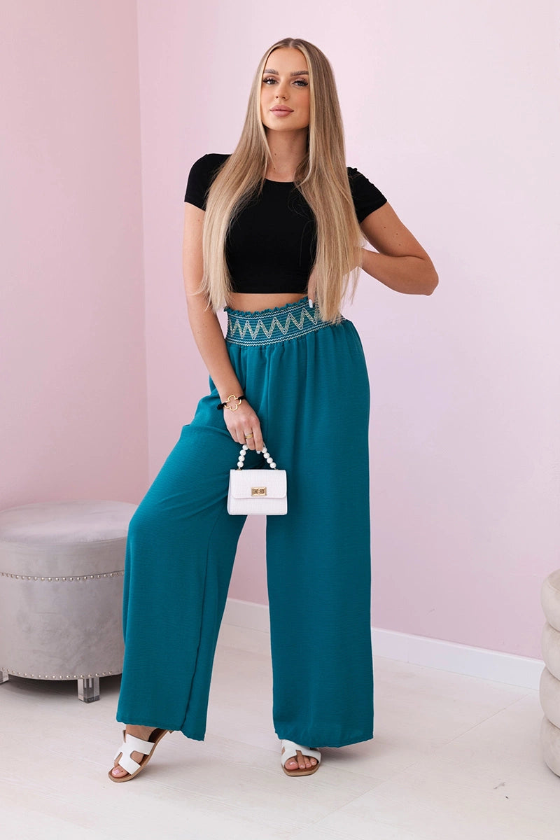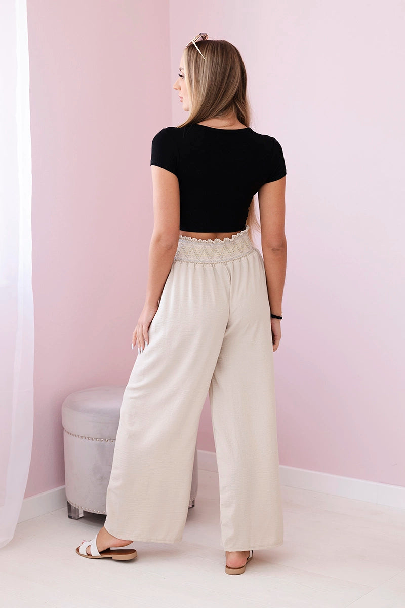 Панталоните с широк ластик на талията са практичен и удобен избор за ежедневието. Благодарение на широкия ластичен колан те осигуряват перфектно прилягане и комфорт при носене. Перфектен за релаксиращи разходки, домакинска работа или случайни срещи с приятели. Те перфектно съчетават удобството с модния стил, а широкият ластик придава оригиналност и лекота. Тези панталони бързо ще се превърнат в любим артикул в гардероба ви, позволявайки ви да се наслаждавате на комфорт през целия ден. Размерът е универсален и ще бъде подходящ за жени, носещи размер S, M или L.