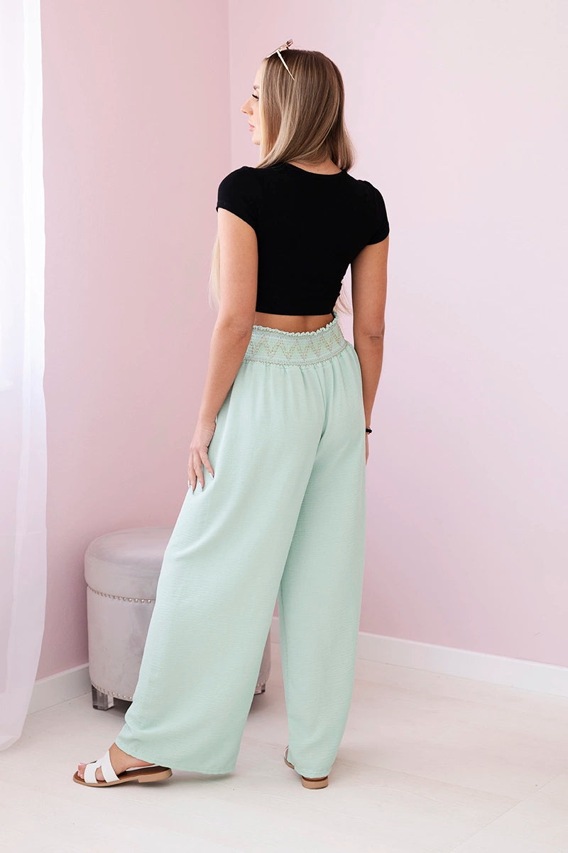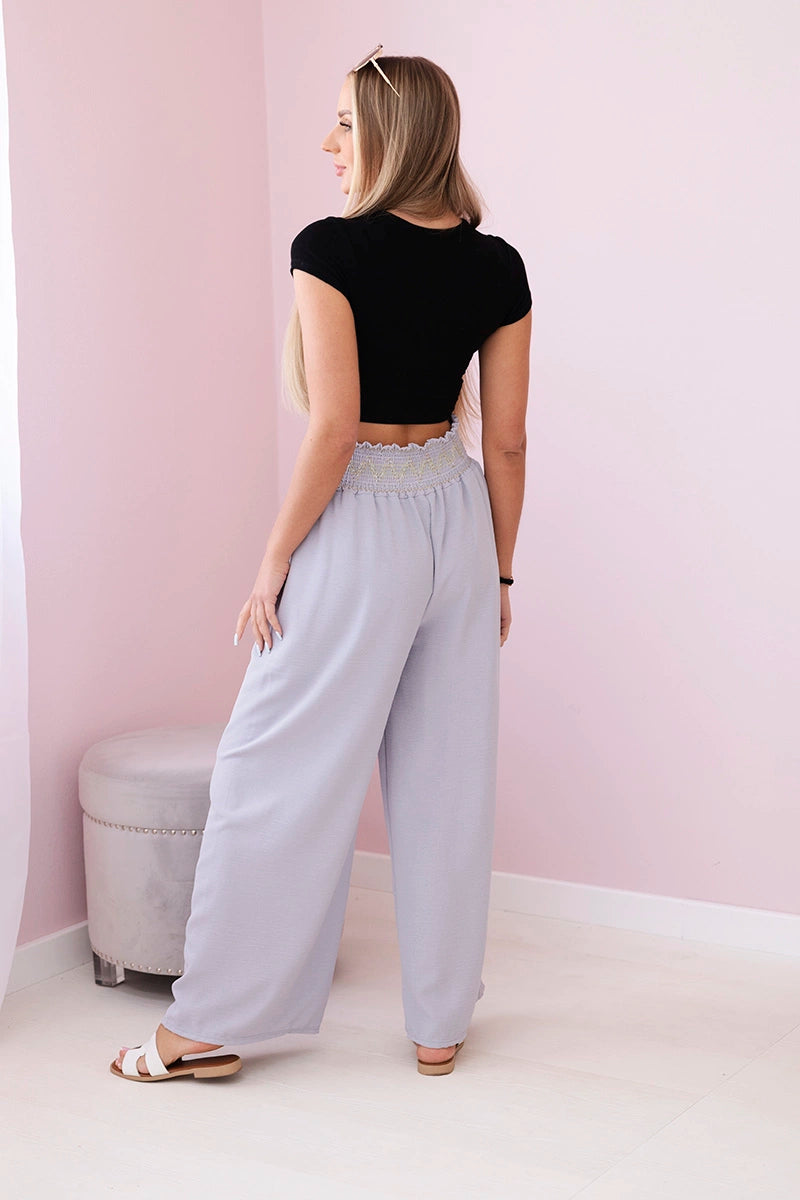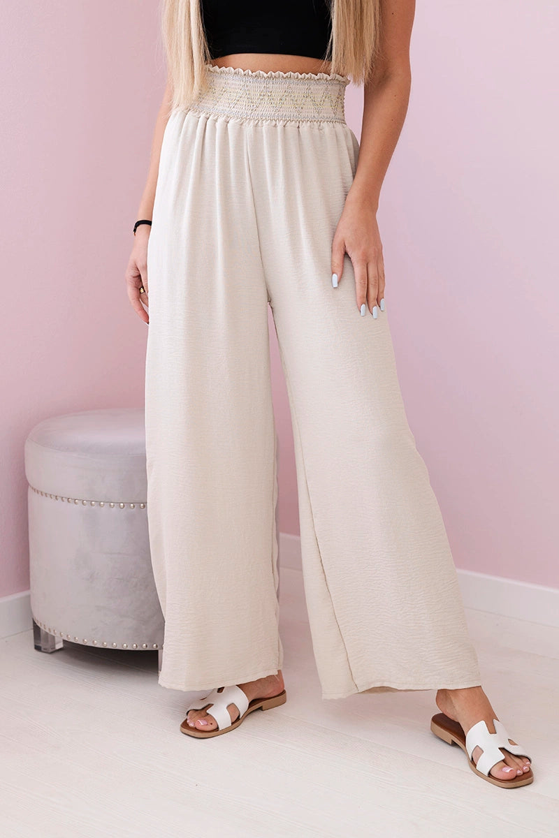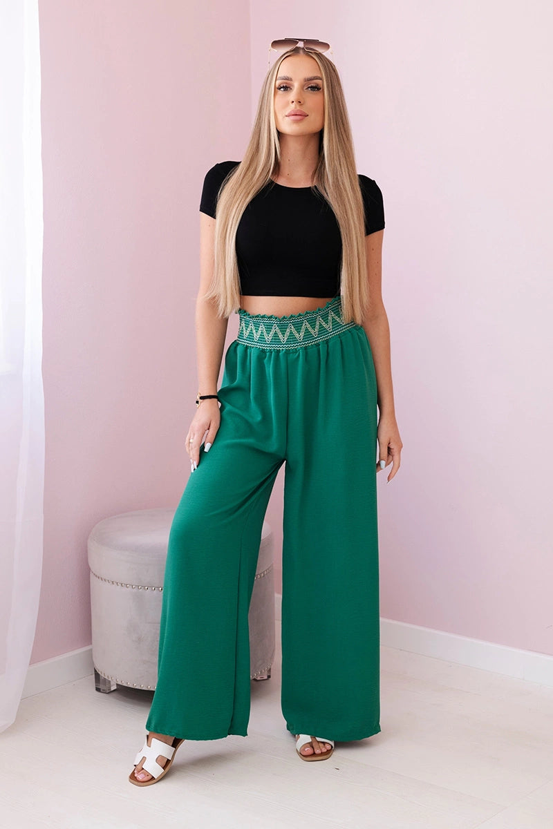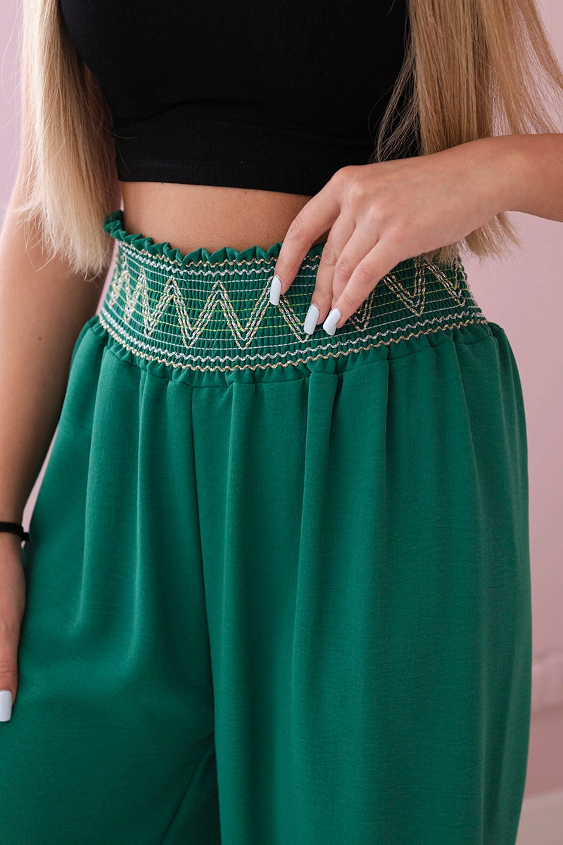 Панталоните с широк ластик на талията са практичен и удобен избор за ежедневието. Благодарение на широкия ластичен колан те осигуряват перфектно прилягане и комфорт при носене. Перфектен за релаксиращи разходки, домакинска работа или случайни срещи с приятели. Те перфектно съчетават удобството с модния стил, а широкият ластик придава оригиналност и лекота. Тези панталони бързо ще се превърнат в любим артикул в гардероба ви, позволявайки ви да се наслаждавате на комфорт през целия ден. Размерът е универсален и ще бъде подходящ за жени, носещи размер S, M или L.