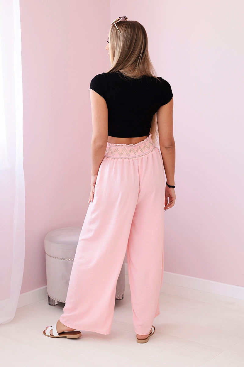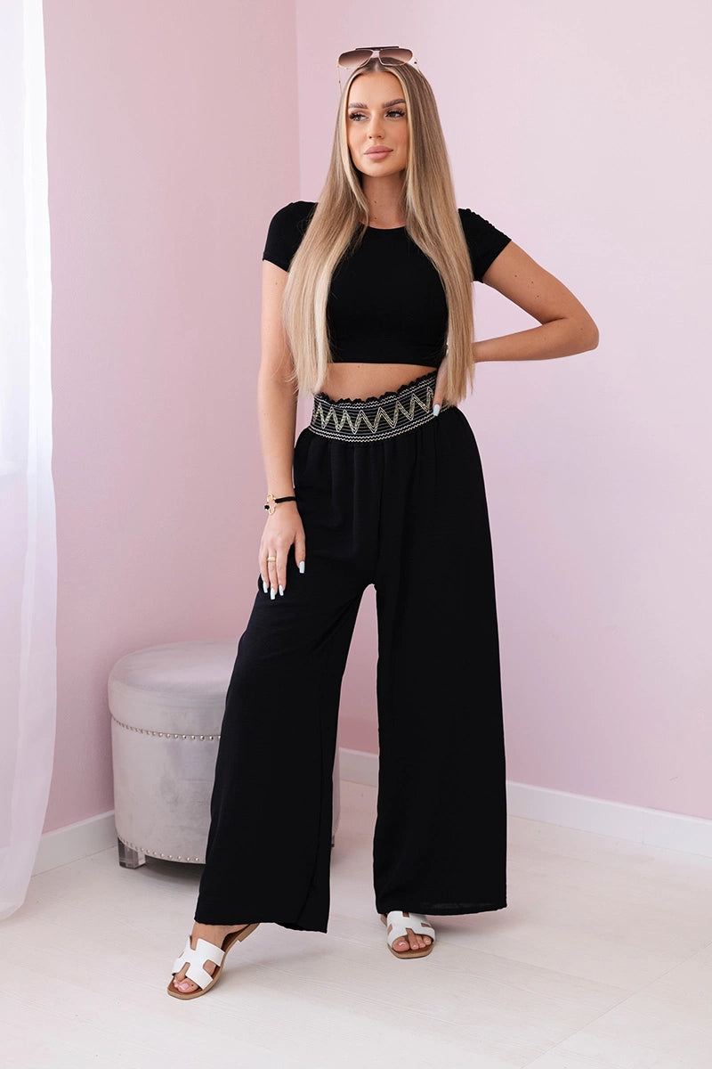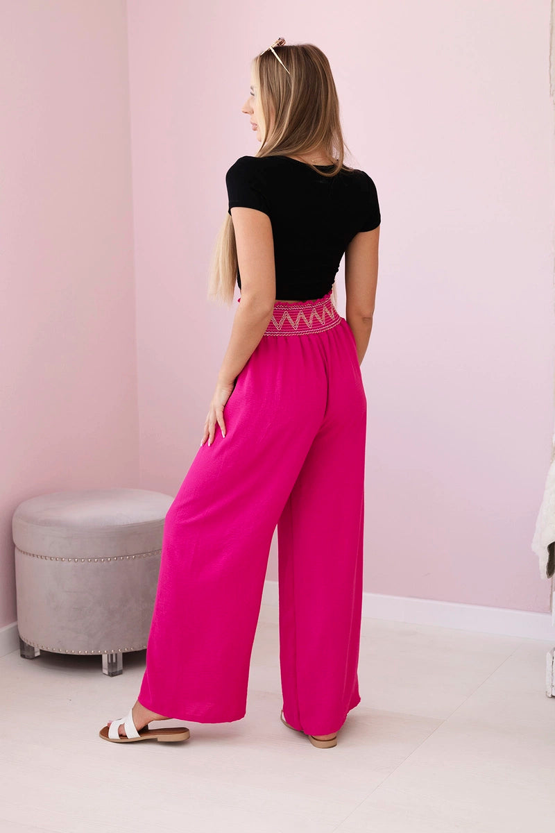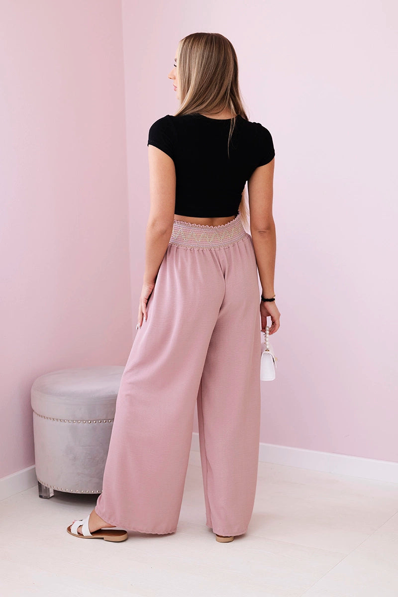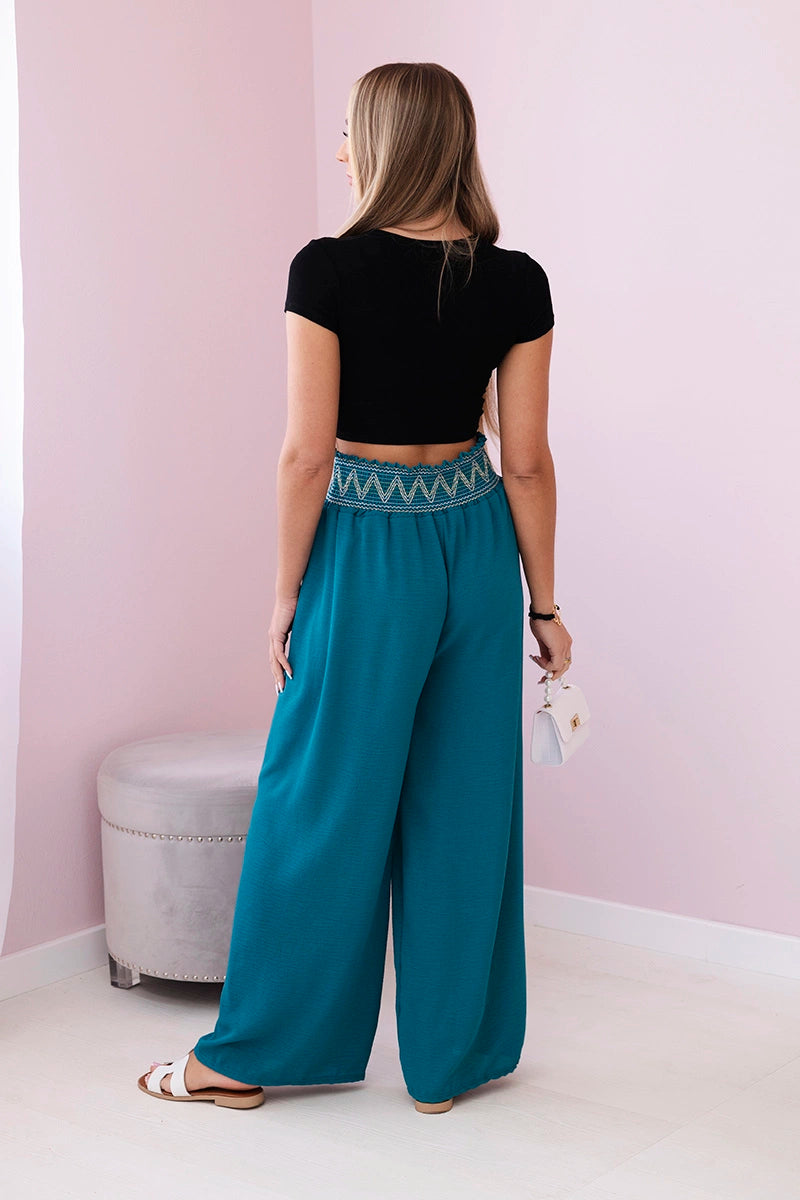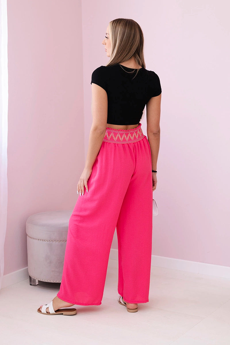 Панталоните с широк ластик на талията са практичен и удобен избор за ежедневието. Благодарение на широкия ластичен колан те осигуряват перфектно прилягане и комфорт при носене. Перфектен за релаксиращи разходки, домакинска работа или случайни срещи с приятели. Те перфектно съчетават удобството с модния стил, а широкият ластик придава оригиналност и лекота. Тези панталони бързо ще се превърнат в любим артикул в гардероба ви, позволявайки ви да се наслаждавате на комфорт през целия ден. Размерът е универсален и ще бъде подходящ за жени, носещи размер S, M или L.