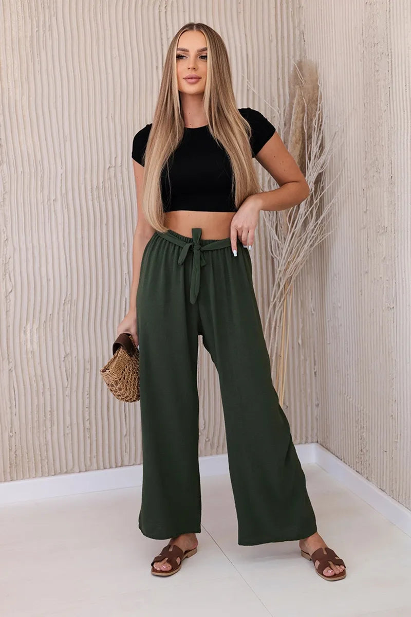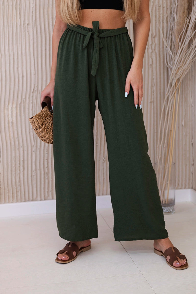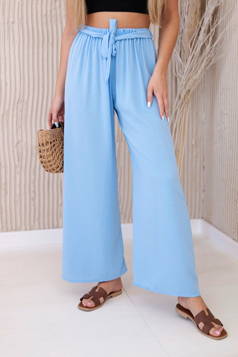 Панталоните с широки крачоли и връзка на талията са модерен и удобен избор за много поводи. Широките крачоли придават свобода и лекота на целия стайлинг, а връзката на талията ви позволява да коригирате панталона според индивидуалните си предпочитания. Те са идеални за летни разходки, ежедневни срещи или вечерни излизания, добавят модерен акцент към вашия стил и са удобни за носене. Тези панталони бързо ще се превърнат в незаменим елемент от вашия гардероб, съчетавайки функционалност и стил. Размерът е универсален и ще бъде подходящ за жени, носещи размер S, M или L.