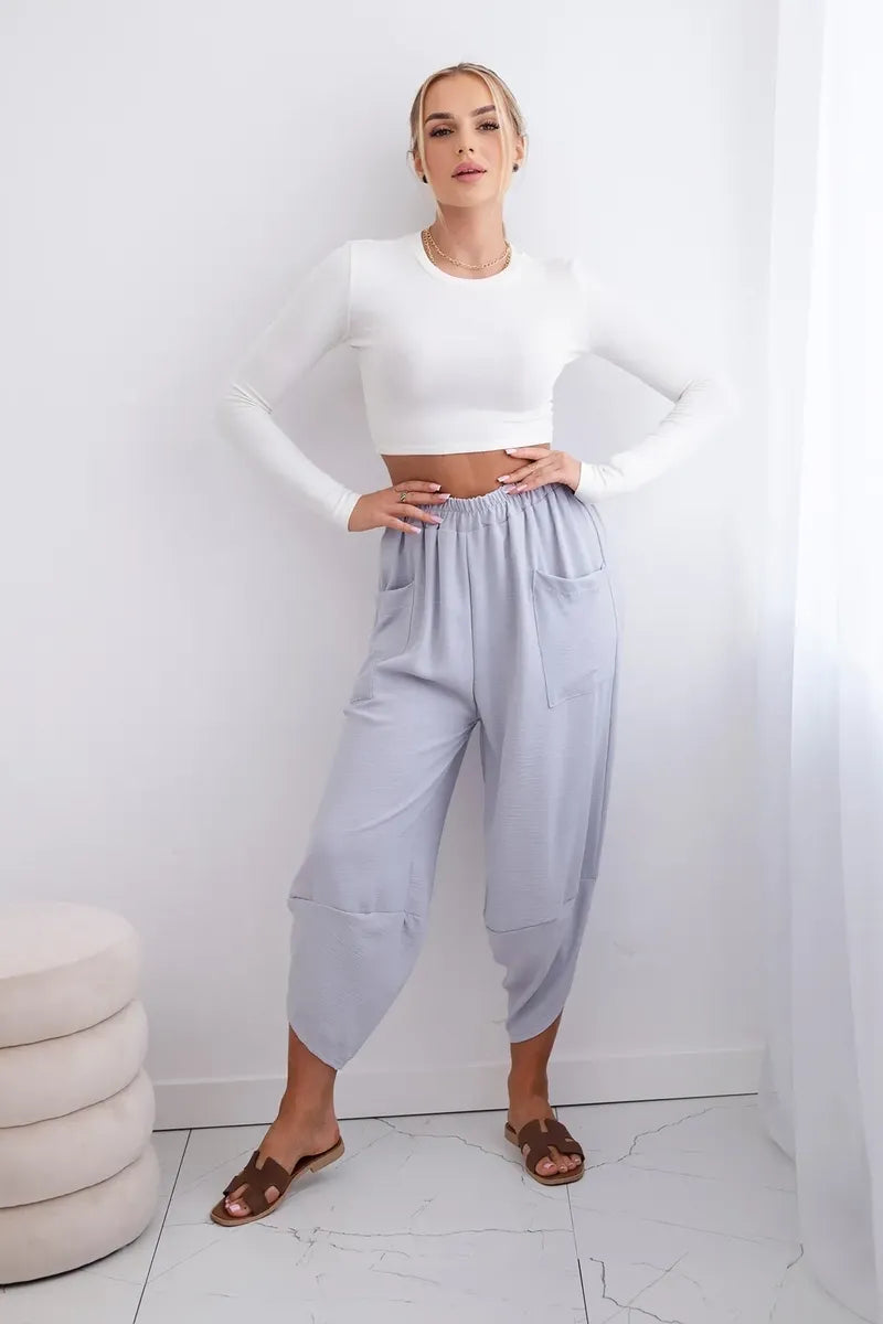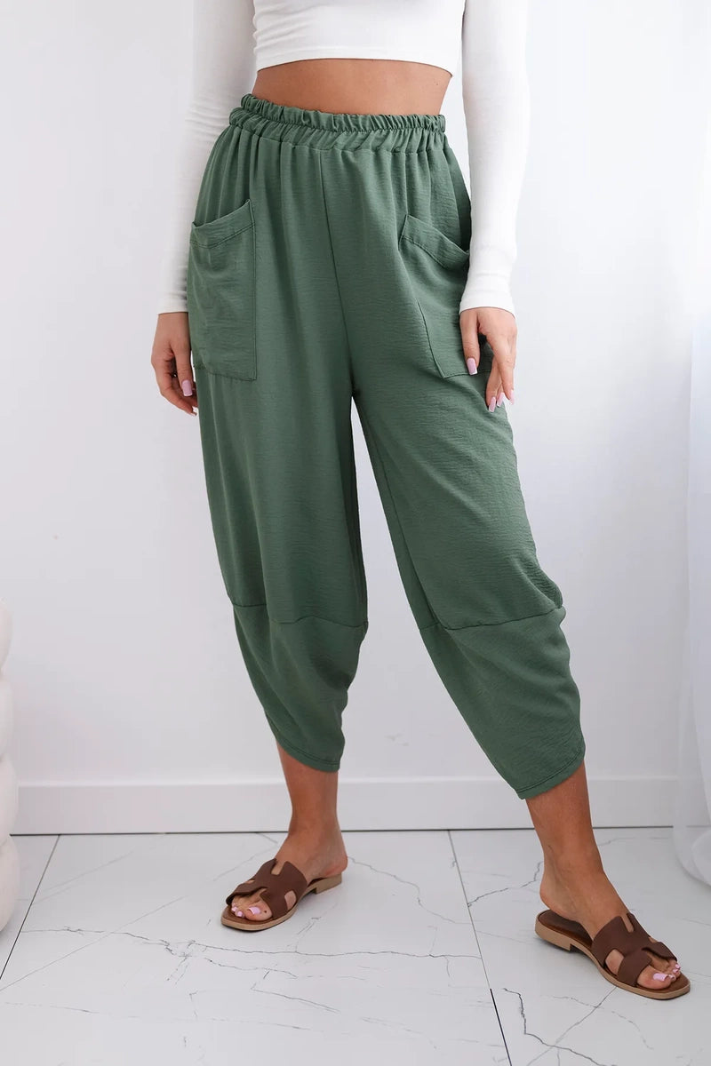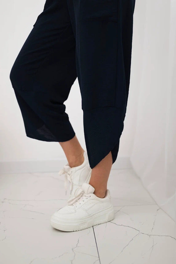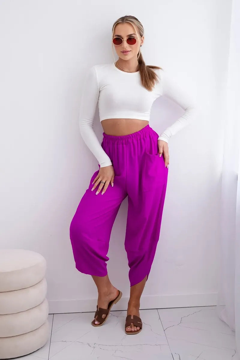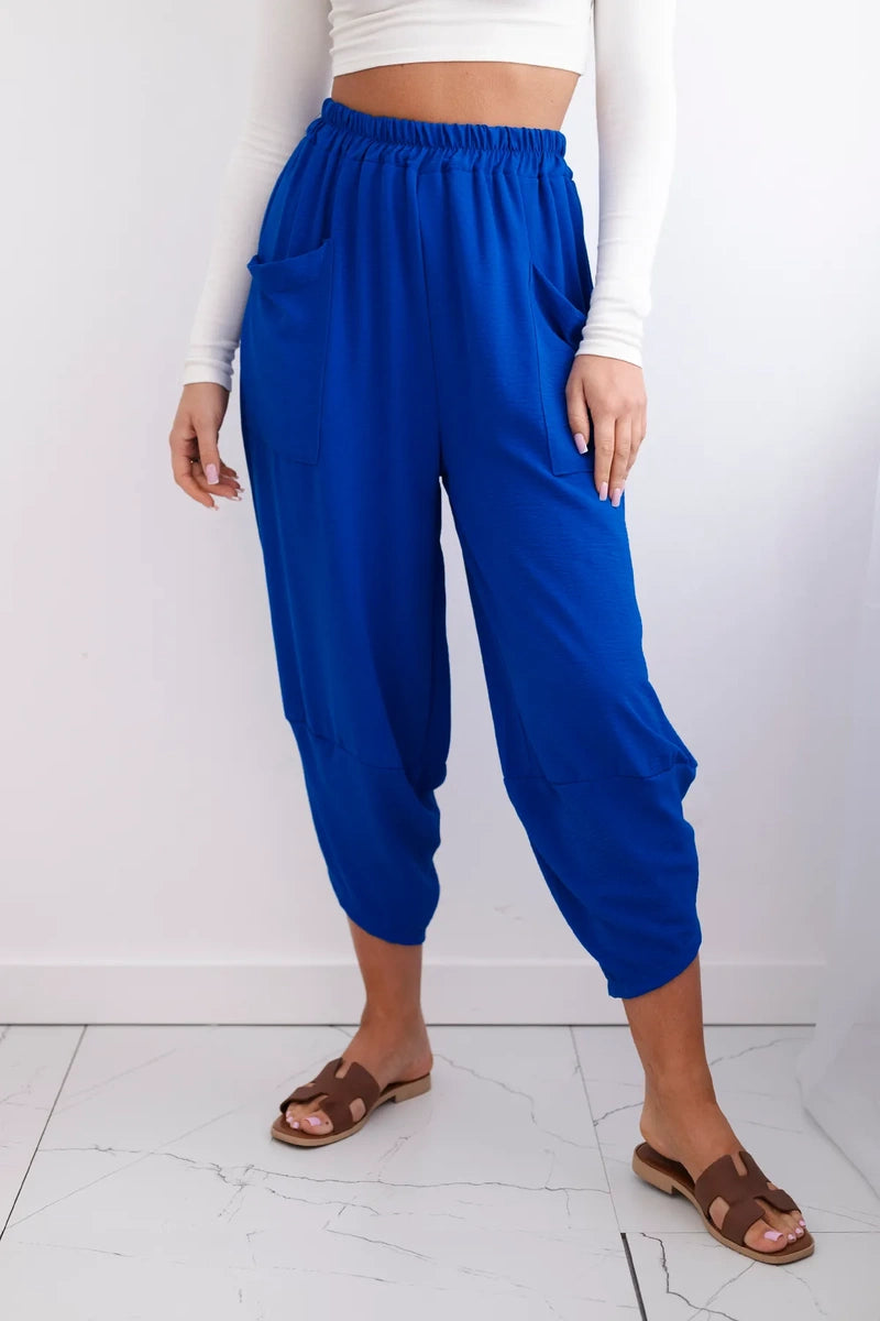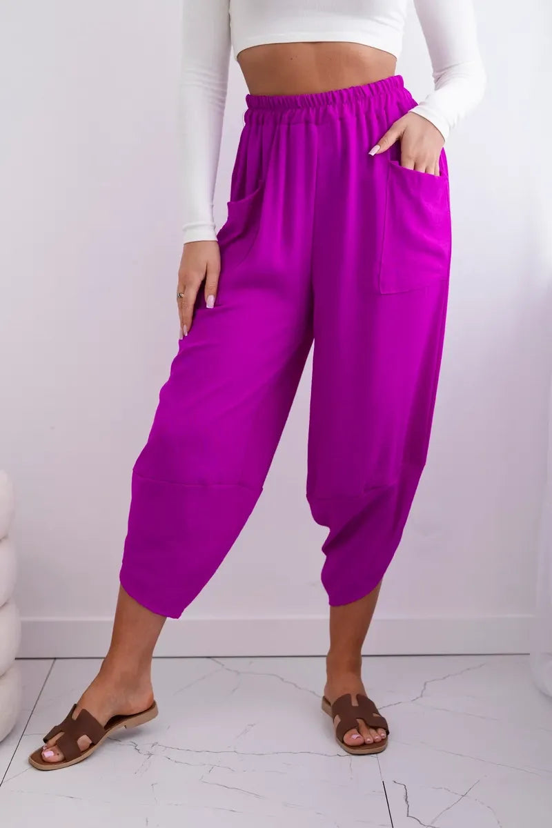 Широките панталони с джобове са практичен и стилен избор, съчетаващ комфорт и модерен дизайн. Изработени от висококачествени материали, тези панталони са удобни за носене през целия ден. Характерно за тях са широките крачоли, които придават свобода и лекота на целия стайлинг. Освен това джобовете, разположени в предната част на панталона, придават практичност и функционалност. Перфектни за различни поводи, от ежедневни излизания до по-официални срещи, тези панталони ще ви накарат да се чувствате комфортно и стилни в същото време. Размерът е универсален и ще бъде подходящ за жени, носещи размер S, M или L.