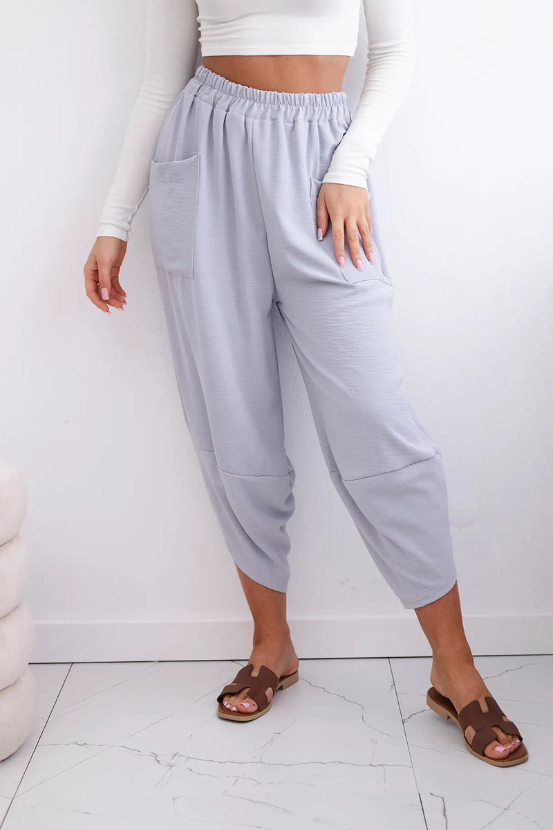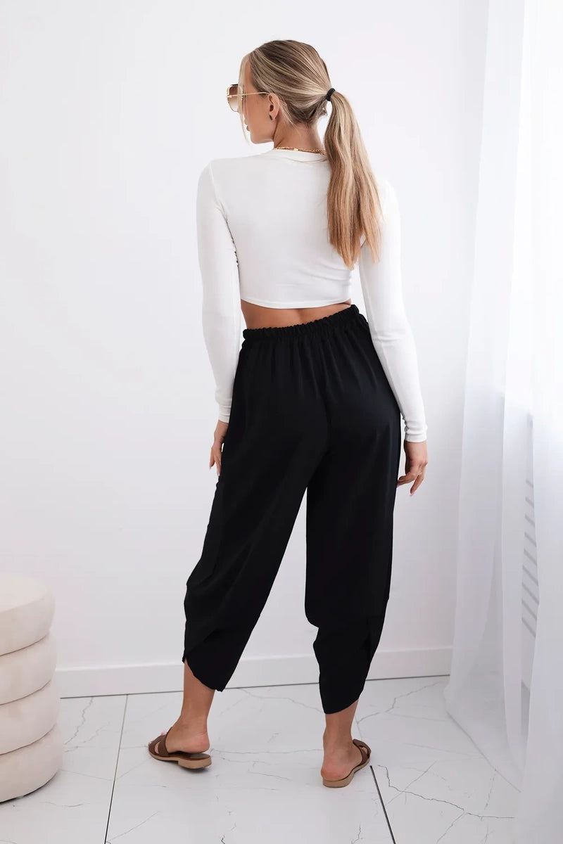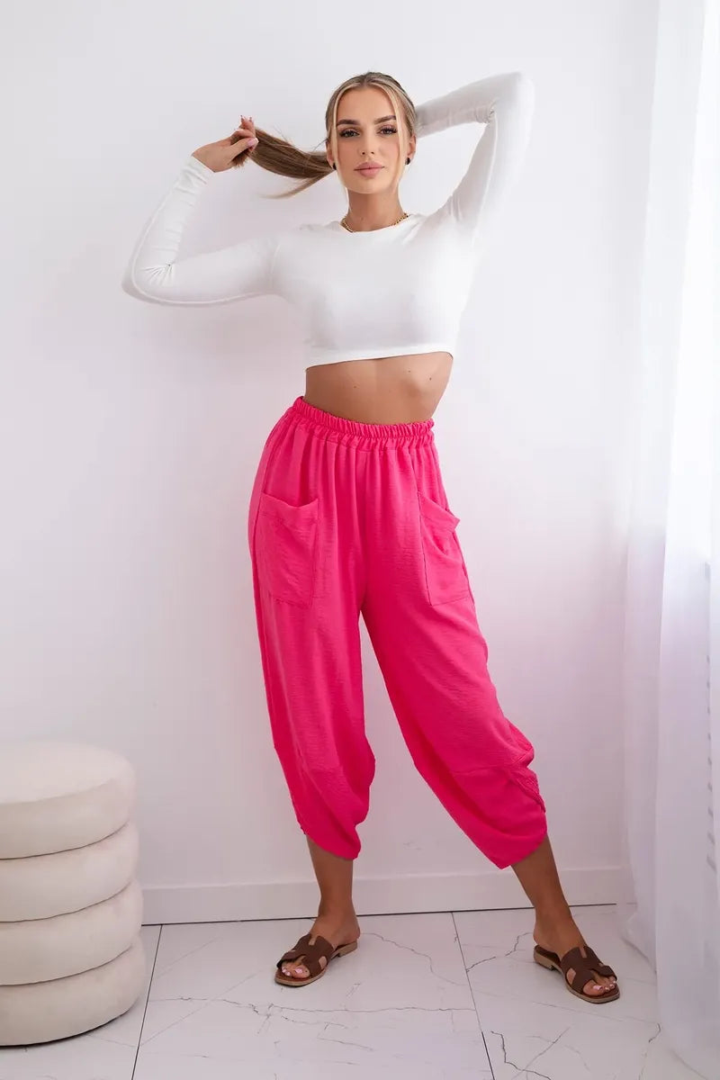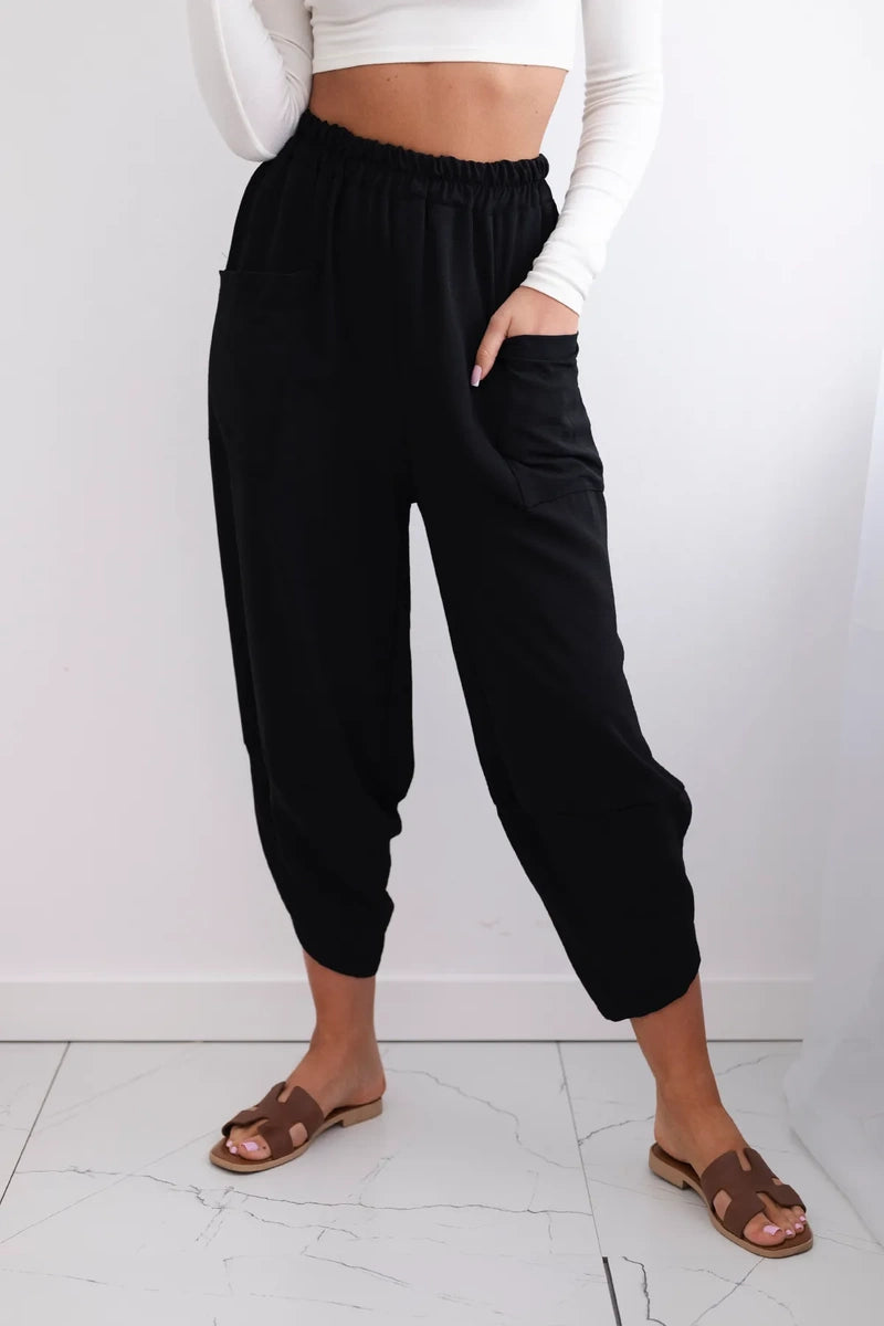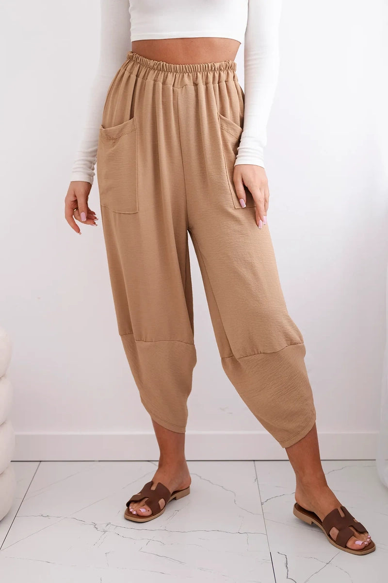 Широките панталони с джобове са практичен и стилен избор, съчетаващ комфорт и модерен дизайн. Изработени от висококачествени материали, тези панталони са удобни за носене през целия ден. Характерно за тях са широките крачоли, които придават свобода и лекота на целия стайлинг. Освен това джобовете, разположени в предната част на панталона, придават практичност и функционалност. Перфектни за различни поводи, от ежедневни излизания до по-официални срещи, тези панталони ще ви накарат да се чувствате комфортно и стилни в същото време. Размерът е универсален и ще бъде подходящ за жени, носещи размер S, M или L.