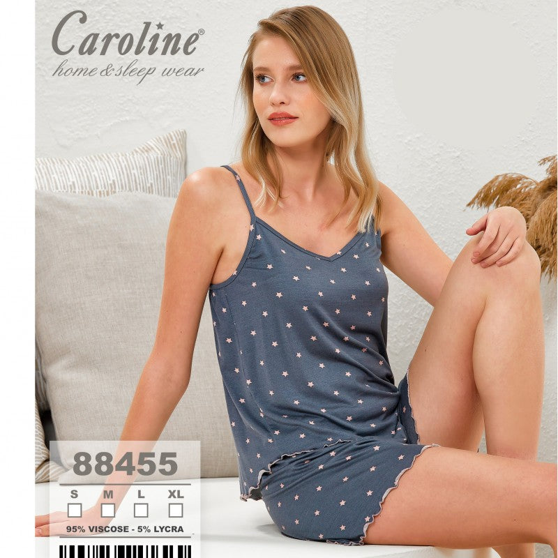 Пижама от потник с тънки презрамки и къси шорти 88455. Мека, фина, приятна за тялото материя-вискоза. Комплект от къси панталонки с ластик и корсаж с тънки, регулируеми презрамки.