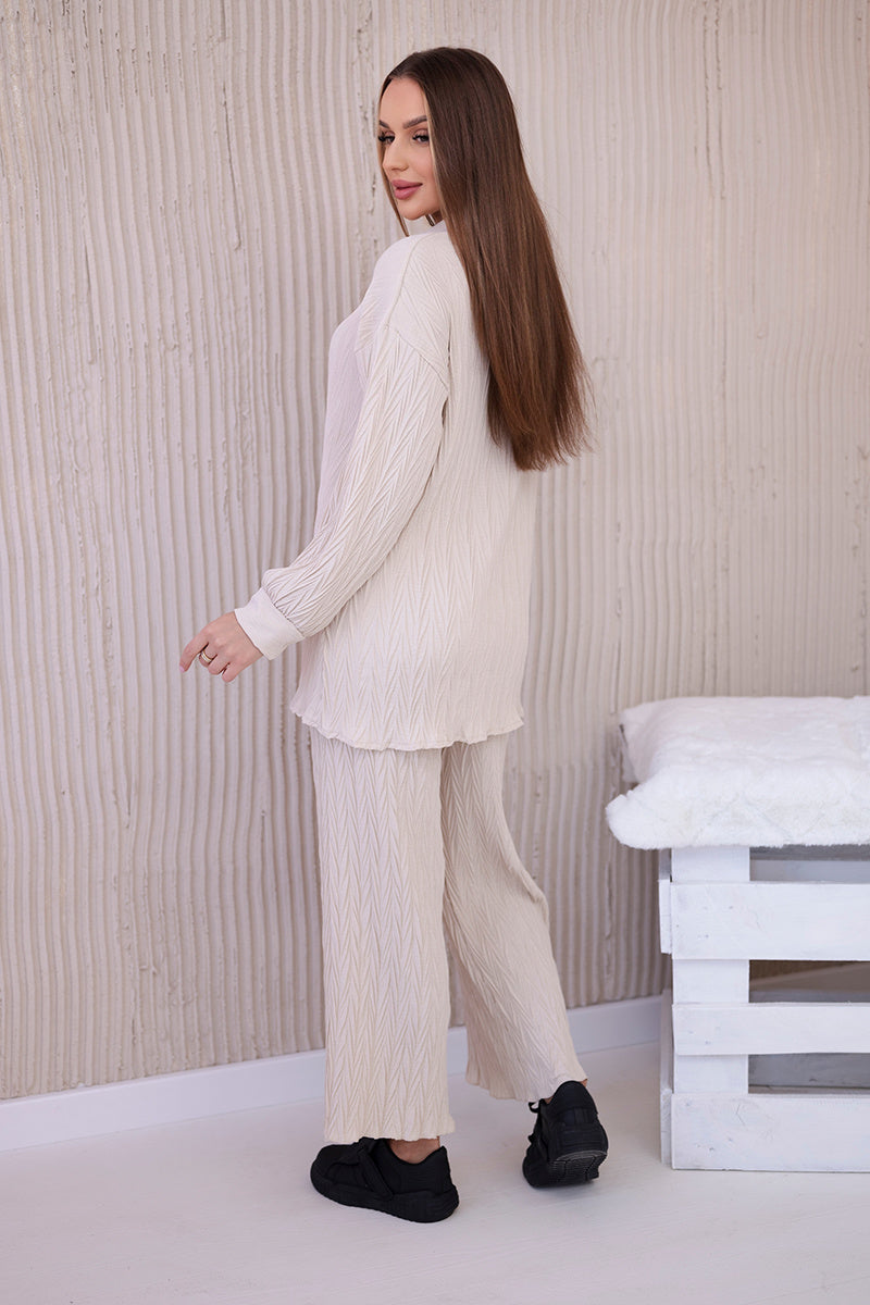 Плисиран комплект от две части, състоящ се от риза и панталон е елегантен и същевременно модерен тоалет. Риза, изработена от деликатен материал с плисирана текстура, добавя фина текстура. Класическата кройка на ризата с копчета и яка подчертава официалността и елегантността на целия комплект. Панталонът, също плисиран, създава едно цяло с ризата. Свободната им кройка ги прави удобни и в същото време елегантни. Плисирането им придава лекота и придава уникален характер. Еластичен колан или допълнителна връзка на талията може да бъде практичен елемент, който също подчертава талията. Този пълен плисиран комплект е идеален за специални поводи, бизнес срещи или елегантни излизания. Това е предложение за хора, които ценят изтънчения стил и искат да изглеждат елегантно, като същевременно поддържат известна степен на модерност. Размерът е универсален и става за жени, носещи размер S, M или L.