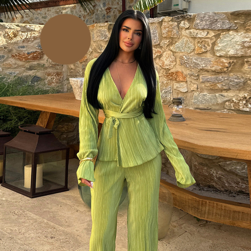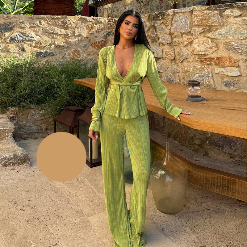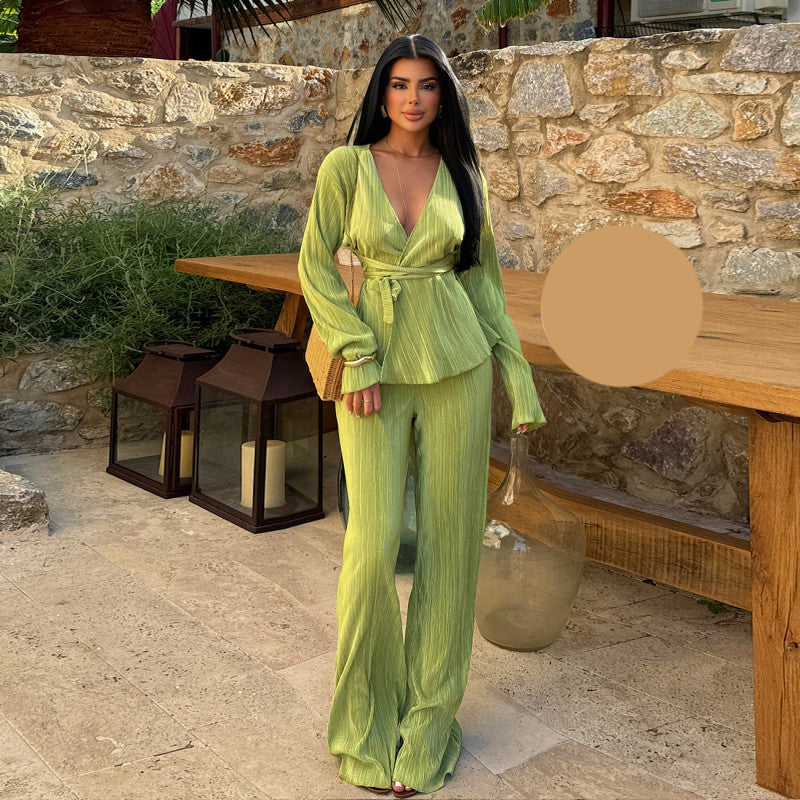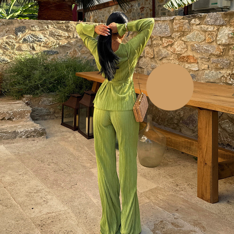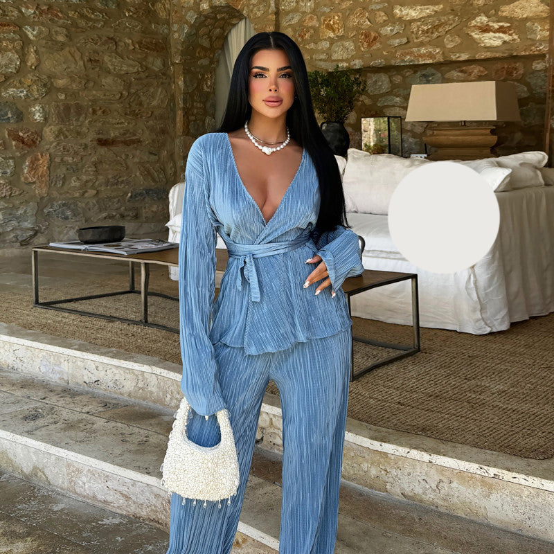 Плисиран летен комплект от блуза и панталон EO-1148. Идеалният избор за модерни жени, които искат да съчетаят стил и комфорт. Комплектът включва блуза тип “Прегърни ме” и дълъг панталон с висока талия, създавайки елегантен и нежен силует.