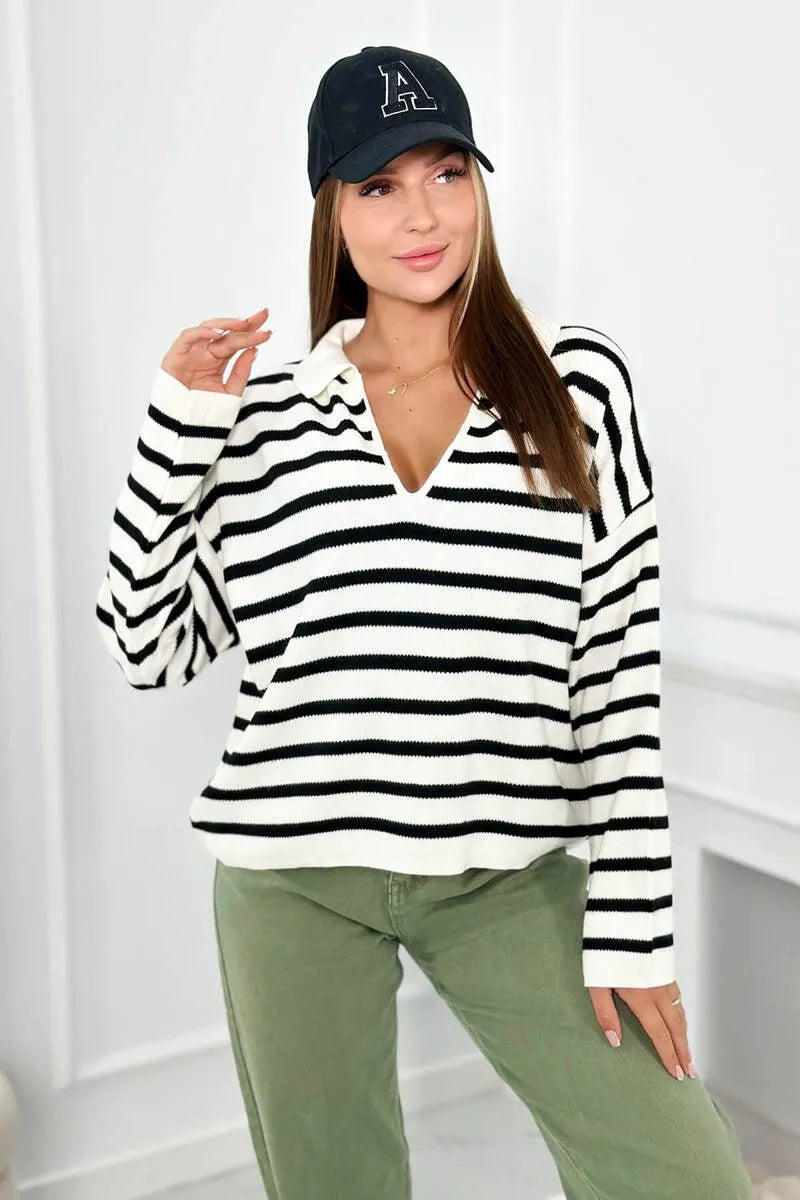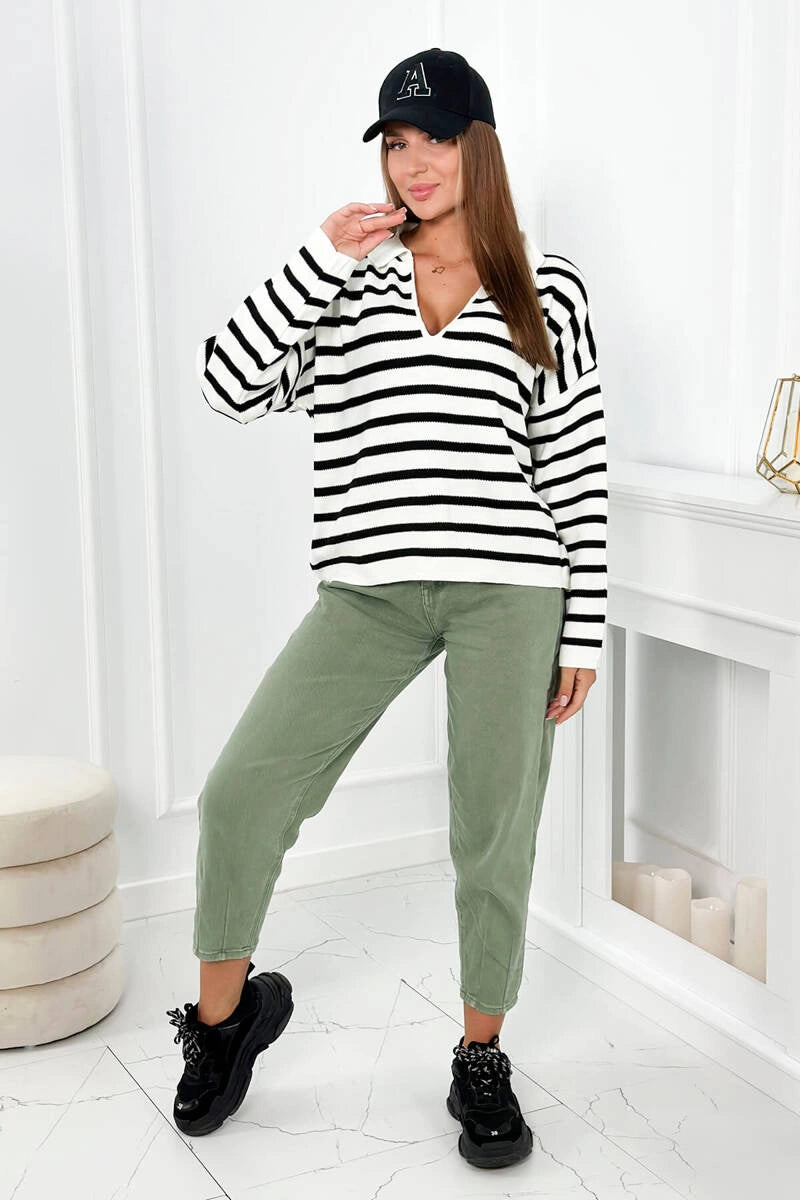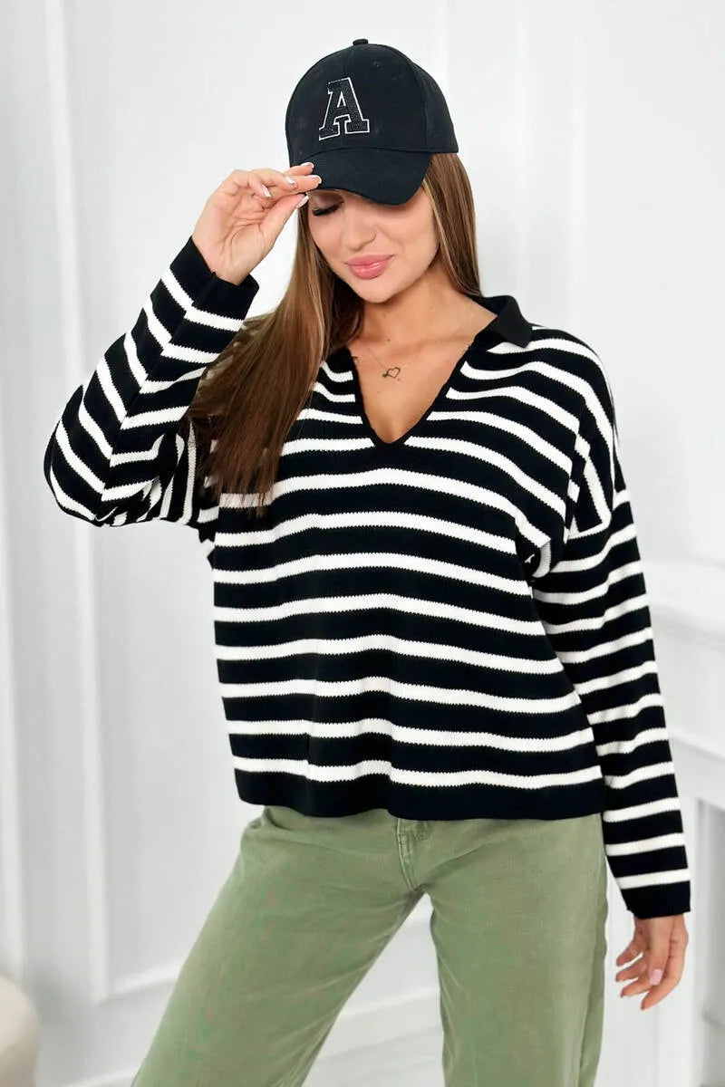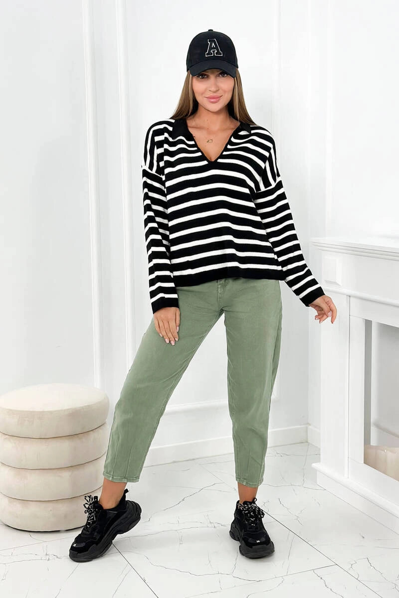 Раираният турски пуловер с яка и V-образно деколте е уникална дреха, която съчетава елегантност и небрежен стил. Неговият смел раиран модел добавя характер към турския пуловер и е идеален за различни поводи. Райето в съчетание с V-образното деколте създава оптически ефект, който издължава фигурата, което е изключително благоприятно за много хора. Яката на пуловера придава нотка елегантност и прави пуловера подходящ както за бизнес срещи, така и за по-неформални поводи. Раираният пуловер е и изключително удобен, благодарение на свободната си кройка, която не ограничава движенията. Той е перфектният избор за по-студените дни, когато искаме да ни е едновременно стилно и топло. Този пуловер е перфектен пример за дреха, която съчетава мода и комфорт, което го прави достойна инвестиция за всеки гардероб. Независимо дали го избирате за работа, за среща с приятели или за вечерна разходка, със сигурност ще го добавите към колекцията си. Размерът е универсален и ще бъде подходящ за жени с размери M, L, XL.