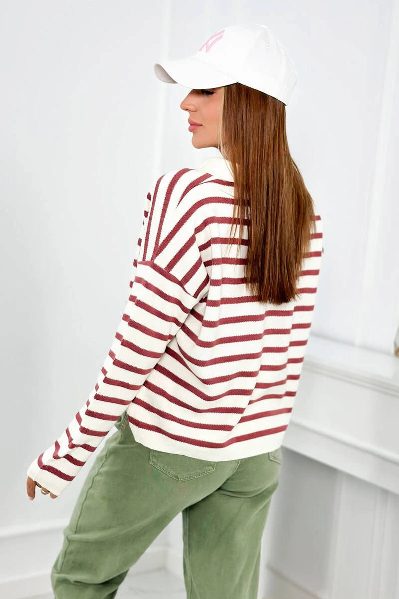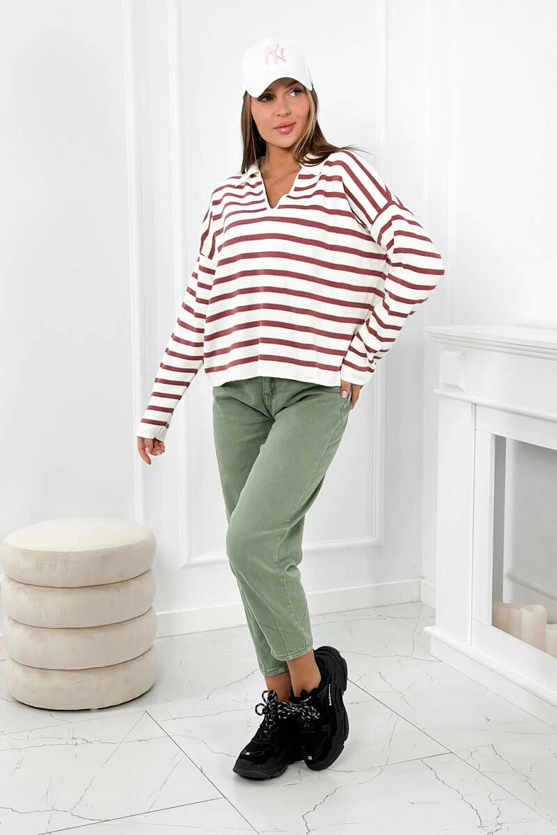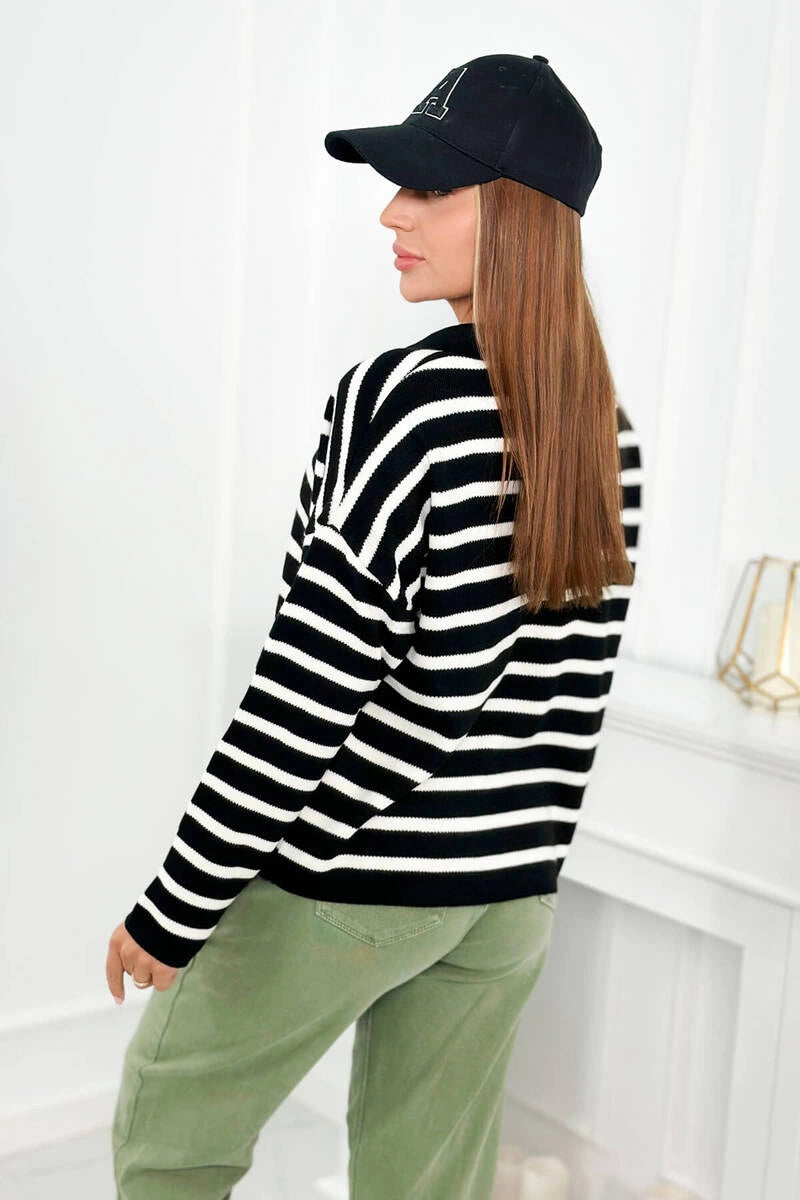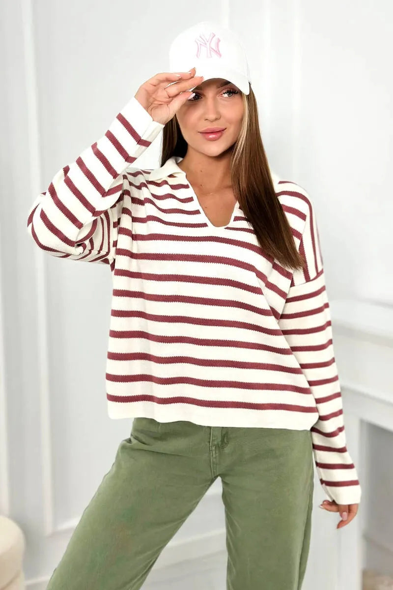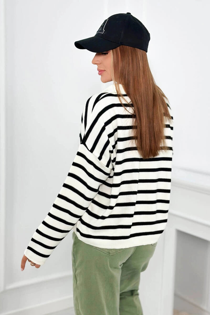 Раираният турски пуловер с яка и V-образно деколте е уникална дреха, която съчетава елегантност и небрежен стил. Неговият смел раиран модел добавя характер към турския пуловер и е идеален за различни поводи. Райето в съчетание с V-образното деколте създава оптически ефект, който издължава фигурата, което е изключително благоприятно за много хора. Яката на пуловера придава нотка елегантност и прави пуловера подходящ както за бизнес срещи, така и за по-неформални поводи. Раираният пуловер е и изключително удобен, благодарение на свободната си кройка, която не ограничава движенията. Той е перфектният избор за по-студените дни, когато искаме да ни е едновременно стилно и топло. Този пуловер е перфектен пример за дреха, която съчетава мода и комфорт, което го прави достойна инвестиция за всеки гардероб. Независимо дали го избирате за работа, за среща с приятели или за вечерна разходка, със сигурност ще го добавите към колекцията си. Размерът е универсален и ще бъде подходящ за жени с размери M, L, XL.