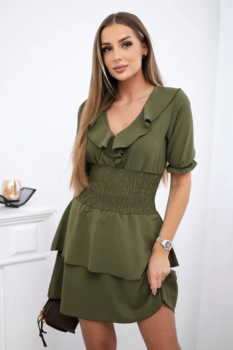 Представяме ви модна рокля. Рокля с талия с V-образно деколте и волани. Роклята е изработена от висококачествен материал. Перфектен за летните дни. Размерът е универсален и ще бъде подходящ за дами, носещи размери S, M или L.
